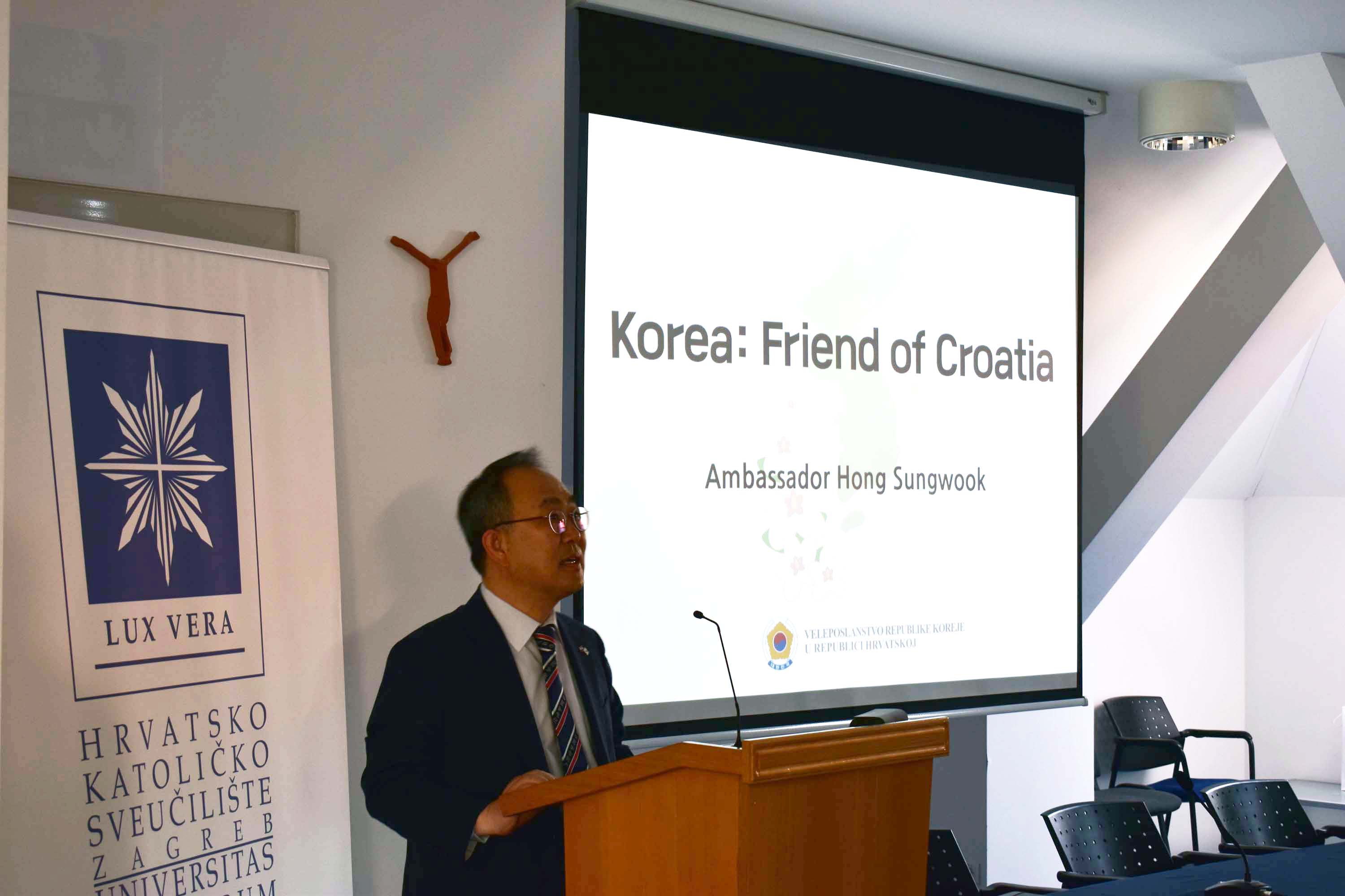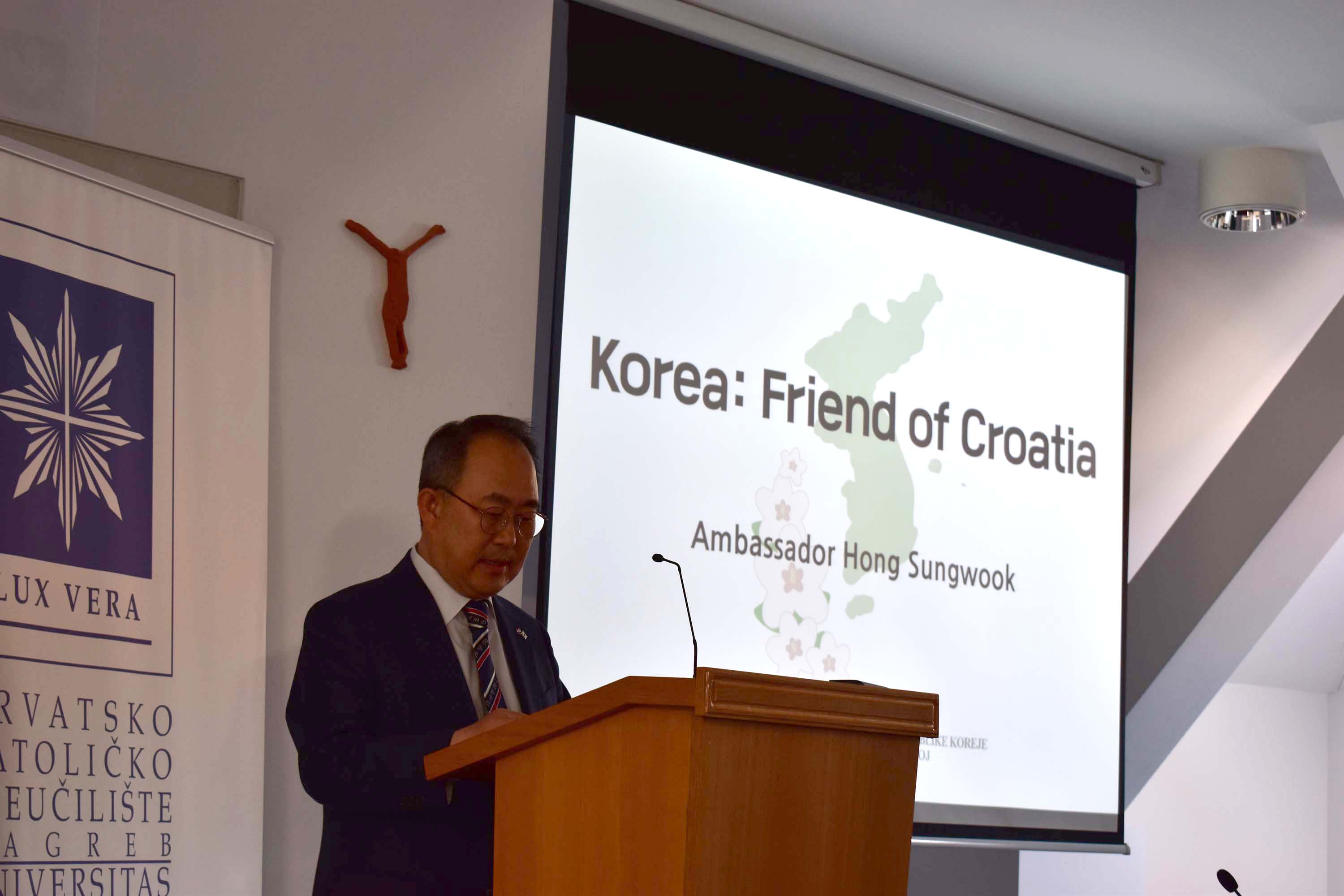 Nj. E. g. Hong Sungwook u svojem predavanju nadovezao se na rektorove misli "poveznica" Hrvatske i Koreje, istaknuvši da je Hrvatska za Korejce postala "must see" turistička destinacija koja ih oduševljava svojom prirodnom ljepotom. Uz to, popularnost korejskih brendova prisutna je u Hrvatskoj, a sve je popularniji i tzv. k-pop. Nj. E. Hong osvrnuo se i na rad veleposlanstva u Hrvatskoj - kroz brojne kulturne aktivnosti Koreja sudjeluje u hrvatskom životu, u suradnji s Ladom, ministarstvima i Vladom, u organizaciji važnih ekonomskih konferencija te programa uključenja lokalne zajednice. Njegova ekselencija Hong pozvao je studente da se prijave na GSK program namijenjen studentima diplomskih i doktorskih studija te da pokušaju neko vrijeme studirati u ovoj naprednoj azijskoj zemlji.