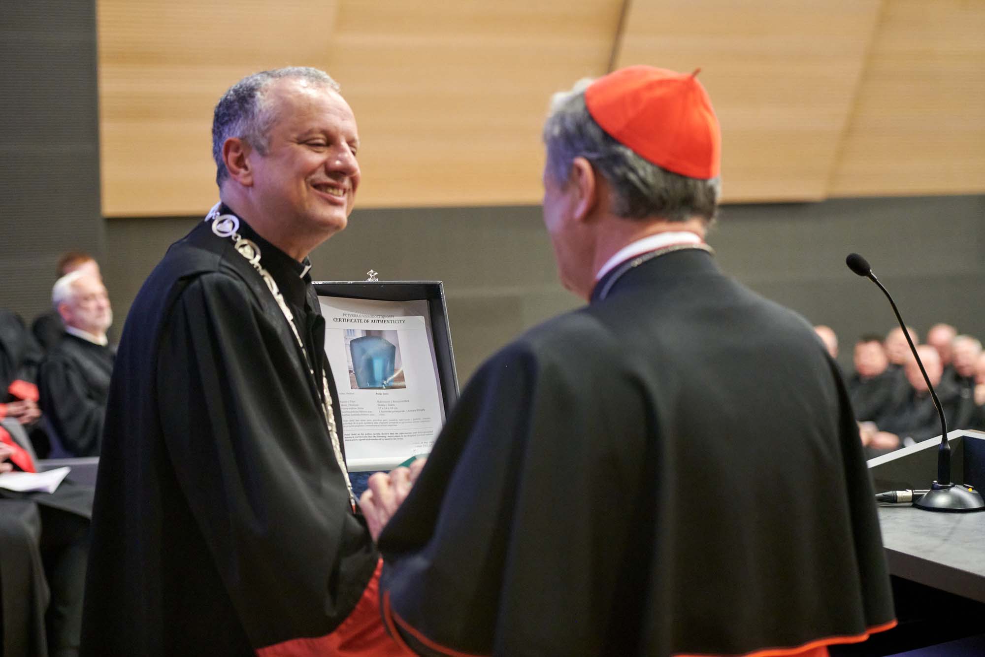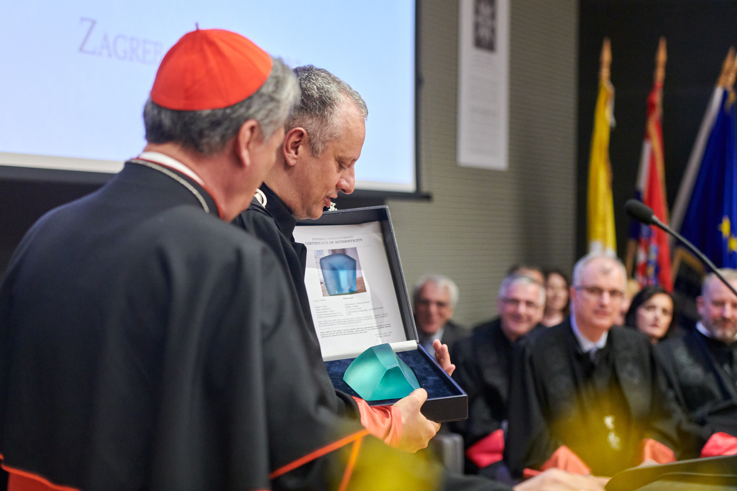 Rektor Hrvatskog katoličkog sveučilišta prof. dr. sc. Željko Tanjić nakon predavanja kardinala Grecha još jednom mu je uputio zahvalu te uručio skulpturu Uskrsnuće, rad akademskog kipara Petra Dolića.