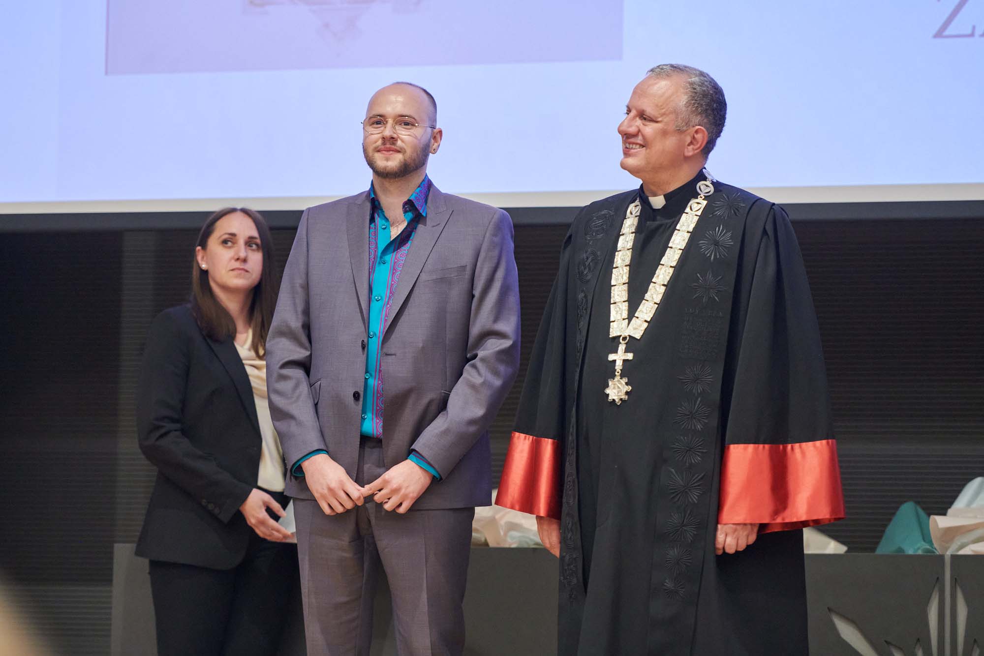Središnji svečani akademski čin u Velikoj dvorani HKS-a u Zagrebu, tijekom kojega su dodijeljene Rektorove nagrade studentima i zaposlenicima započeo je molitvom koju je predvodio vlč. Branimir Jagodić.