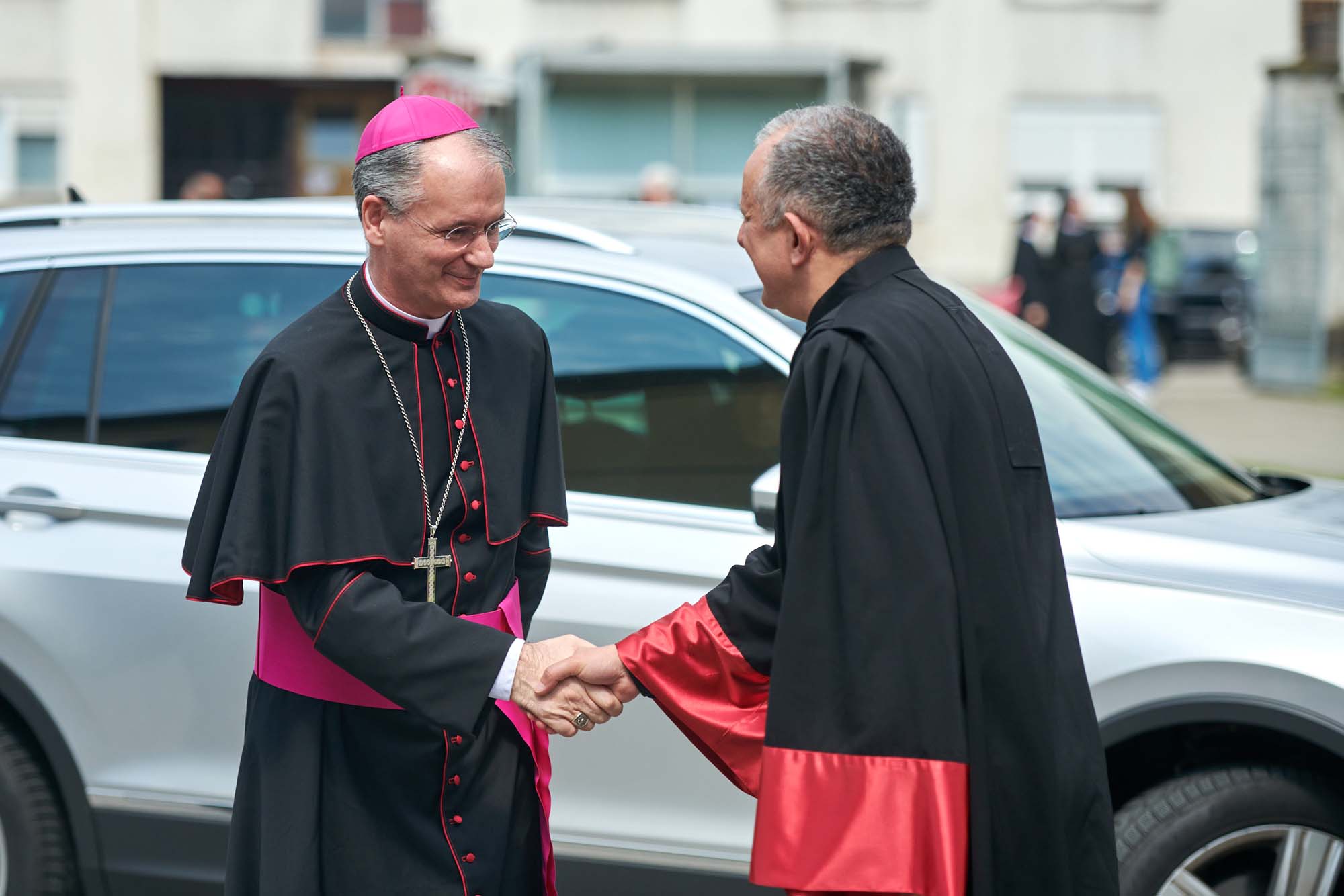 Zahvalni smo i za dar novoga Velikoga kancelara i našega pastira, nadbiskupa Dražena, kojega s posebnim poštovanjem danas pozdravljam na njegovom i našem Sveučilištu uvjeren da će Duh Gospodnji, koji nam Vas je darovao kao novoga pastira, učiniti našu suradnju plodonosnom i blagoslovljenom na dobro Crkve zagrebačke i našega Sveučilišta. Dobro nam došli, znajte da vas pratimo svojom molitvom i da Vam Sveučilište želi biti pomoć u Vašem pastirskom djelovanju“, rekao je rektor te je istaknuo kako i HKS traži načine kako biti dio sinodalnog hoda Crkve i kako djelovati sinodalno, što je bila i tema Lectio magistralis koju je održao uzoriti gospodin Mario Grech, generalni tajnik Biskupske sinode.