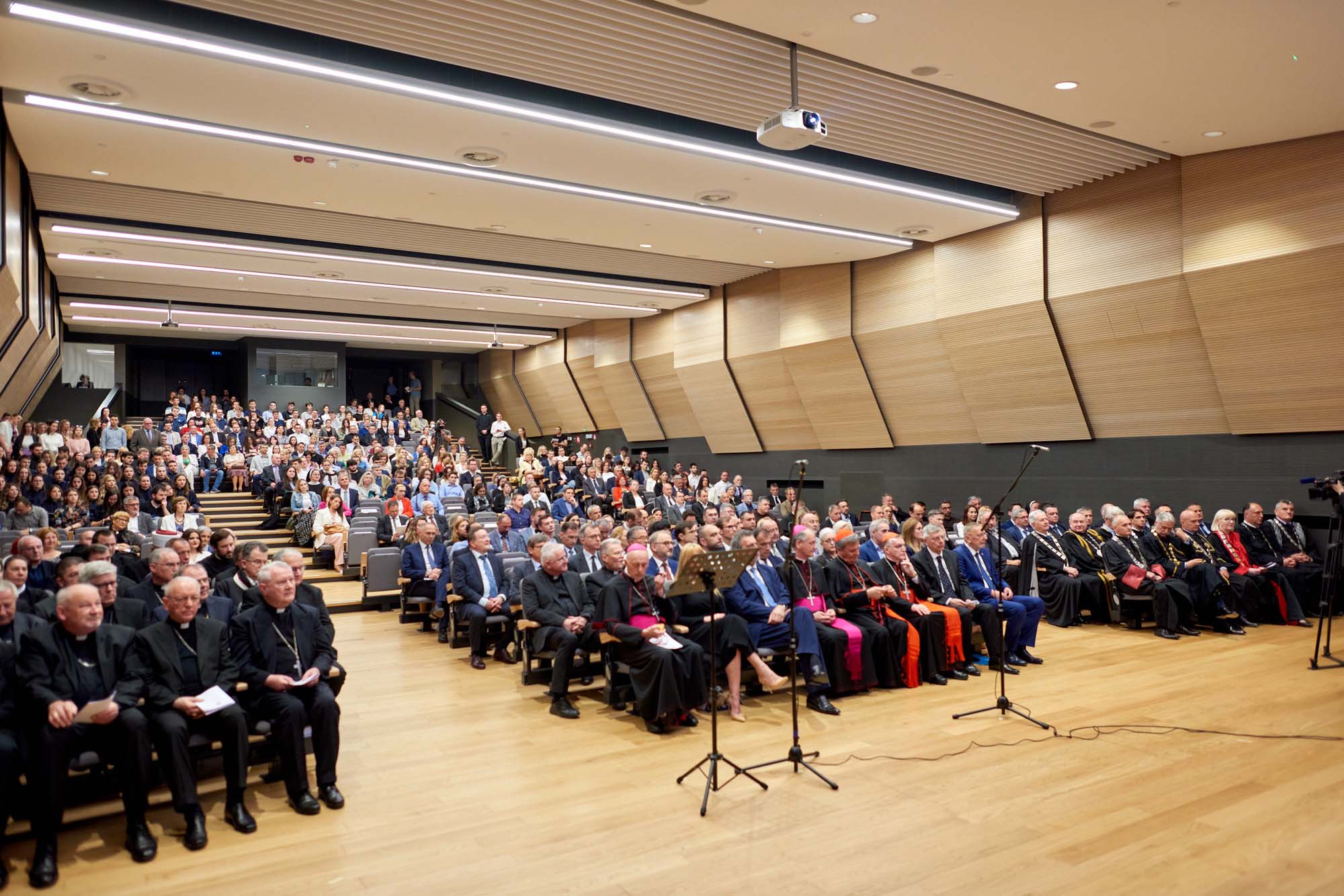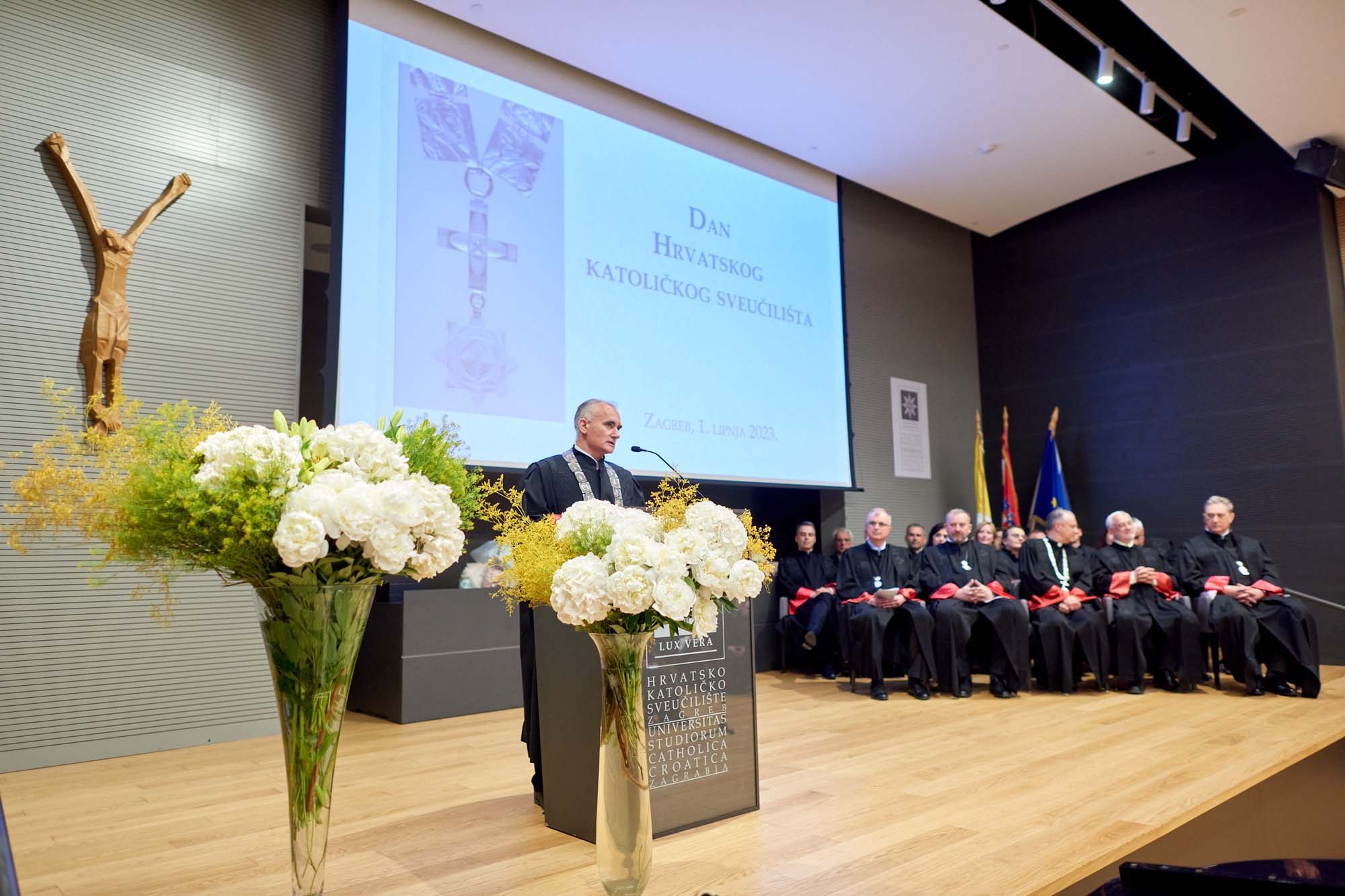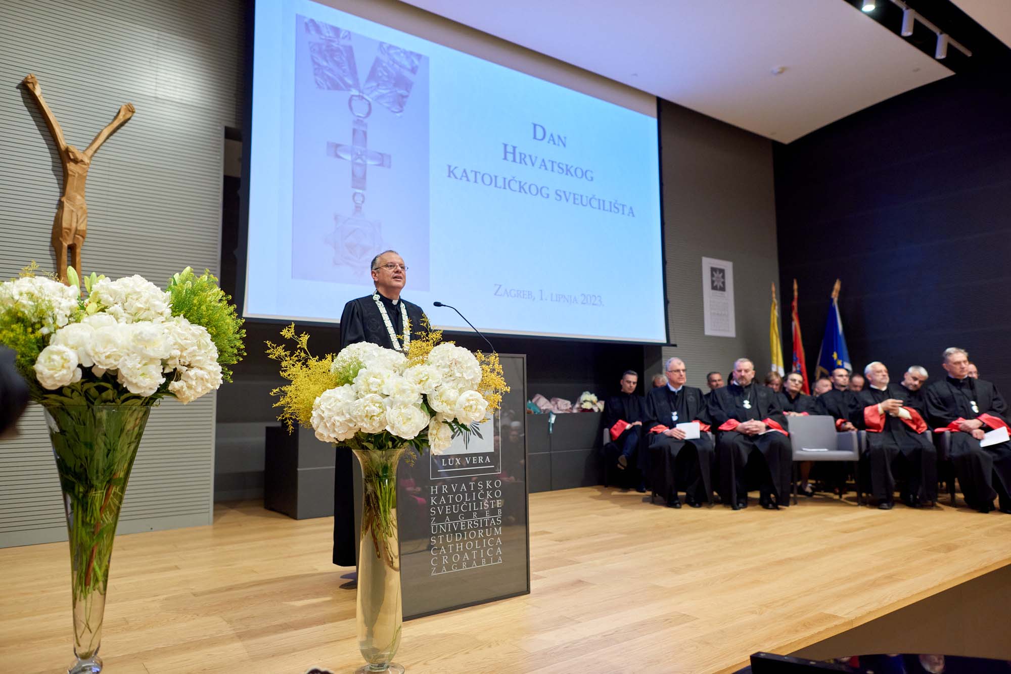 Veliki kancelar hrvatskog katoličkog sveučilišta mons. Dražen Kutleša, zagrebački nadbiskup, u svojem je govoru naglasio središnju ulogu studenata u sveučilišnom životu, a zahvalio je i svome prethodniku prisutnome kardinalu Josipu Bozaniću koji je vizionarski utemeljio HKS. „Sveučilište je zapravo, kao što i samo ime kaže, mjesto gdje se misao rađa, raste i sazrijeva otvoreno i simfonijski“, a opisao ga je kao hram u kojem je znanje poslano osloboditi se uskih okvira imanja i posjedovanja kako bi postalo kultura, tj. kultivacija čovjeka i njegovih temeljnih odnosa s Transcendentnim, s društvom, s poviješću, sa stvorenim čovjekom.