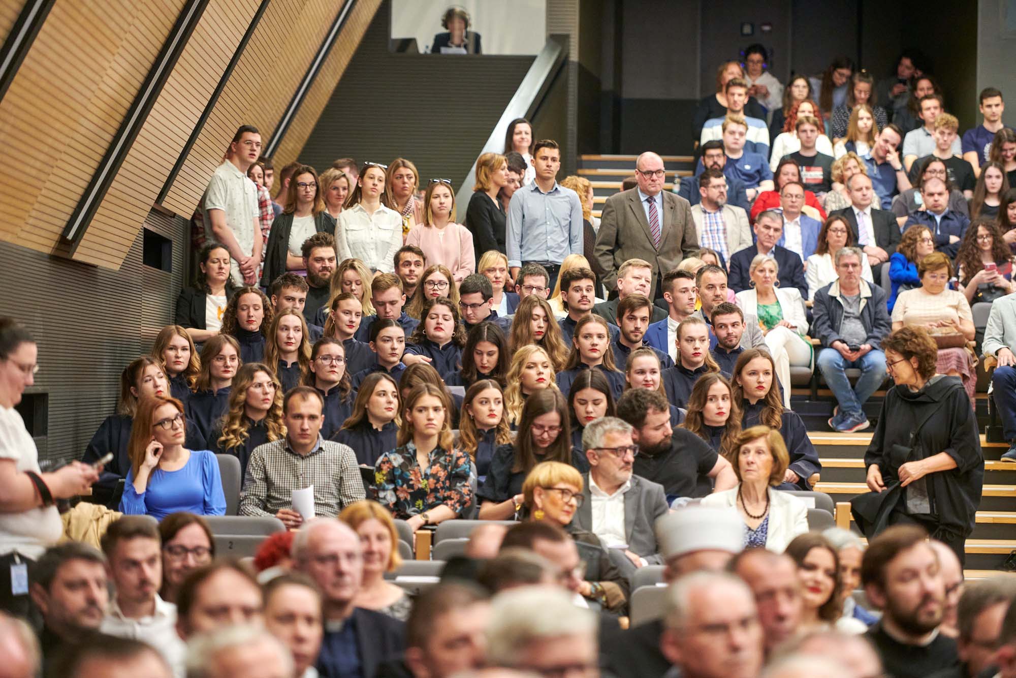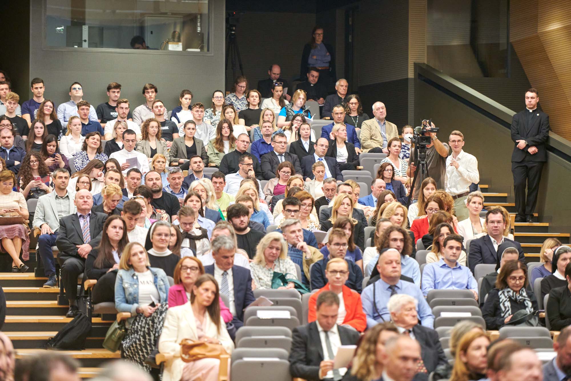 Uz studente i profesore Hrvatskog katoličkog sveučilišta svečanom akademskom činu nazočili su brojni predstavnici političkog, diplomatskog, kulturnog i gospodarskog života Hrvatske.