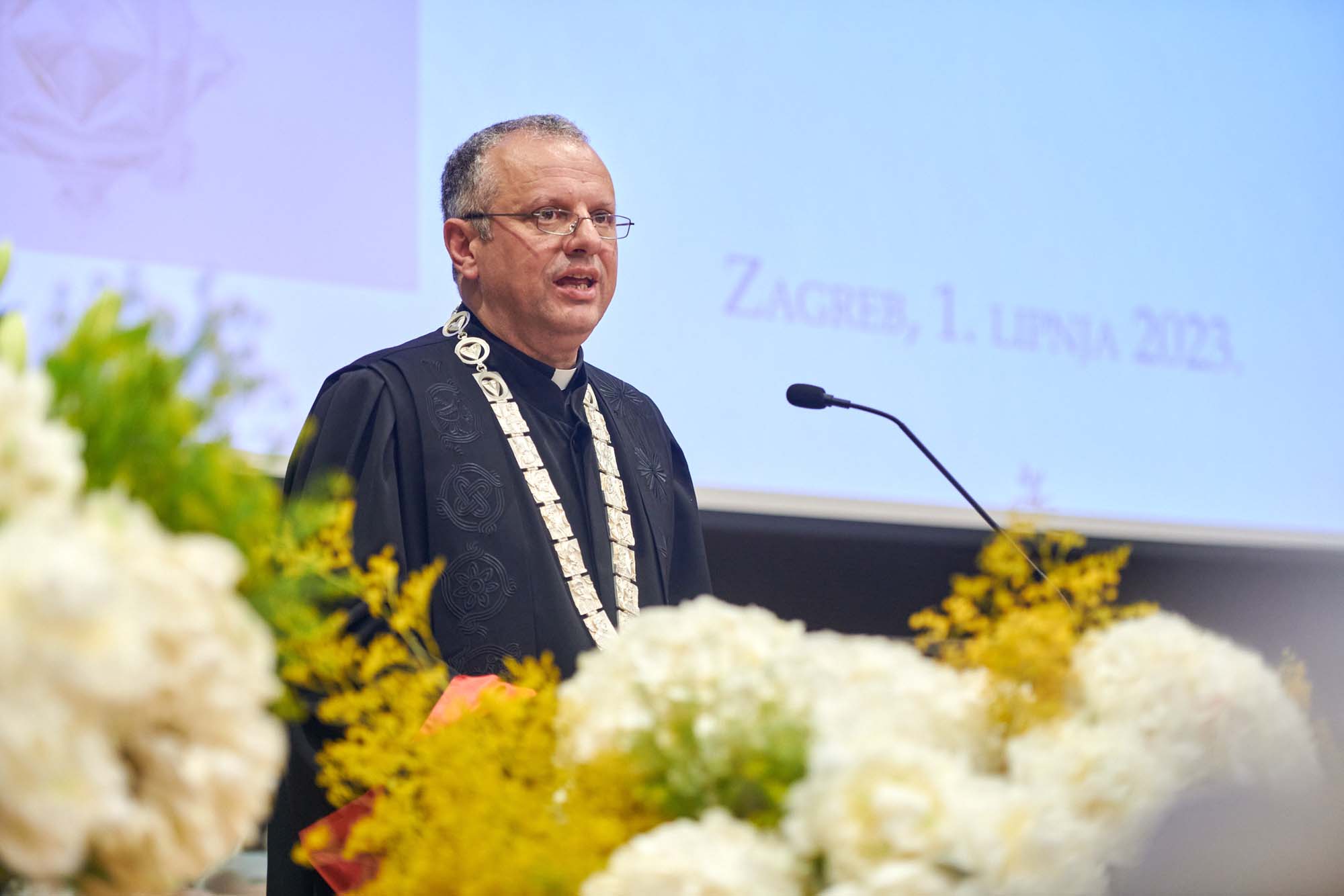Zahvalan svima vama na svim znakovima pažnje i prijateljstva želio bih u ime sveučilišne zajednice i svoje osobno na poseban način zahvaliti na prisutnosti našem dosadašnjem Velikom kancelaru i Osnivaču, uzoritom kardinalu Josipu Bozaniću, zagrebačkom nadbiskupu u miru, koji je svojim odlukama pozvao u život naše Sveučilište i pratio ga i hrabrio svojom pastirskom i očinskom brigom sve ove godine. Uzoriti, Vaše će djelovanje ostati trajno upisano u povijest ovoga Sveučilišta. O tomu svjedoči ne samo do sada postignuto, nego i Vaš lik na rektorskom lancu kao trajni podsjetnik na osnutak i razvoj našega Sveučilišta. I dalje ste s nama i još se više preporučamo u Vaše molitve.