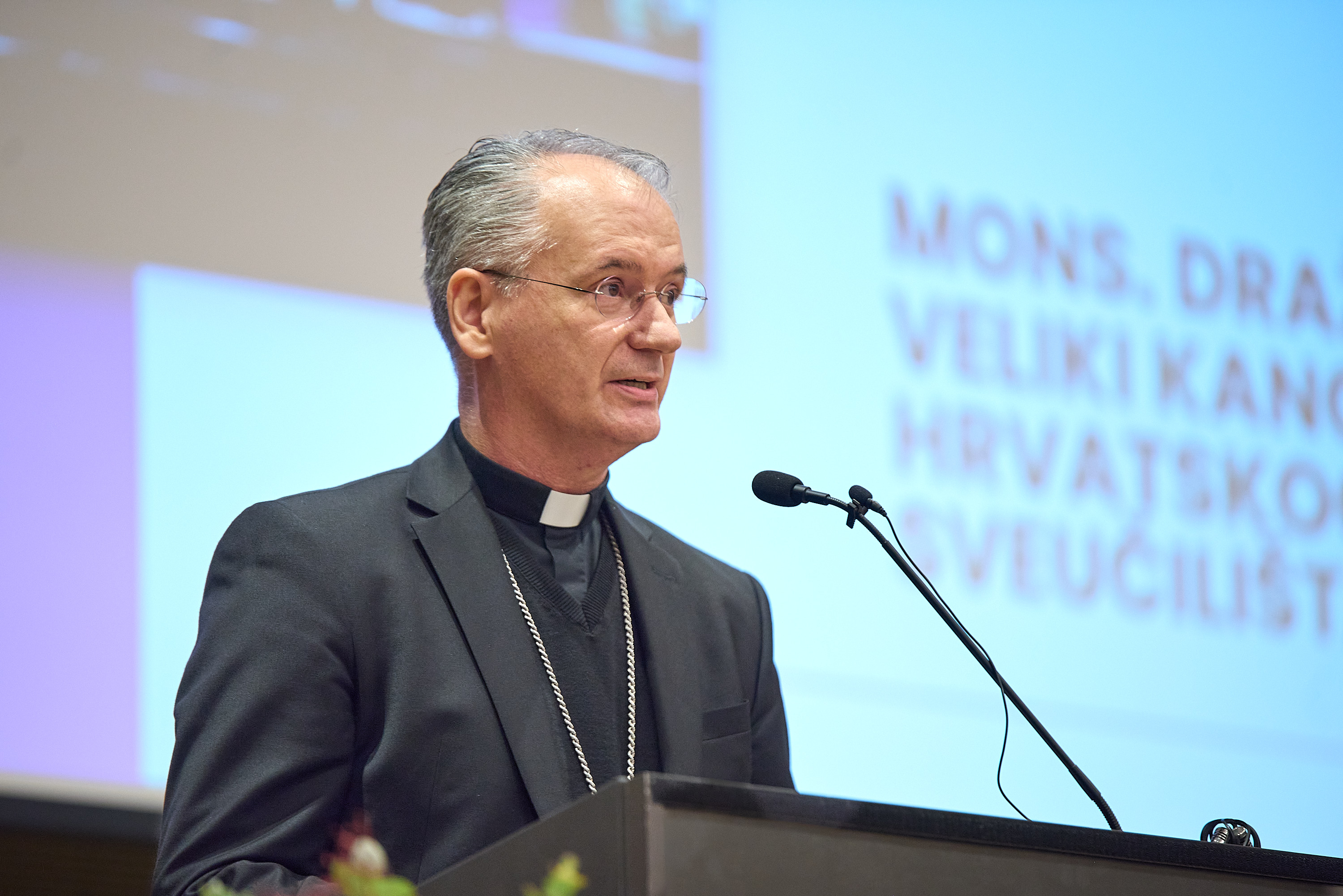 Mons. Dražen Kutleša u svojem je govoru istaknuo: "U vremenu sveprisutnog relativizma vrijednosti i svođenja ljudskoga dostojanstva na subjektivni doživljaj prava i obveza, početak rada Pravnoga fakulteta unutar Katoličkog sveučilišta pokazuje se iznimno važnim. S jedne strane, tim činom Crkva potvrđuje svoju kontinuiranu svijest o potrebi i važnosti zakona kao i povjerenje u mogućnost dobrog i pravednog uređenja ljudske zajednice. S druge pak strane, Hrvatsko katoličko sveučilište u Pravnome fakultetu dobiva važno sredstvo osnaženja i oživotvorenja nadahnuća koje je oblikovalo europski duh još od najranijeg susreta kršćanstva s rimskim pravom. Upravo taj susret rađao je velikane razuma i savjesti i pokazivao da pravo nije niz tehničkih uredbi, nego živi dijalog između norme i vrijednosti, između poretka i slobode, između onoga što jest i ideala kojemu treba težiti. Pravo se često razumijeva kao nametnuta zapovijed, kao instrument moći, naredba odozgo. No, izvorno, pravo dolazi odozdol, iz života, iz odnosa, iz sposobnosti čovjeka da u drugome prepozna bližnjega. Ono nije tek sustav zapovijedi, nego mreža odnosa koja nas uči kako živjeti zajedno. U tom smislu ono je izraz ljudske solidarnosti i odgovornosti, uređenje koje organizira odnose, čuva slobodu i red, ali i poštuje raznolikost. Stoga je autentično pravo uvijek pluralno, nije zatvoreno u granice države, nego živi u mikro i makro zajednicama, u svakom prostoru gdje ljudi žele pravedno urediti svoje odnose. Na katoličkom sveučilištu pravo se ne može poučavati samo kao vještina, nego kao poziv na služenje. Stoga svrha ovoga fakulteta nije naučiti služiti se zakonima kao oruđem moći, nego naučiti čuvati pravo u službi istine i pravednosti", rekao je mons. Kutleša.