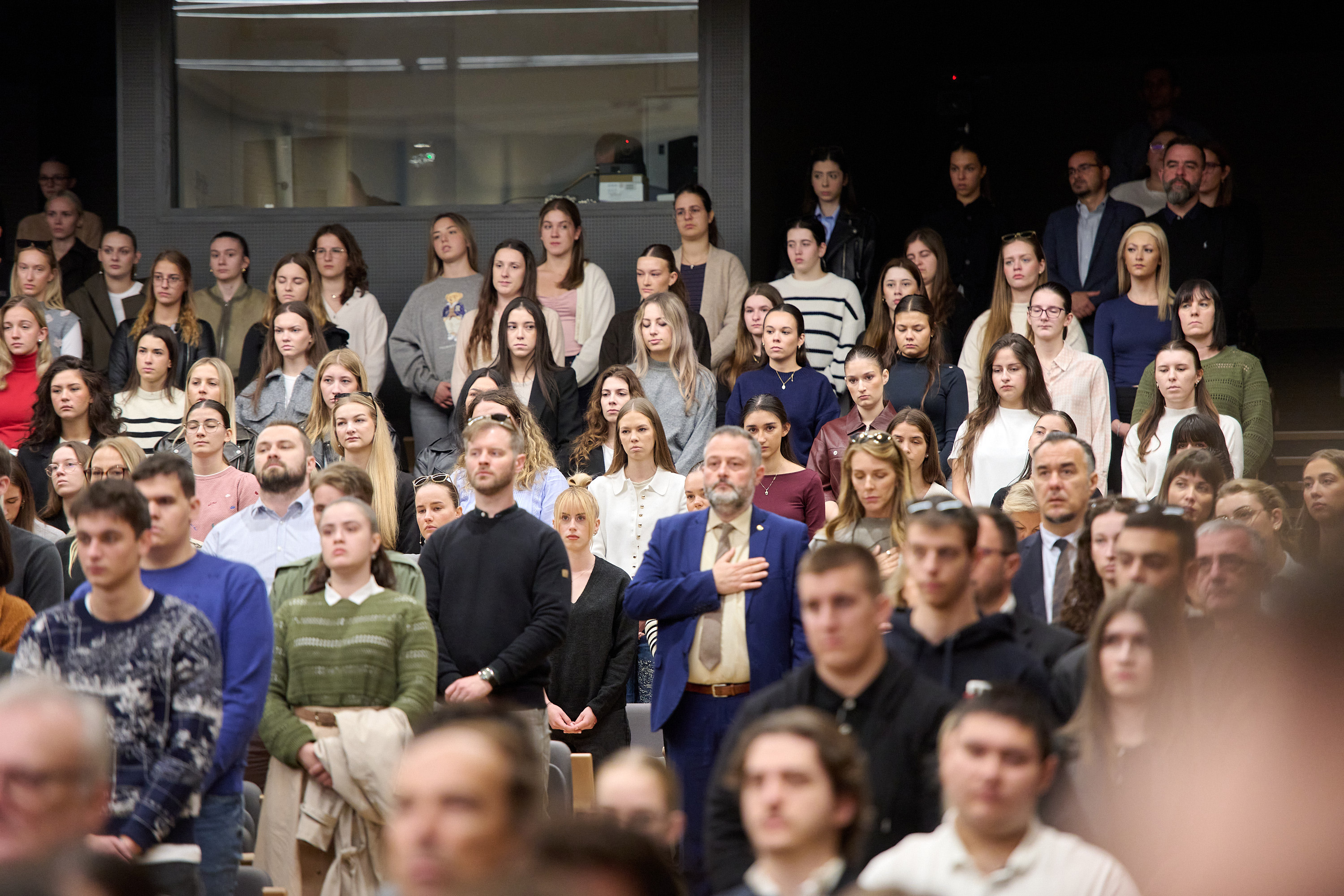 Prorektor za nastavu prof. dr. sc. Roko Mišetić pozdravio je okupljene nastavnike i studente te im je zaželio dobrodošlicu, istaknuvši važnost međusobne suradnje studenata, voditelja godišta, profesora, pročelnika Sveučilišnih odjela i sa starijim kolegama.