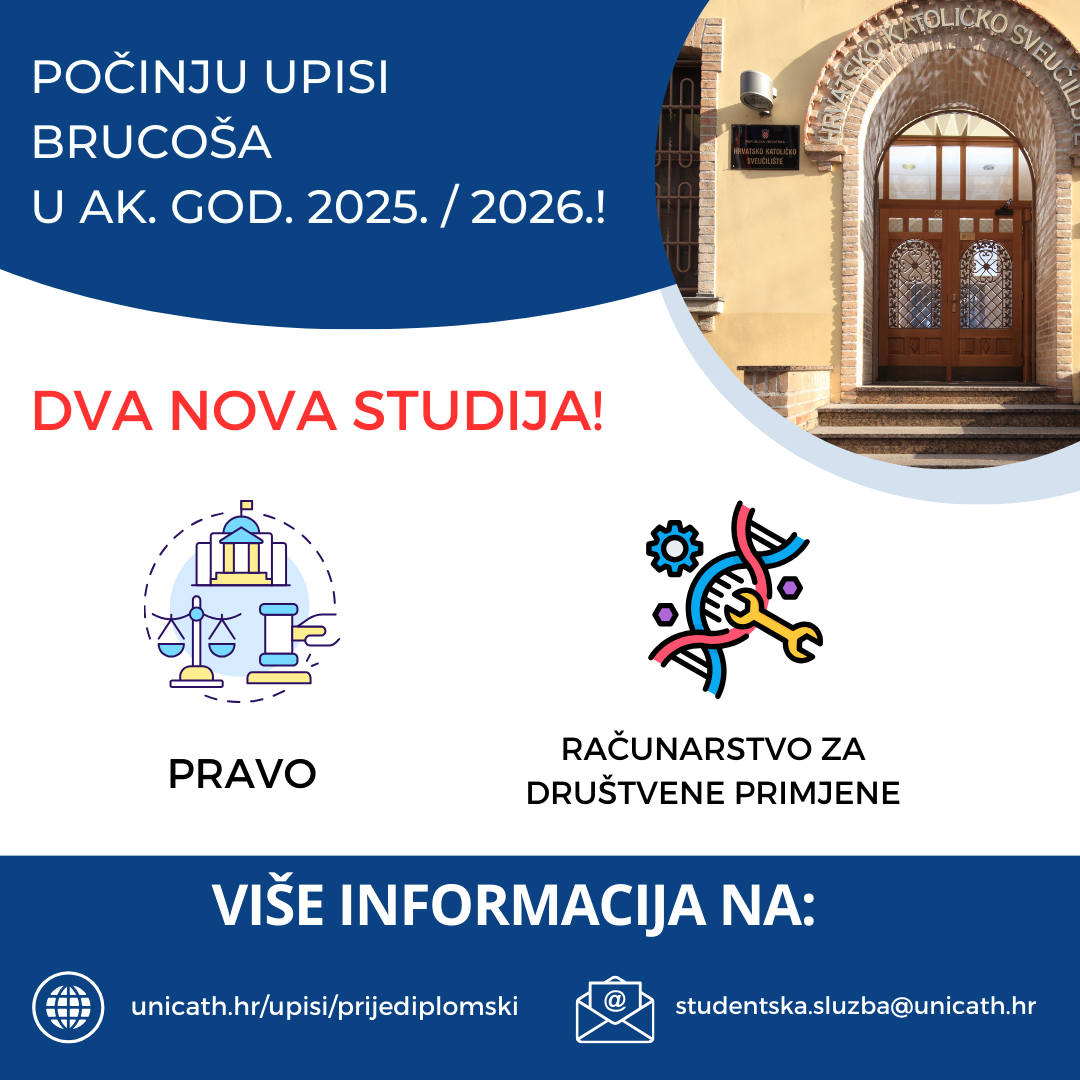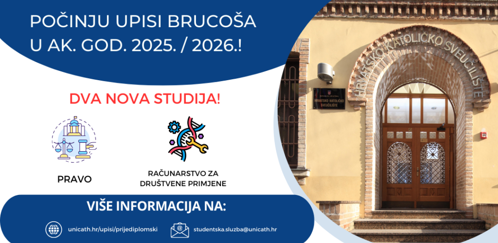 Na temelju Odluke Senata Hrvatskoga katoličkog sveučilišta raspisan je natječaj za upis studenata koji se žele upisati na sveučilišne prijediplomske i sveučilišne integrirane studije u akademskoj godini 2025./2026.