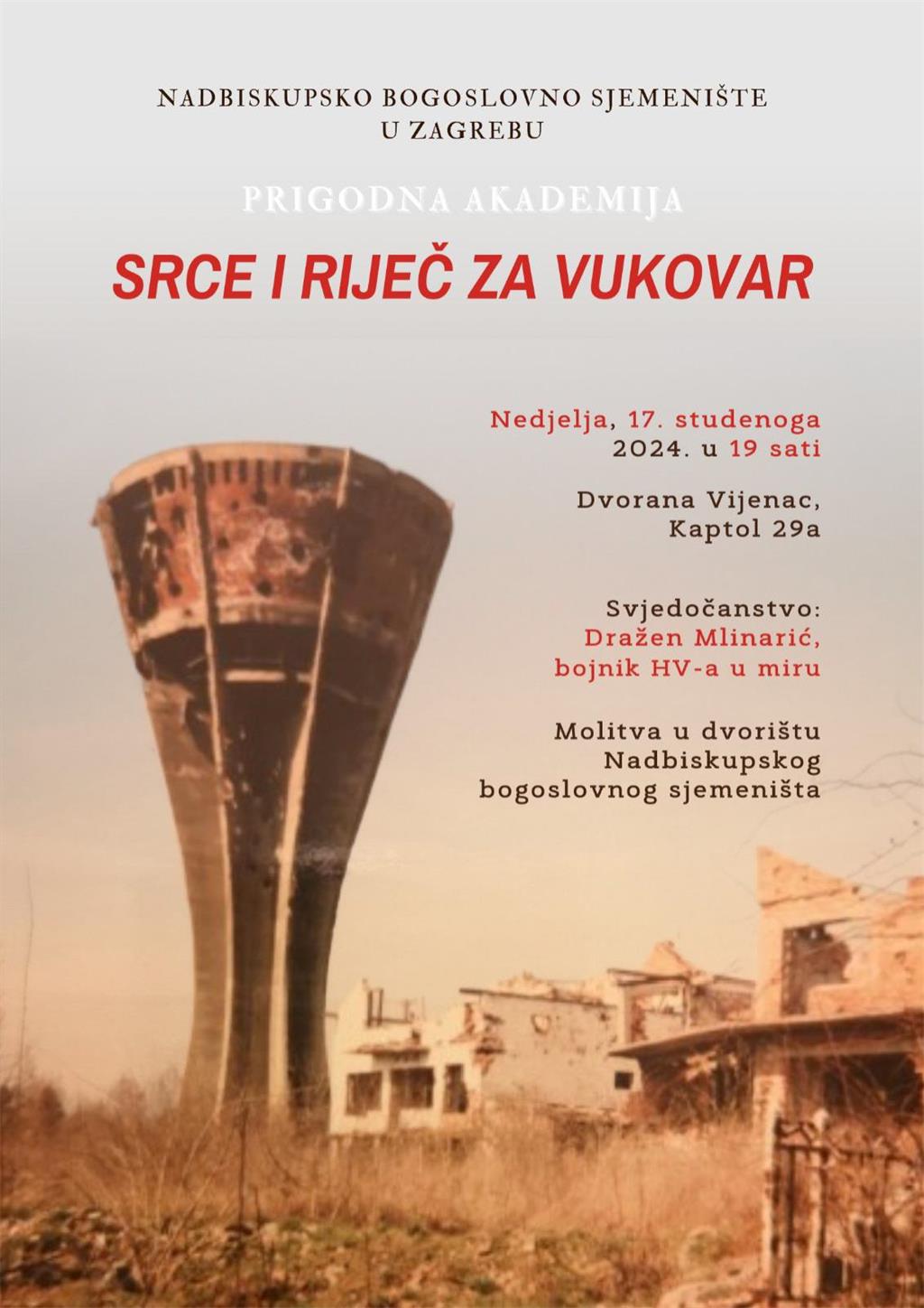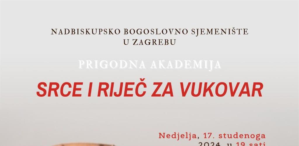 Već tradicionalno i ove će se godine održati svečana akademija "Srce i riječ za Vukovar" u organizaciji Nadbiskupskog bogoslovnog sjemeništa u Zagrebu. Akademija će se održati u nedjelju 17. studenoga 2024. u 19 sati u dvorani "Vijenac" Nadbiskupskog pastoralnog instituta na adresi Kaptol 29.