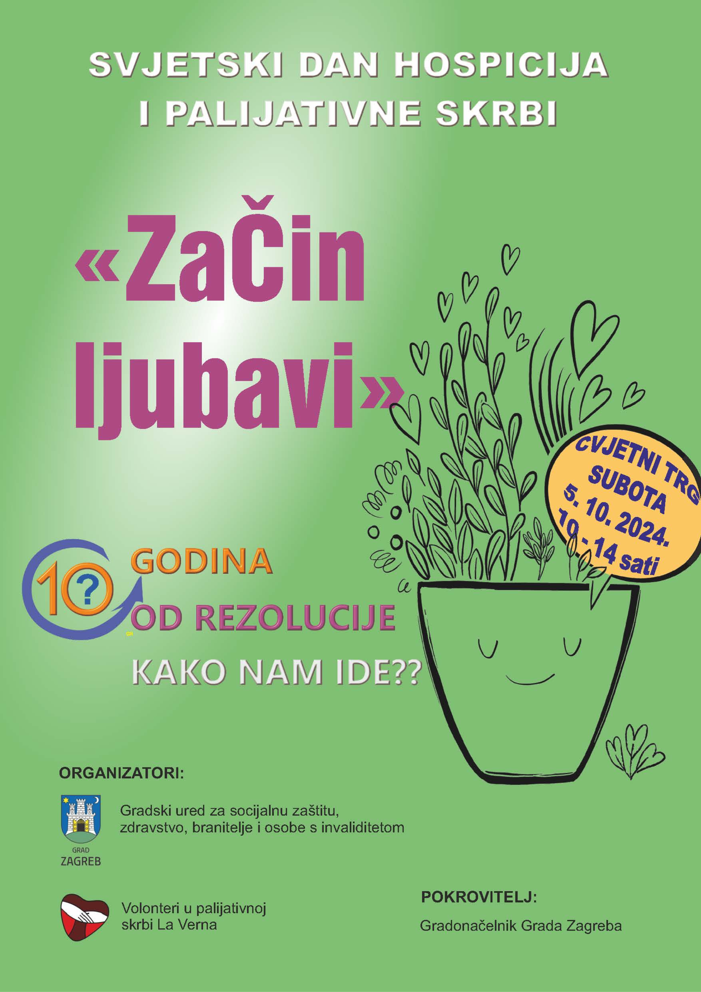 Povodom Svjetskog dana hospicija i palijativne skrbi La Verna zajedno s Uredom za socijalnu zaštitu, zdravstvo, branitelje i osobe s invaliditetom Grada Zagreba petu godinu zaredom, u subotu, 5. listopada 2024. na Cvjetnom trgu od 10:00 do 14:00 sati organizira akciju „ZaČin ljubavi“.