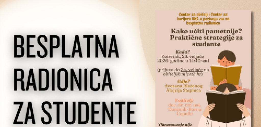 Nakon iskustva zimskih ispitnih rokova, početak ljetnog semestra pravi je trenutak da razmislite kako Vaše učenje može biti još zabavnije i efikasnije! Stoga Vas pozivamo na radionicu na kojoj ćete imati prilike naučiti više o tome kako funkcionira naše pamćenje, kako tome prilagoditi različite metode učenja, kako održati motivaciju za učenje, kako još bolje organizirati svoje vrijeme i još mnogo toga. Planirano trajanje radionice je oko 2 sata, a svoju prijavu, molimo, pošaljite na obitelj@unicath.hr najkasnije do 24. veljače. Veselimo se radu i učenju s Vama!