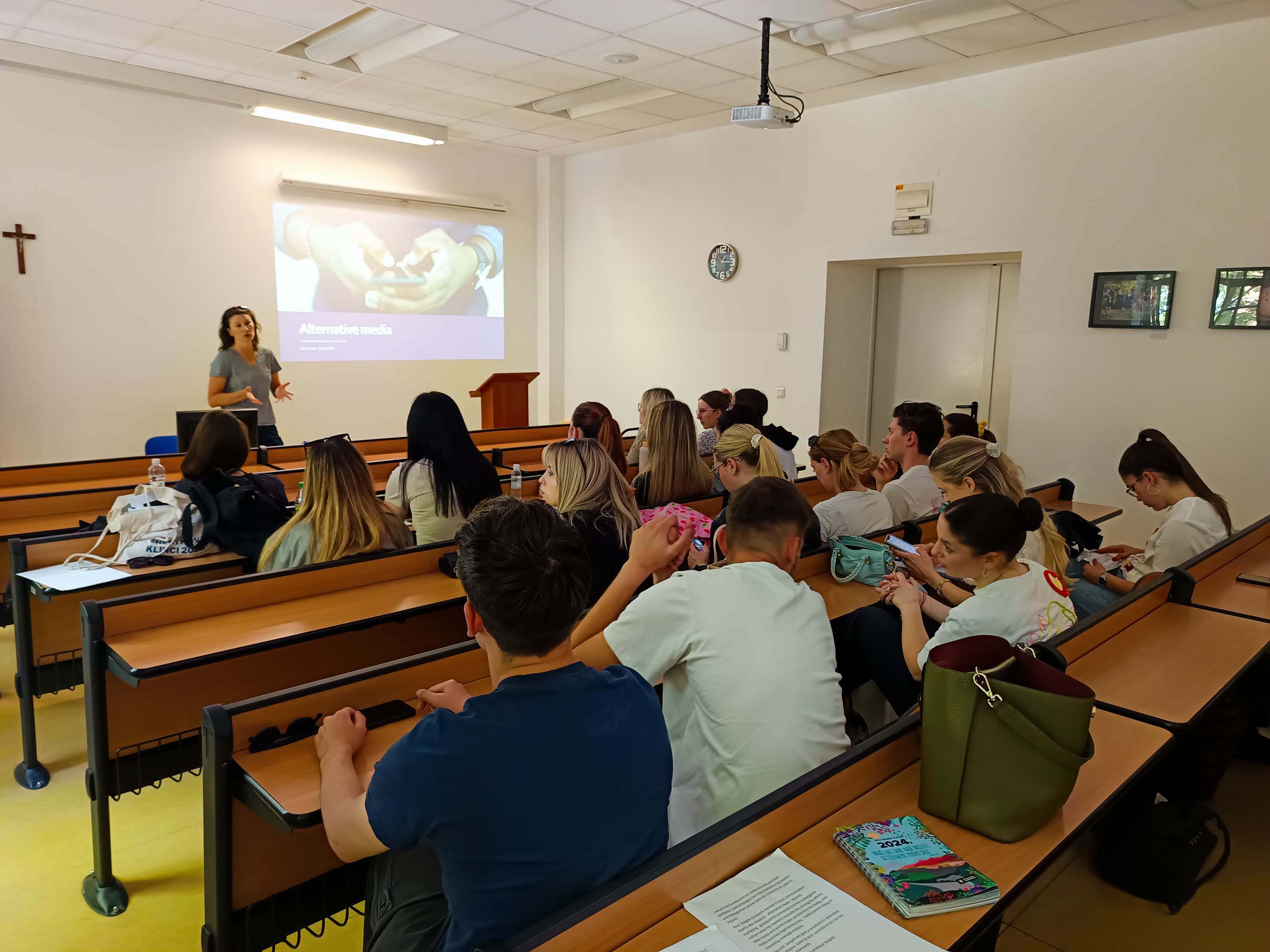 Tijekom boravka na našem Sveučilištu sastala se s pročelnikom Sveučilišnog odjela za komunikologiju, prof. dr. sc. Danijelom Labašem i Erasmus+ koordinatoricom doc. dr. sc. Suzanom Peran te održala predavanja za studente Sveučilišnog diplomskog studija Komunikologija.