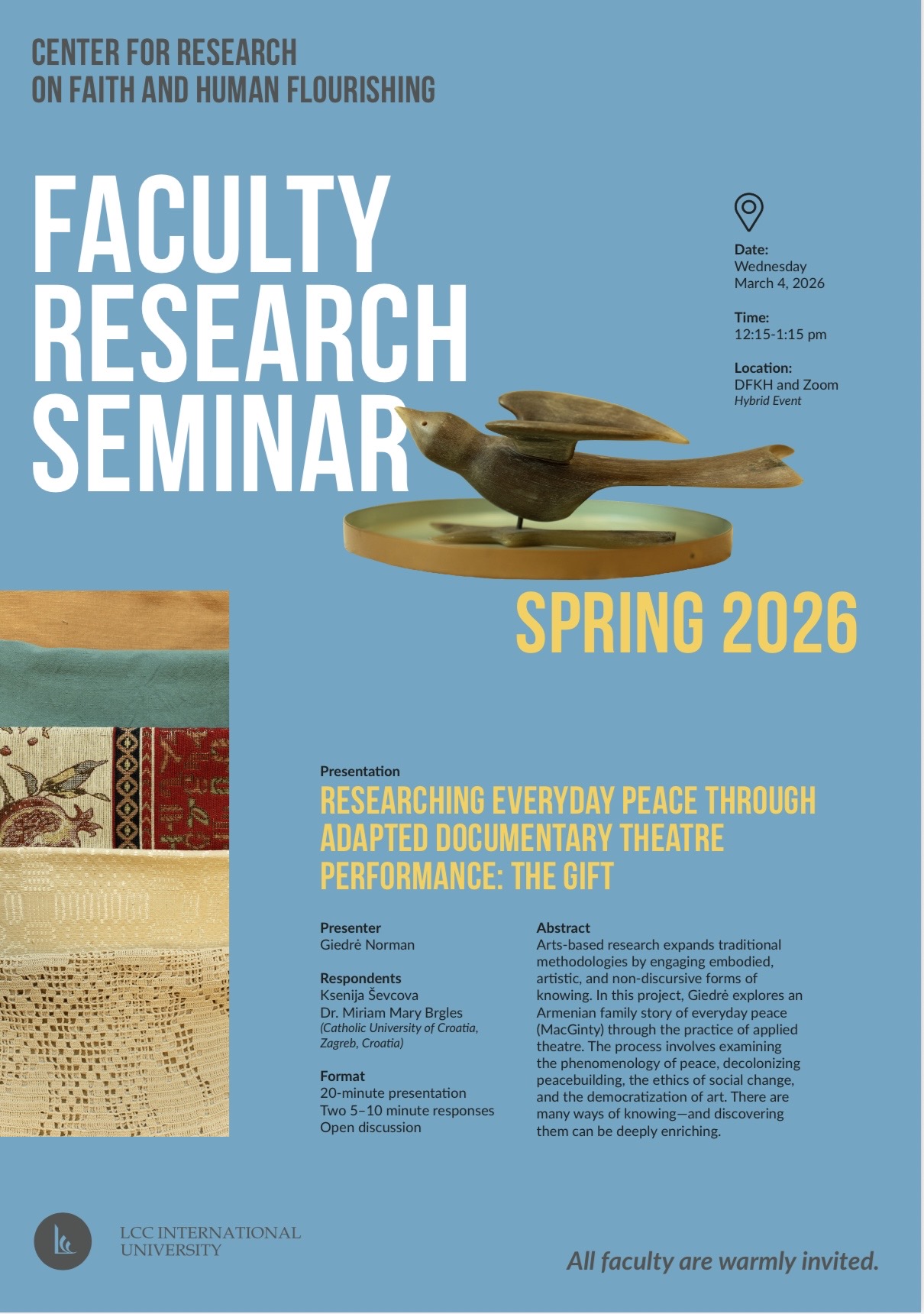 U srijedu 4. ožujka 2026. Center for Research on Faith and Human Flourishing na LCC International University u Klapeidi (Litva) organizirao je drugi u nizu Fakultetski istraživački seminar pod nazivom “Researching Everyday Peace Through Adapted Documentary Theatre Performance: The Gift.”. Doc. dr. sc. Miriam Mary Brgles sa Sveučilišnog Odjela za sociologiju bila je pozvana dati odgovor i osvrt na projektno istraživanje predavačice Giedrė Norman. Hibridno organiziran događaj okupio je profesore, studente i online sudionike za istraživanje inovativnih pristupa istraživanju kroz umjetničku praksu.