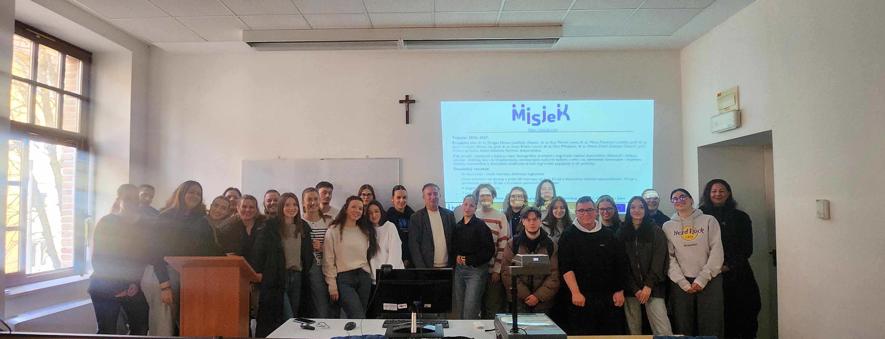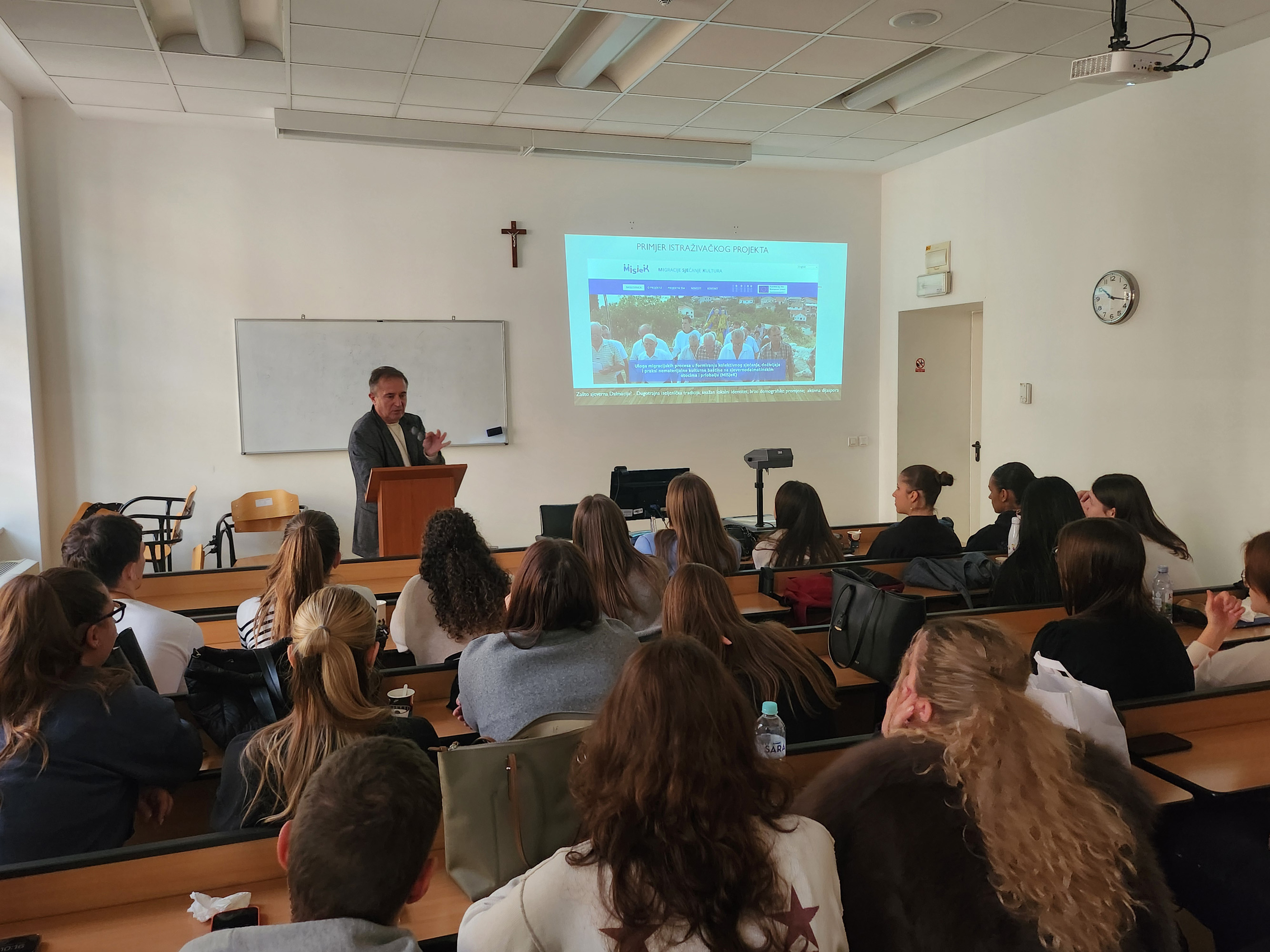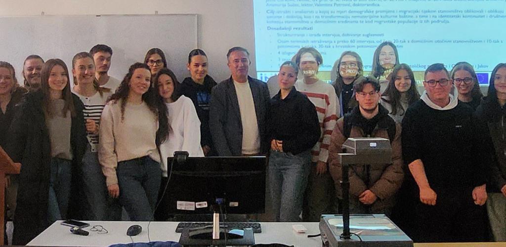 U sklopu gostovanja studentima je predstavljen i znanstveni projekt MISJEK – Uloga migracijskih procesa u formiranju kolektivnog sjećanja, doživljaja i praksi nematerijalne kulturne baštine na sjevernodalmatinskim otocima i priobalju, čiji je voditelj dr. Nimac, a kojeg provodi Institut za istraživanje migracija uz potporu Europske unije, iz programa NextGenerationEU, u suradnji s našim sveučilišnim nastavnicima. Na kraju izlaganja dr. Nimac je zaključio da je nematerijalna kulturna baština dinamična i neprestano u interakciji s društvenim promjenama, te da njezino očuvanje zahtijeva aktivnu ulogu zajednice na lokalnoj i globalnoj razini, uključujući dijasporu, obrazovanje i održivi turizam. Studenti su aktivno sudjelovali u raspravi, povezujući tematske cjeline predavanja i projekta s nastavnim sadržajima, te iskazali interes za daljnje uključivanje u istraživački rad na području sociologije migracija, kolektivnog sjećanja, identiteta i nematerijalne kulturne baštine.
