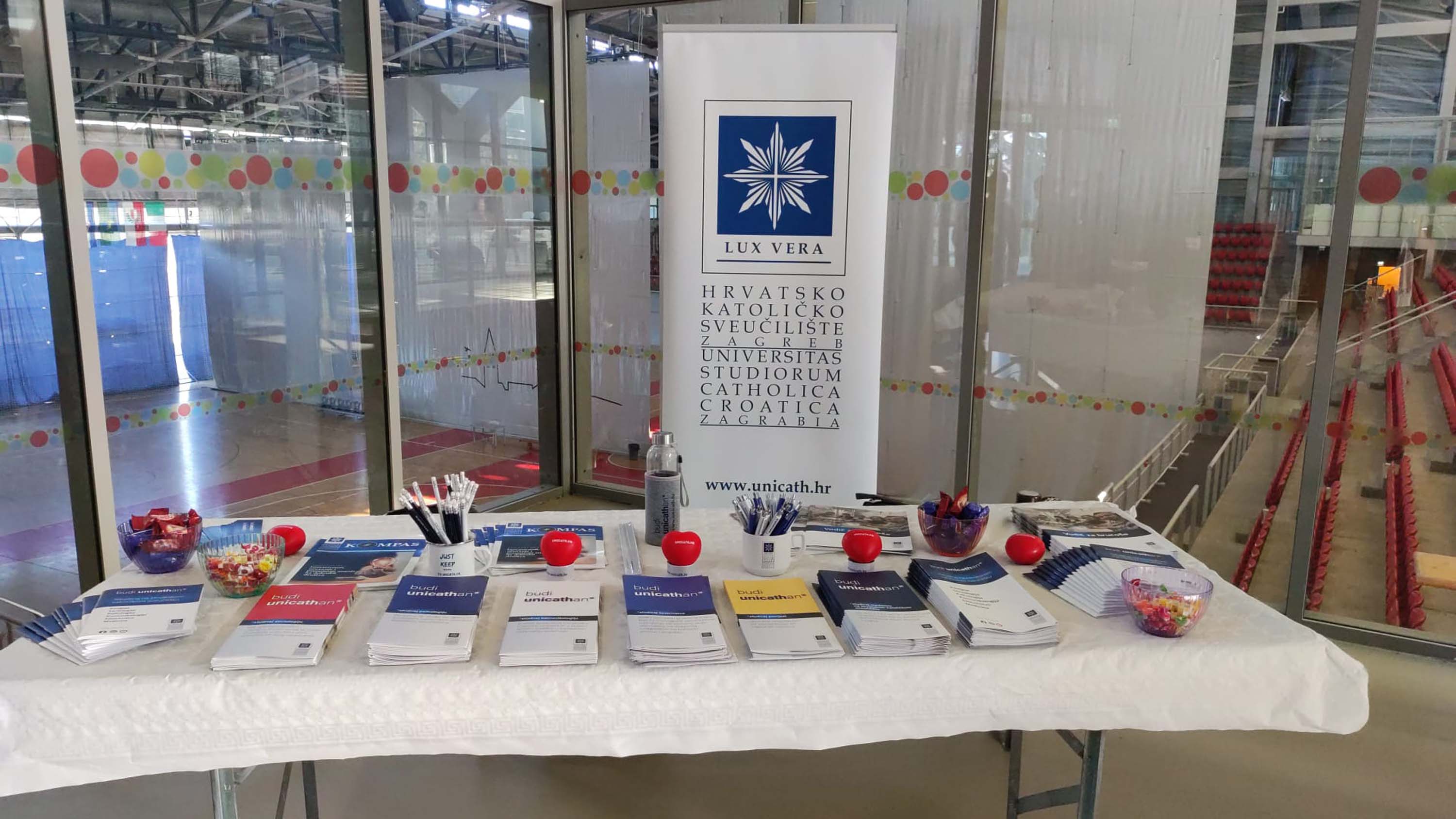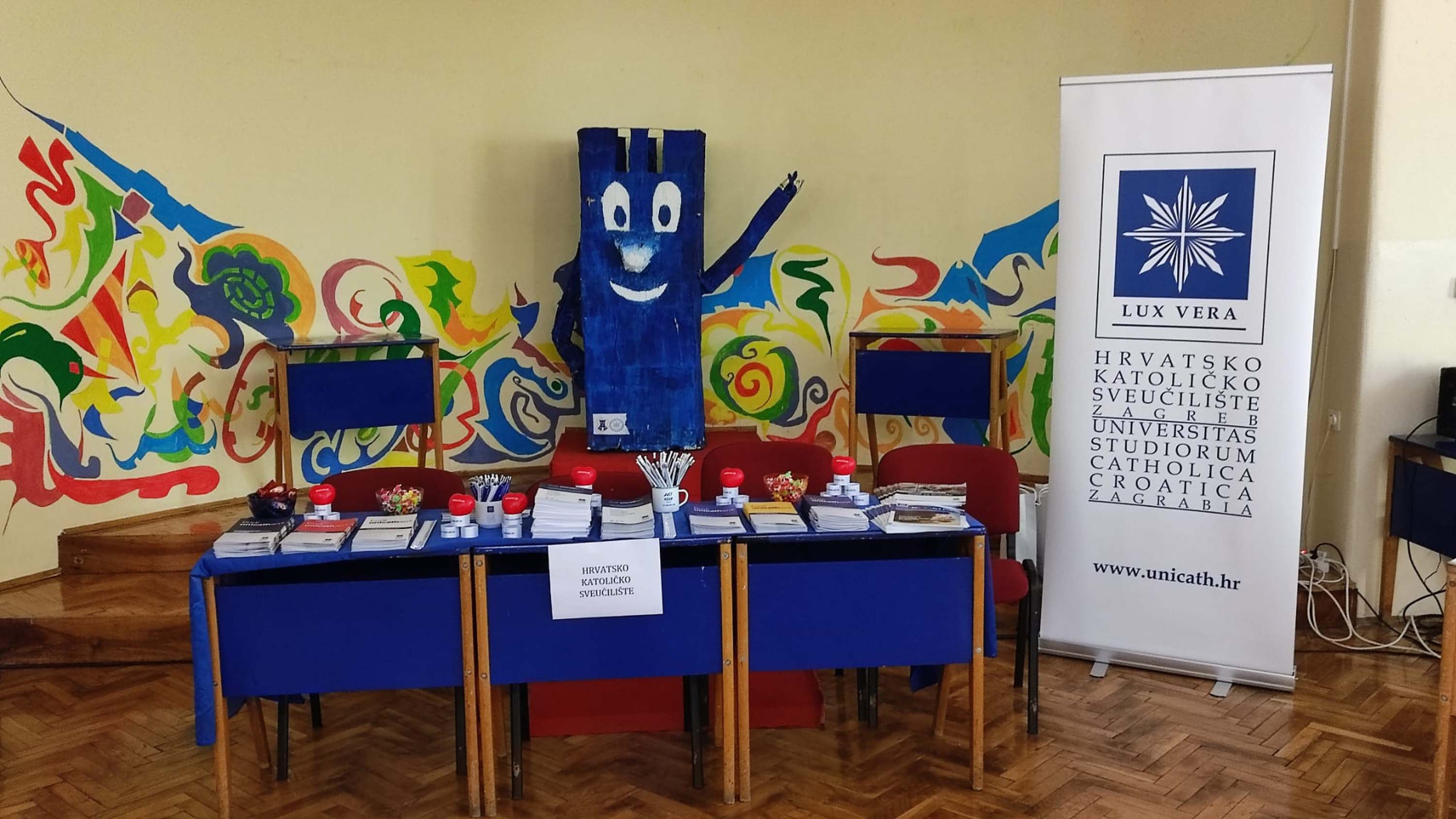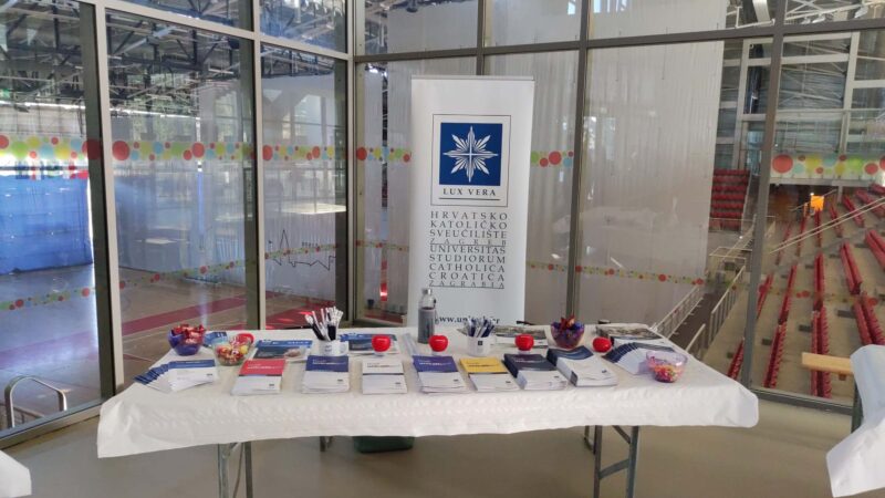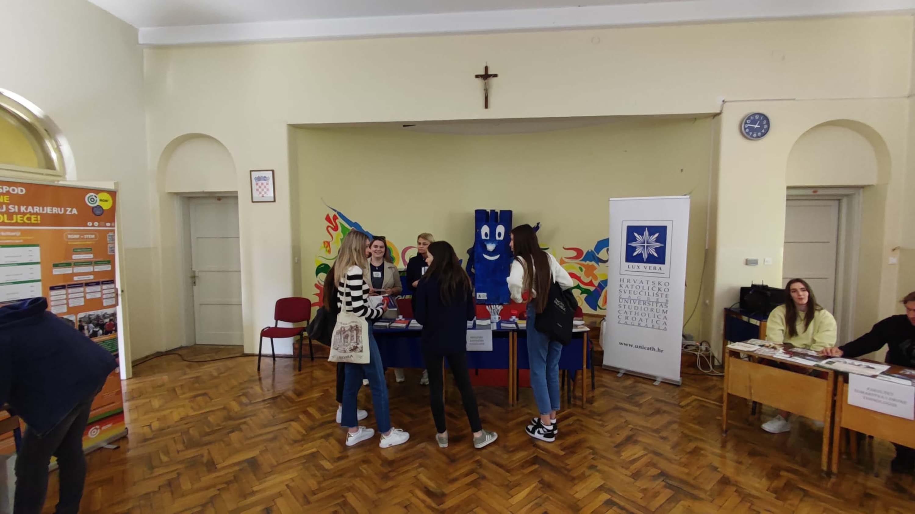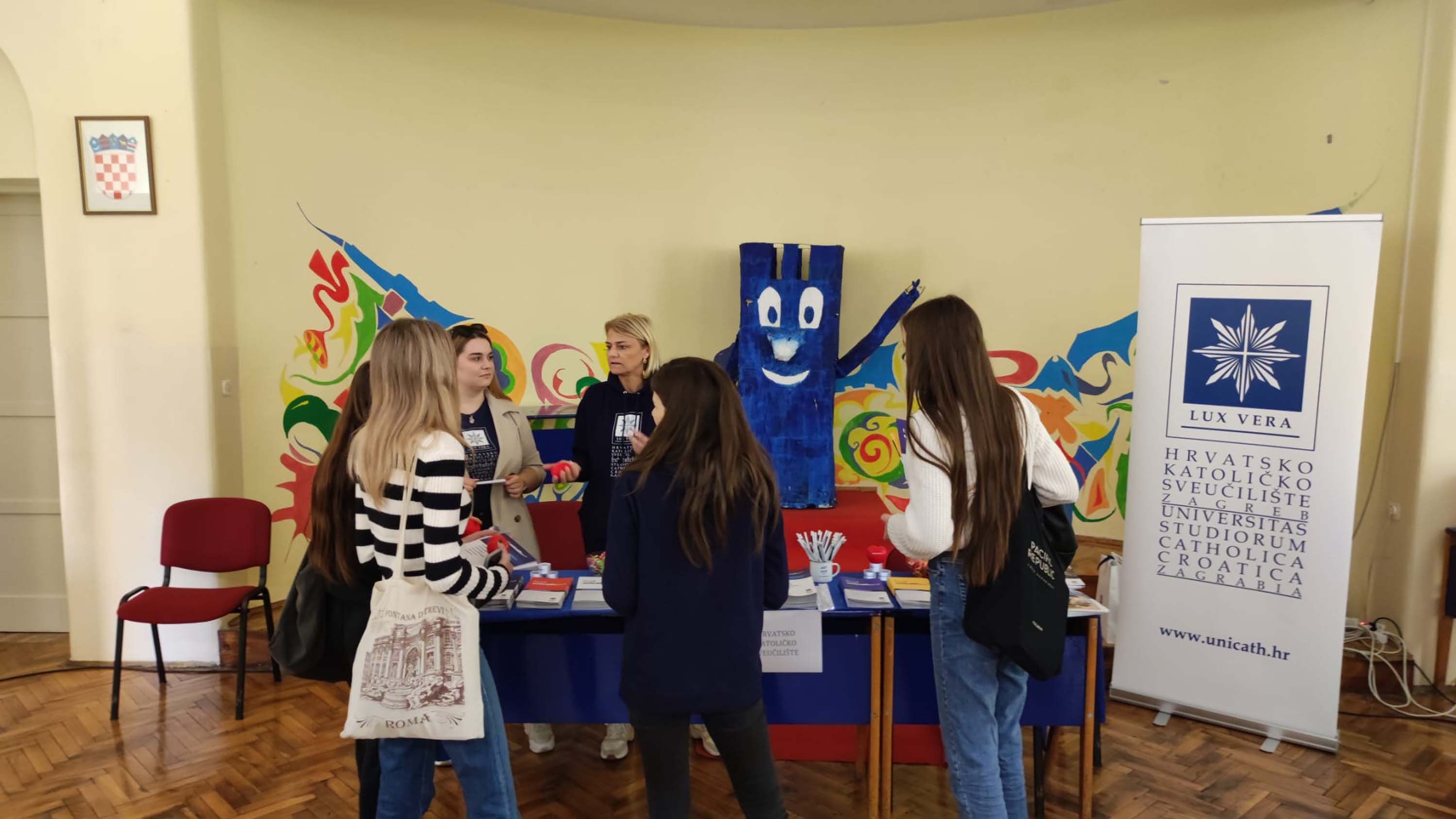 U petak, 17. studenog 2023. predstavnici našeg Sveučilišta su u Pazinskom kolegiju sudjelovali na Sajmu karijera za učenike i učenice učeničkog doma, srednje strukovne škole i gimnazije u Pazinu. Uz 15 predstavljača visokoobrazovnih institucija sa Sveučilišta u Zagrebu i Rijeci, učenici su, kao i u Poreču, imali priliku informirati se o svim studijskim programima i uvjetima upisa te iz prve ruke naših studentica i nastavnica čuti iskustva studija, rada i unicathnosti Hrvatskog katoličkog sveučilišta.