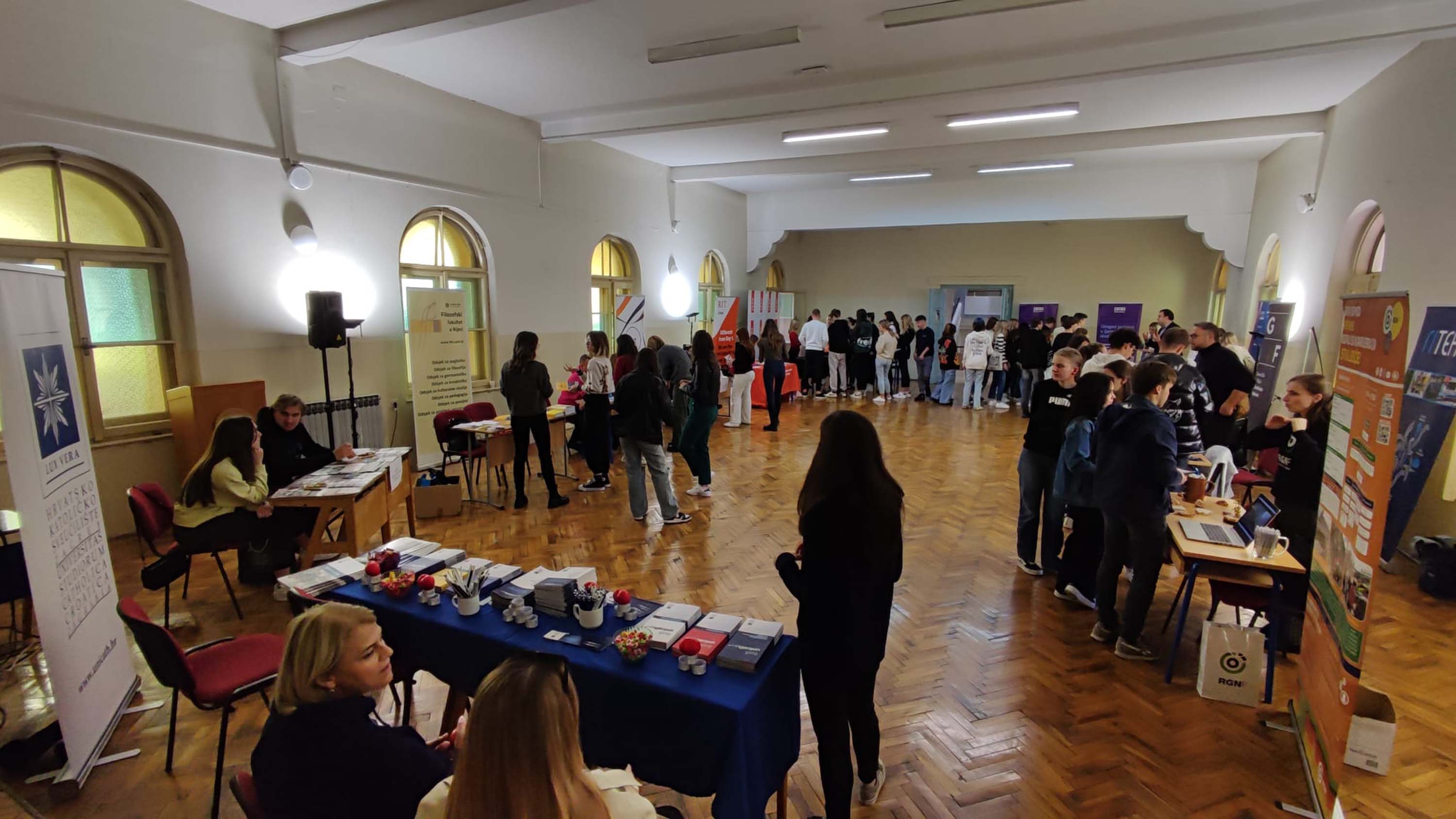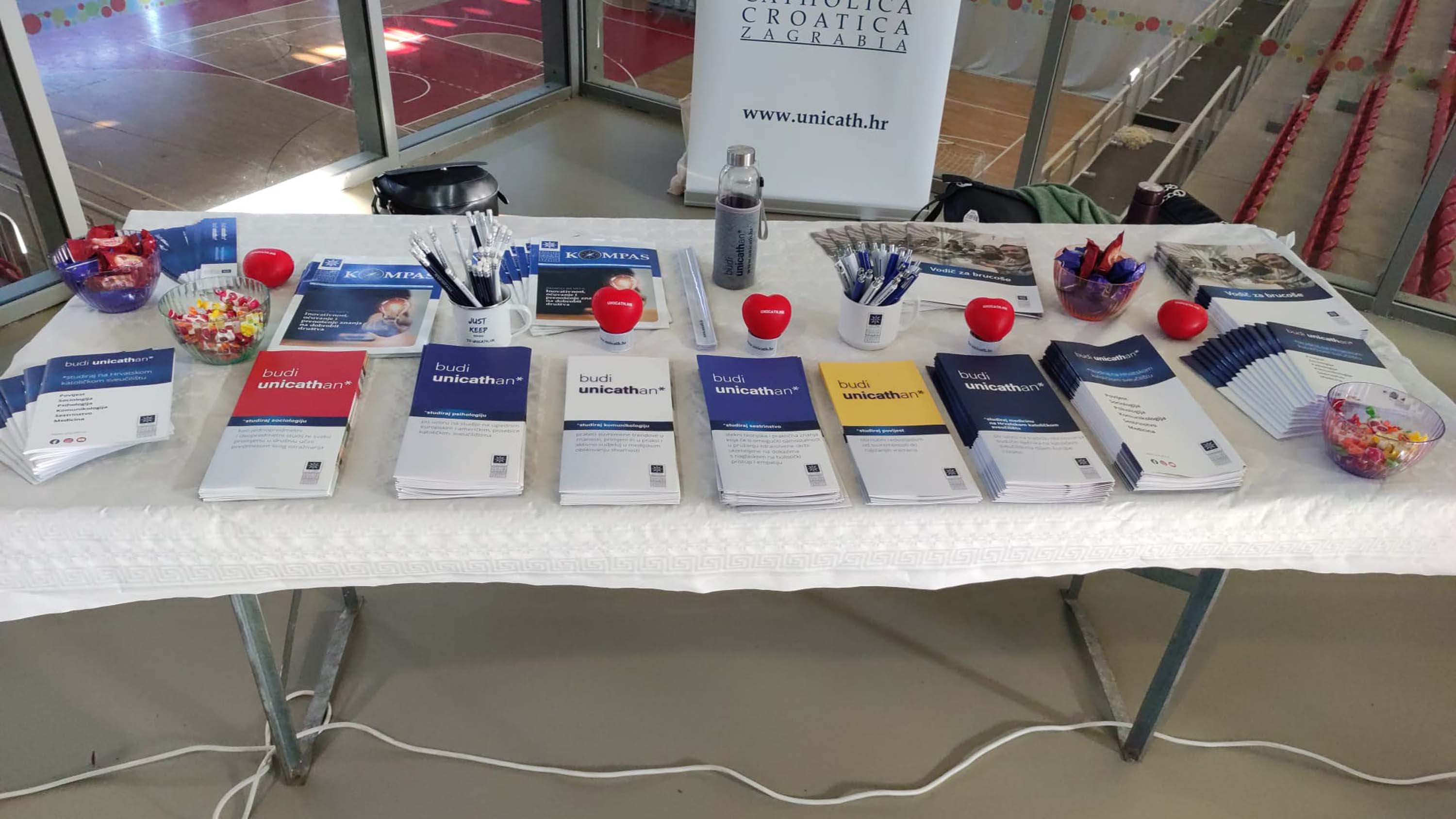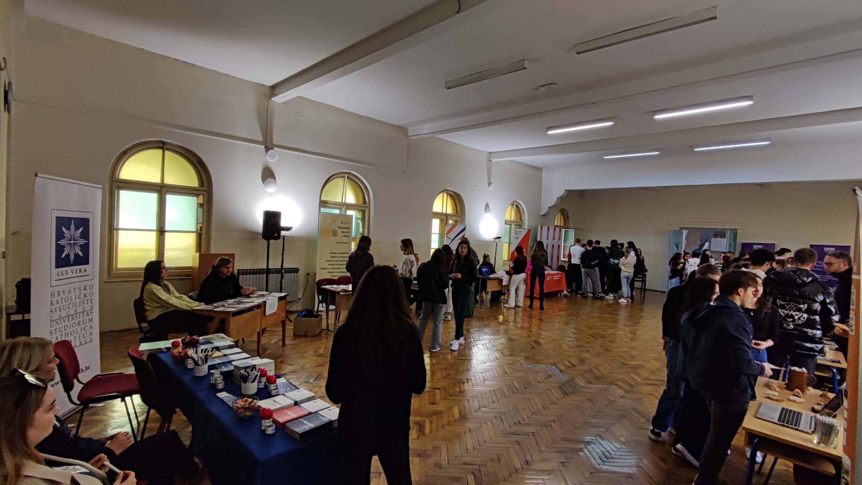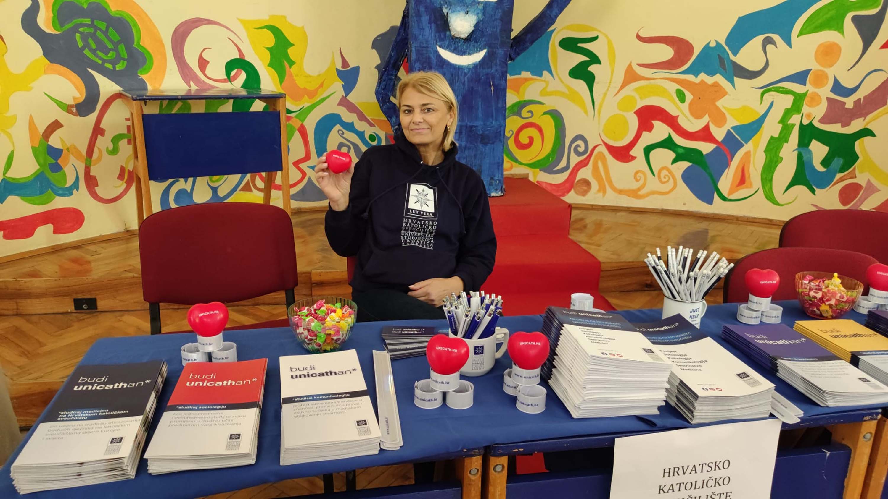 U petak, 17. studenog 2023. predstavnici našeg Sveučilišta su u Pazinskom kolegiju sudjelovali na Sajmu karijera za učenike i učenice učeničkog doma, srednje strukovne škole i gimnazije u Pazinu. Uz 15 predstavljača visokoobrazovnih institucija sa Sveučilišta u Zagrebu i Rijeci, učenici su, kao i u Poreču, imali priliku informirati se o svim studijskim programima i uvjetima upisa te iz prve ruke naših studentica i nastavnica čuti iskustva studija, rada i unicathnosti Hrvatskog katoličkog sveučilišta.
