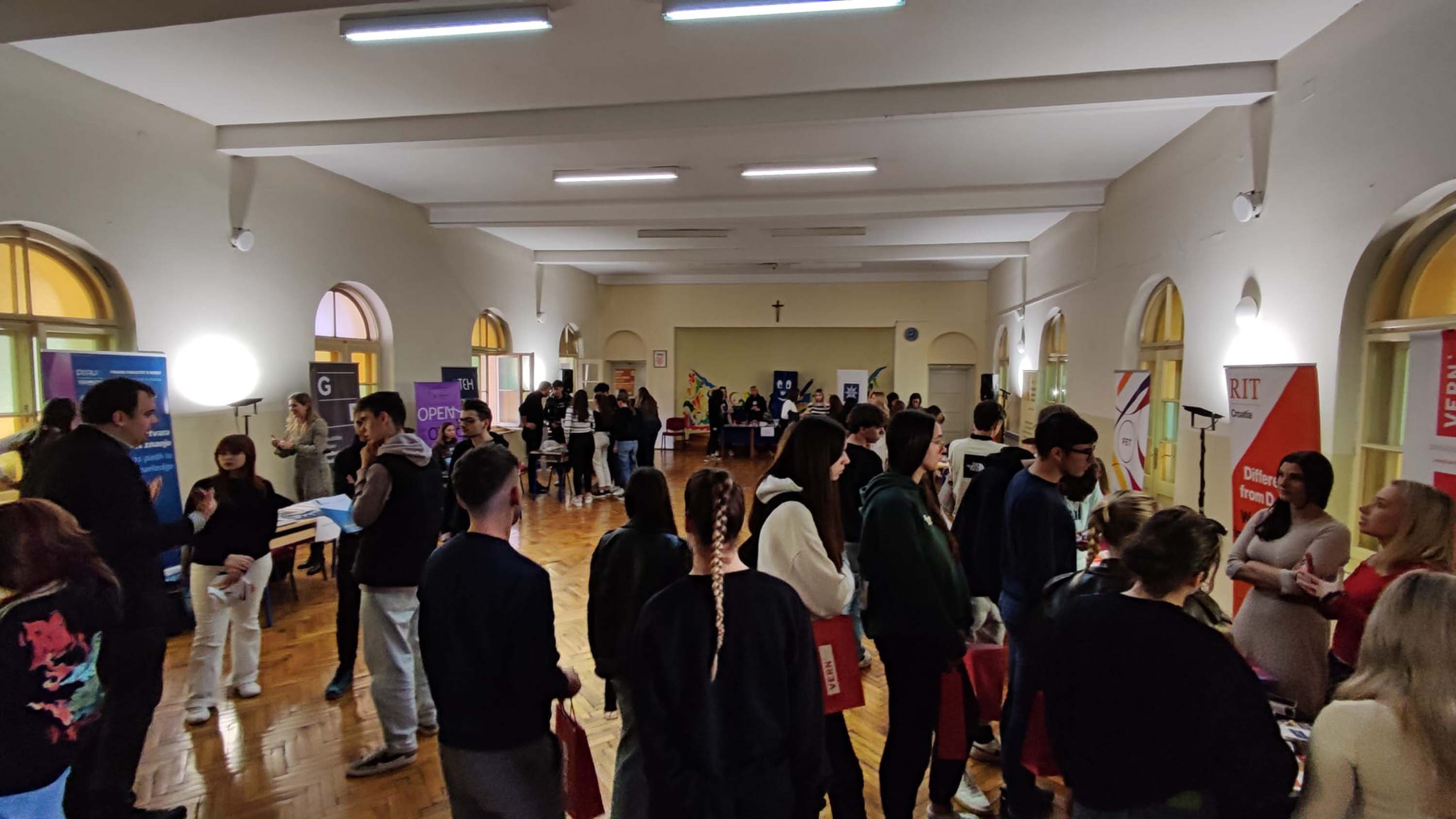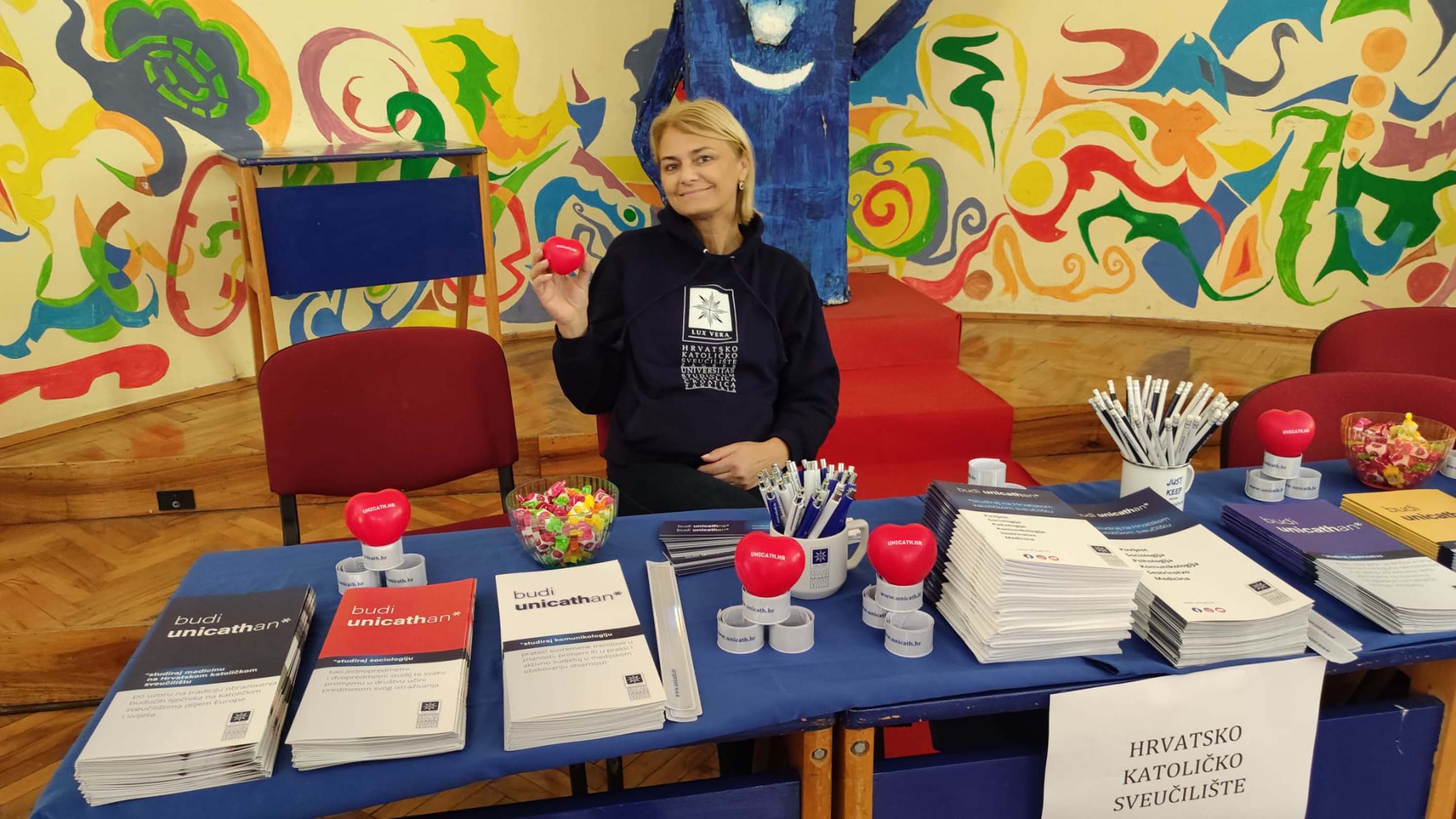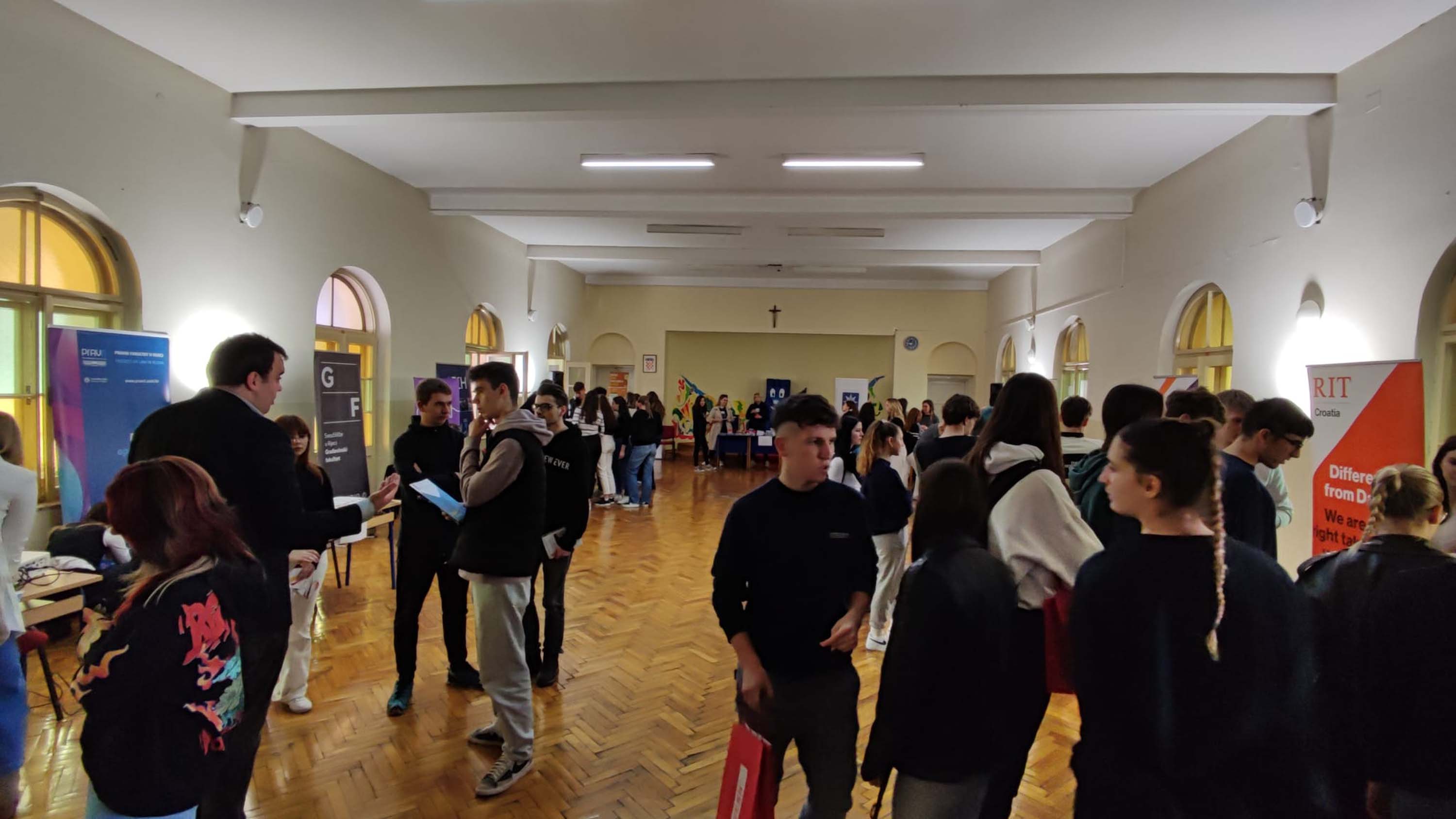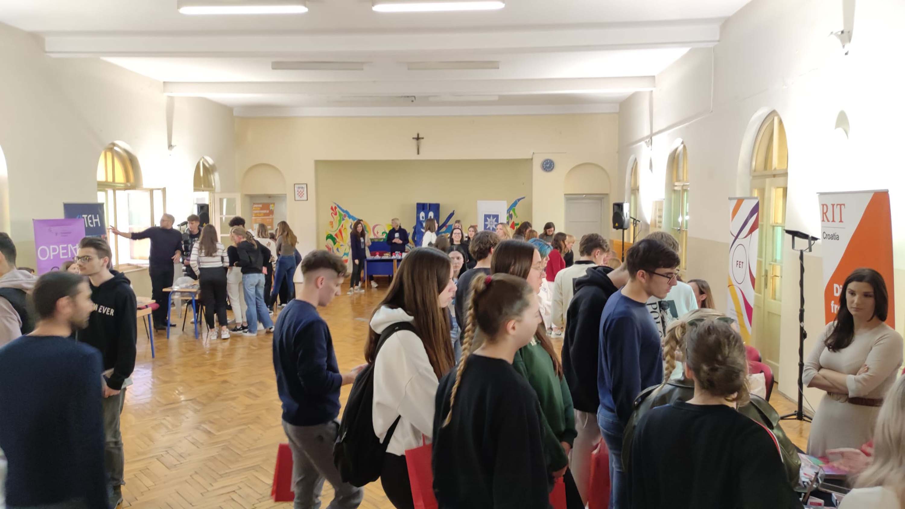 U petak, 17. studenog 2023. predstavnici našeg Sveučilišta su u Pazinskom kolegiju sudjelovali na Sajmu karijera za učenike i učenice učeničkog doma, srednje strukovne škole i gimnazije u Pazinu. Uz 15 predstavljača visokoobrazovnih institucija sa Sveučilišta u Zagrebu i Rijeci, učenici su, kao i u Poreču, imali priliku informirati se o svim studijskim programima i uvjetima upisa te iz prve ruke naših studentica i nastavnica čuti iskustva studija, rada i unicathnosti Hrvatskog katoličkog sveučilišta.