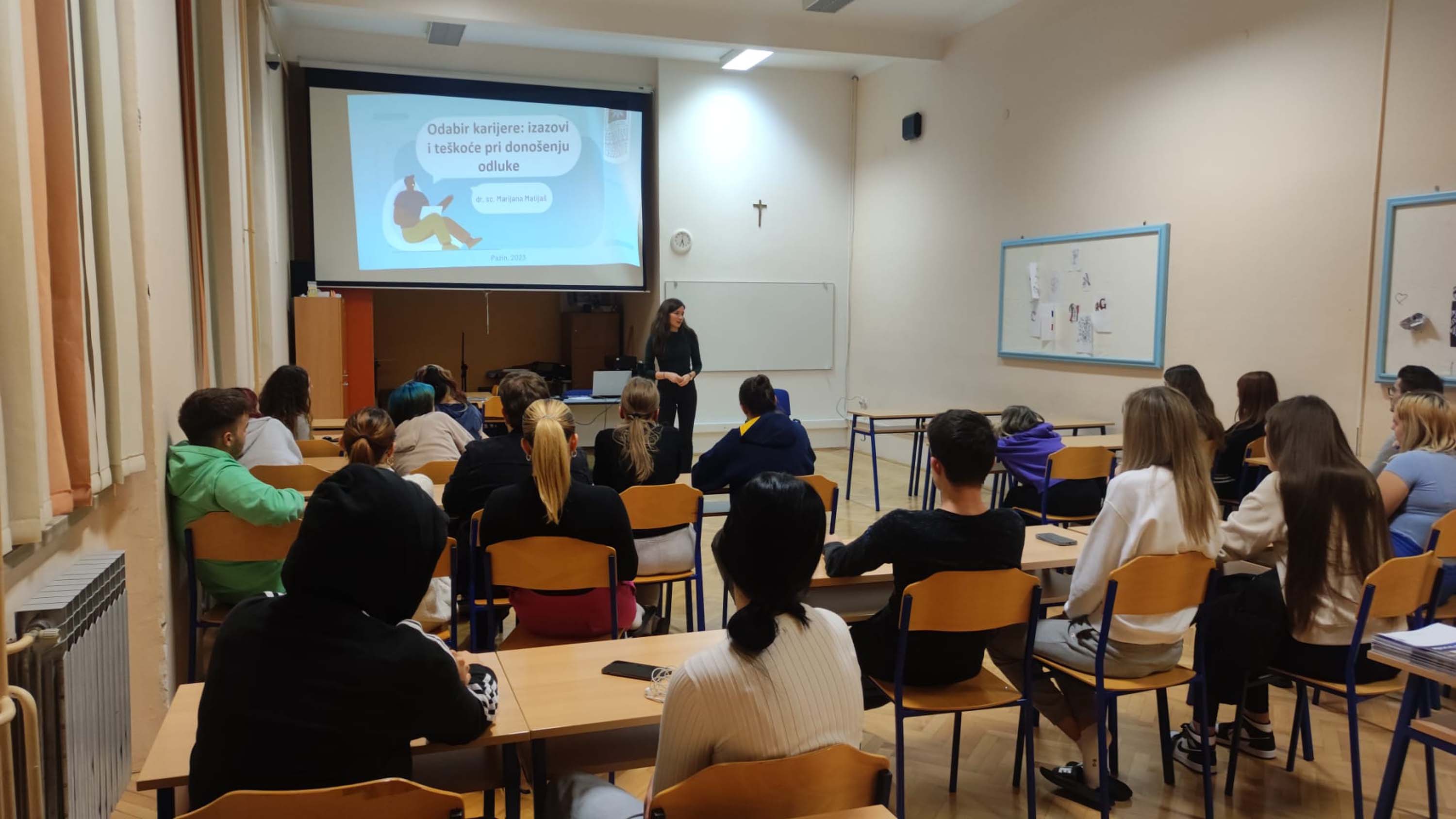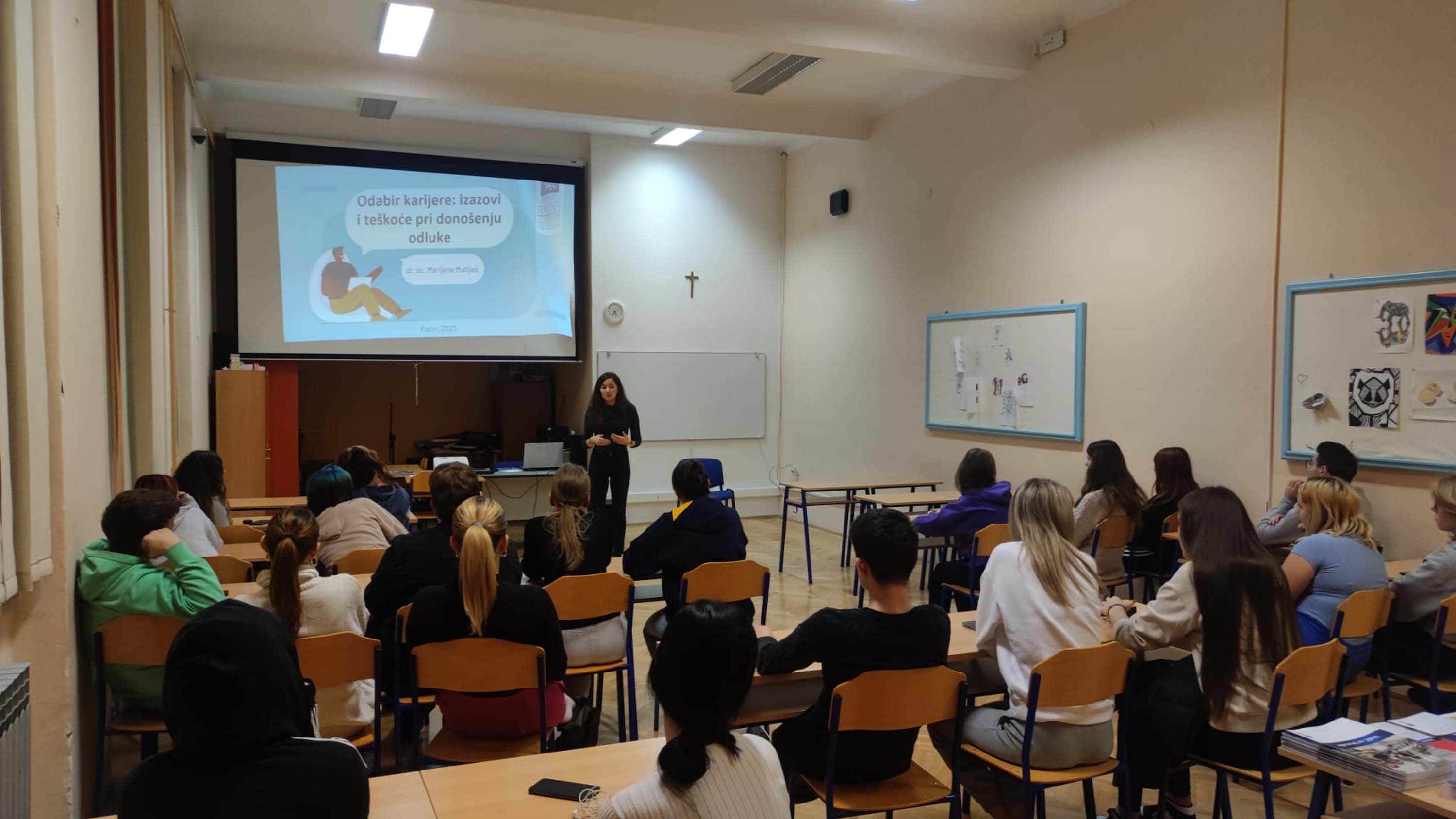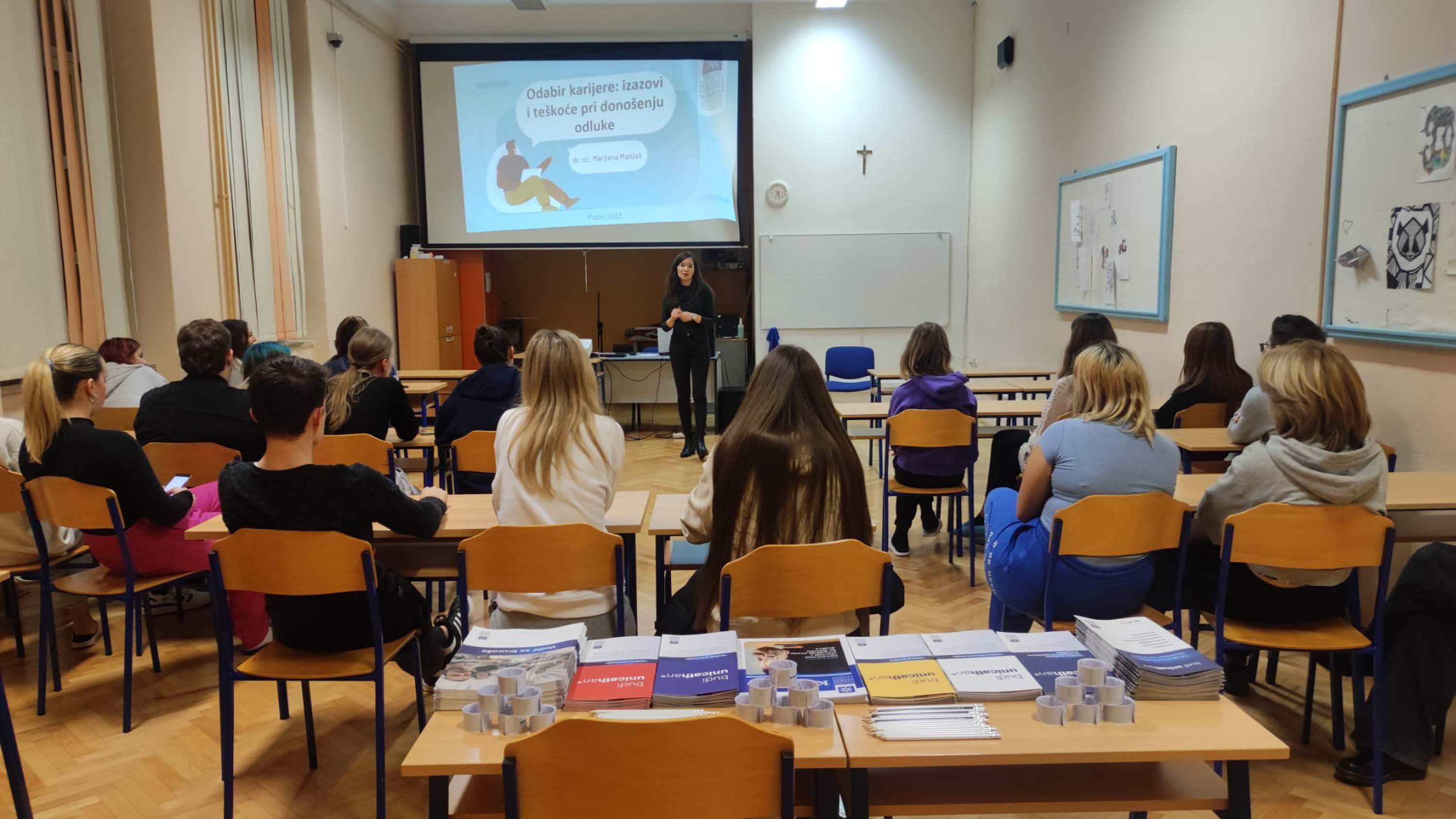 Istoga dana u Pazinskom kolegiju, za učenike trećih i četvrtih razreda dr. sc. Marijana Matijaš, viša asistentica sa Sveučilišnog odjela za psihologiju održala je predavanje Odabir karijere: izazovi i teškoće pri donošenju odluke. U interaktivnom predavanju viša asistentica Matijaš učenicima je pokazala koliko je odabir njihova budućeg poziva važan budući da će se odabranim zanimanjem baviti i raditi najveći dio svog života. Također, naglasila je koje su poteškoće onih učenika koji se „pronalaze u svemu“ i koji ne znaju u kojem smjeru prilikom odabira zanimanja krenuti.
