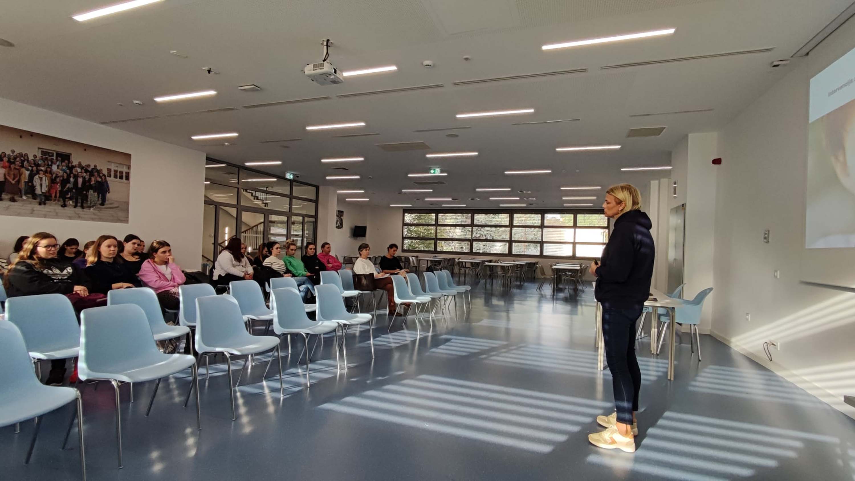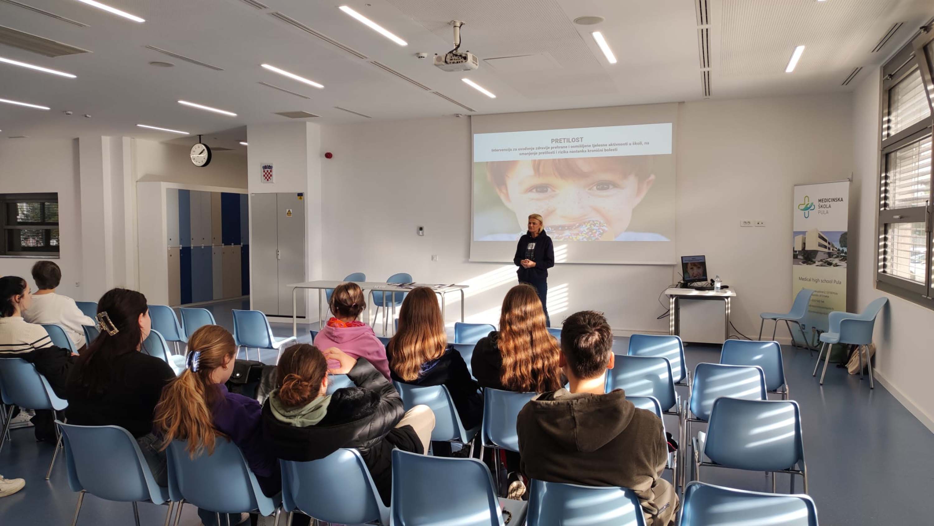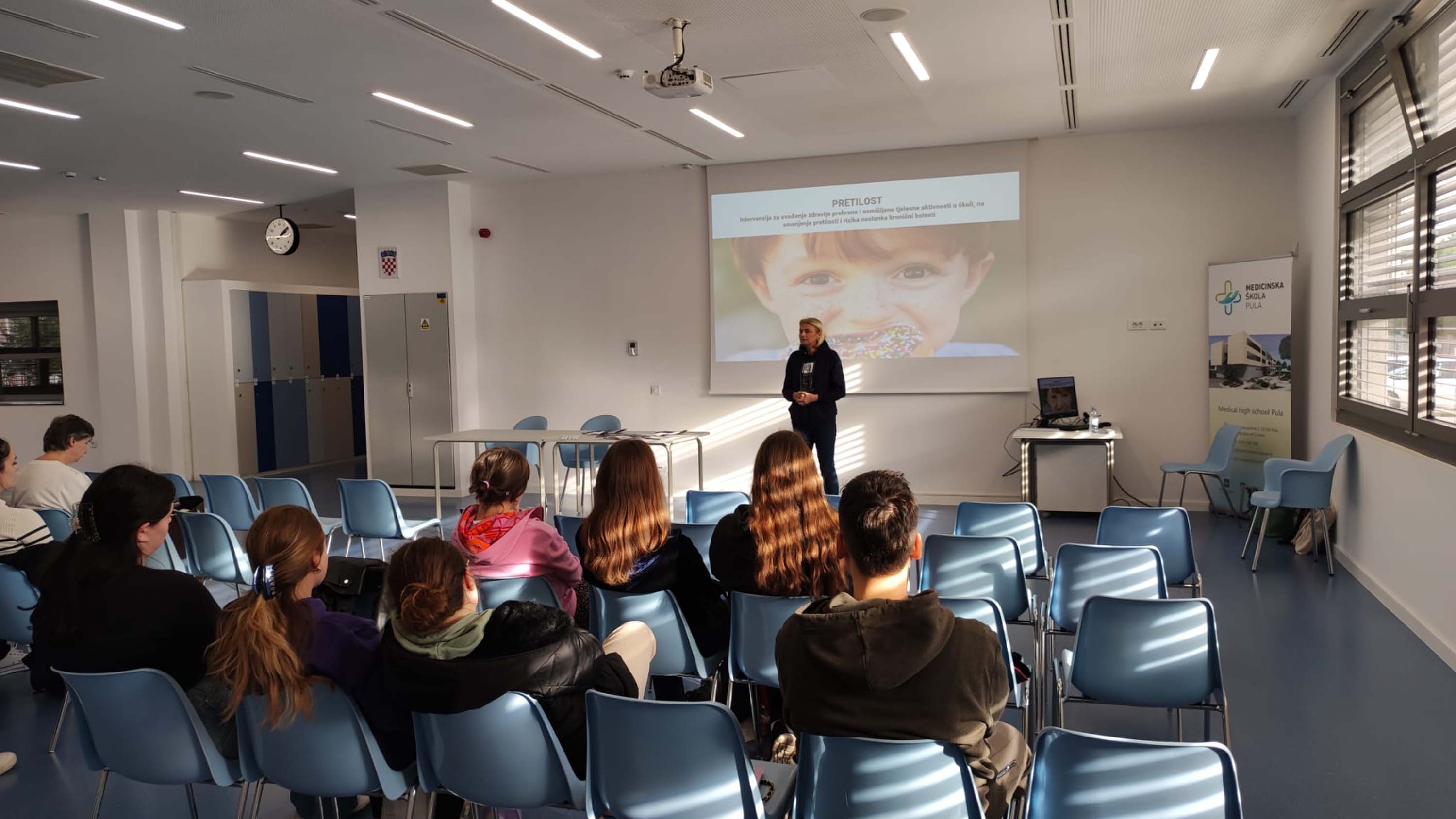 U četvrtak, 16. studenog 2023. viša predavačica Vesna Mijoč, mag. med. techn. sa Sveučilišnog odjela za sestrinstvo održala je predavanje u Medicinskoj školi Pula. Predavanjem Intervencija za uvođenje zdravije prehrane i osmišljene tjelesne aktivnosti u školi, na smanjenje pretilosti i rizika nastanka kroničnih bolesti predavačica Mijoč mladim kolegama iz struke željela je pokazati širok spektar poslova, zadataka i vještina koje kao budući sveučilišni magistri i magistre sestrinstva mogu obavljati i u kojima mogu sudjelovati kako bi se poboljšala kvaliteta života od vrtićke do najstarije životne dobi. Uz predstavljanje programa sveučilišnog studija Sestrinstvo predstavila je i posebnosti Medicinskog fakulteta Hrvatskog katoličkog sveučilišta s naglaskom na suvremeni program izvođenja studija po uzoru na poznata svjetska sveučilišta.