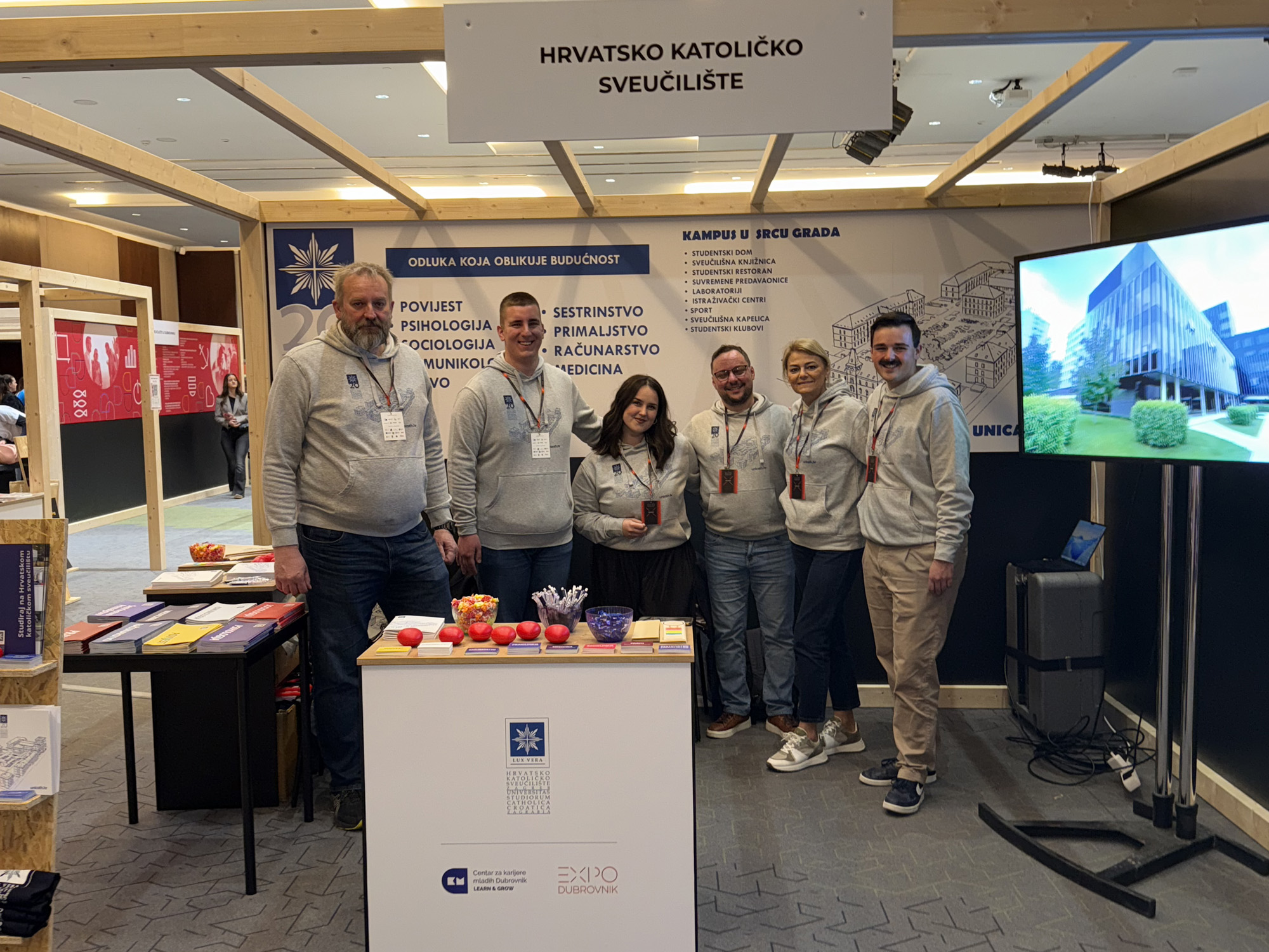 Naše Sveučilište po peti je put dalo svoju podršku ovoj hvalevrijednoj manifestaciji.  Brojnim zainteresiranim srednjoškolcima naše studije predstavili su studenti Adrijana Kikić i Nikola Budor sa Sveučilišnog odjela za povijest, Maroje Goga s Tehničkog fakulteta te nastavnici Jelena i Danijel Štifanić s Tehničkog fakulteta, prorektor za nastavu prof. dr. sc. Roko Mišetić, doc. dr. sc. Vesna Mijoč s Fakulteta zdravstvenih studija te dr. sc. Toni Ćosić sa Sveučilišnog odjela za sociologiju. Srednjoškolci su se zajedno s pokojim roditeljem, ali i profesorima u pratnji učenika, raspitivali o našim studijima. Između ostaloga, zanimali su ih uvjeti upisa, tijek studija i konačno mogućnosti buduće karijere nakon završenog studija.