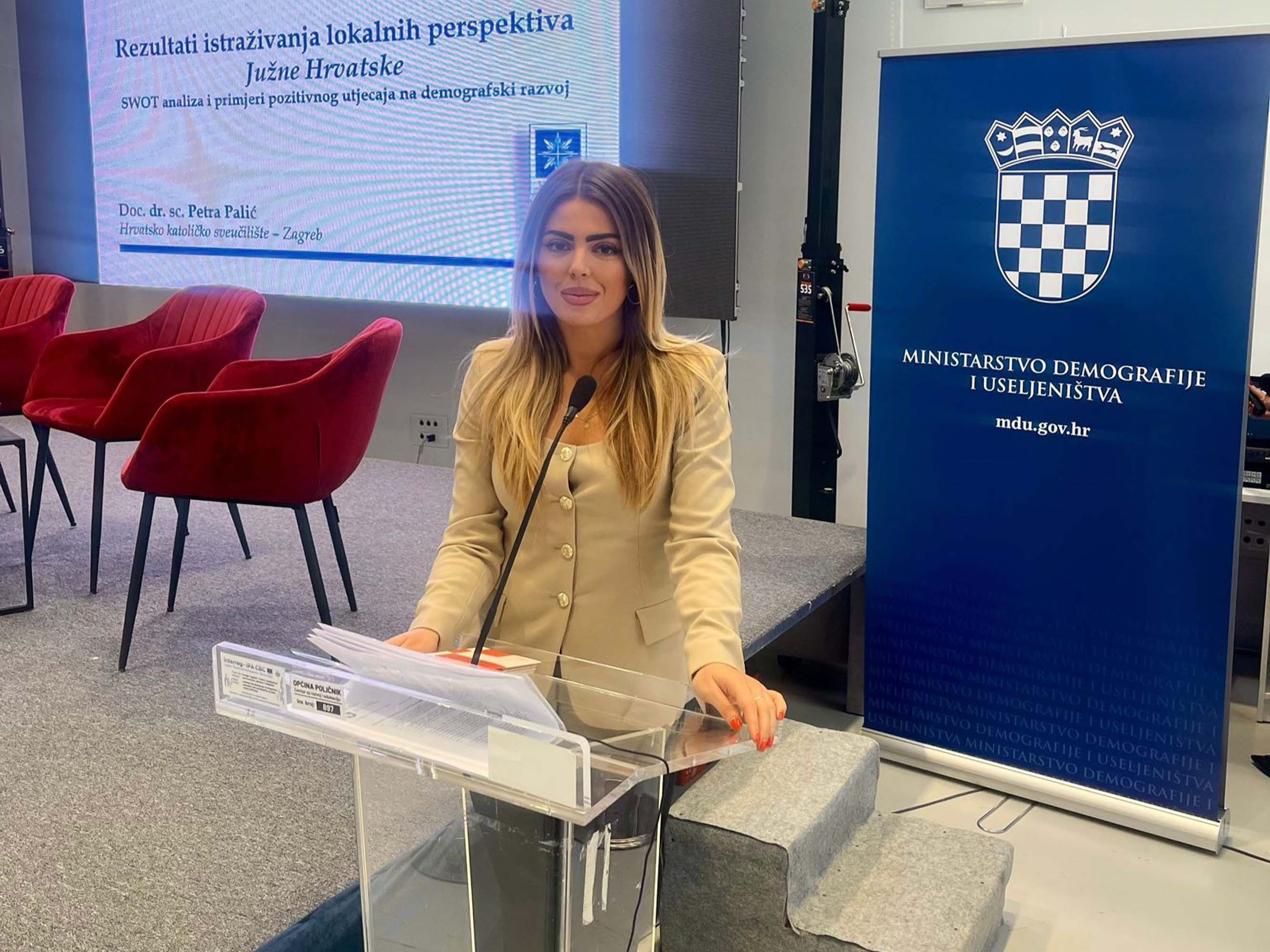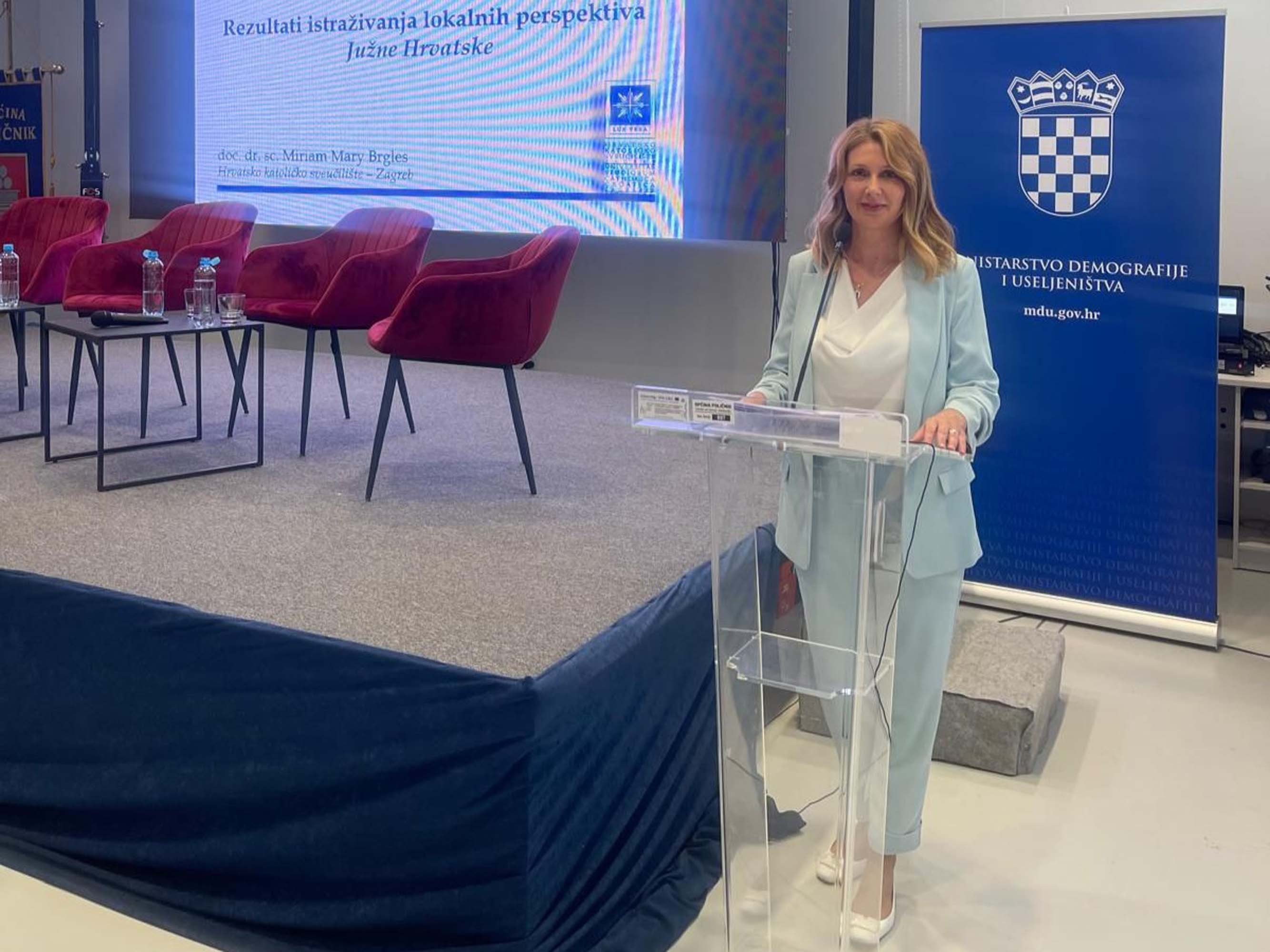 Uvodno je, o demografskim pokazateljima županija južne Hrvatske, govorila državna tajnica u Ministarstvu demografije i useljeništva Željka Josić, dok su doc. dr. sc. Miriam Mary Brgles i doc. dr. sc. Petra Palić predstavile rezultate anketnog istraživanja provedenog među čelnicima jedinica lokalne i područne samouprave.