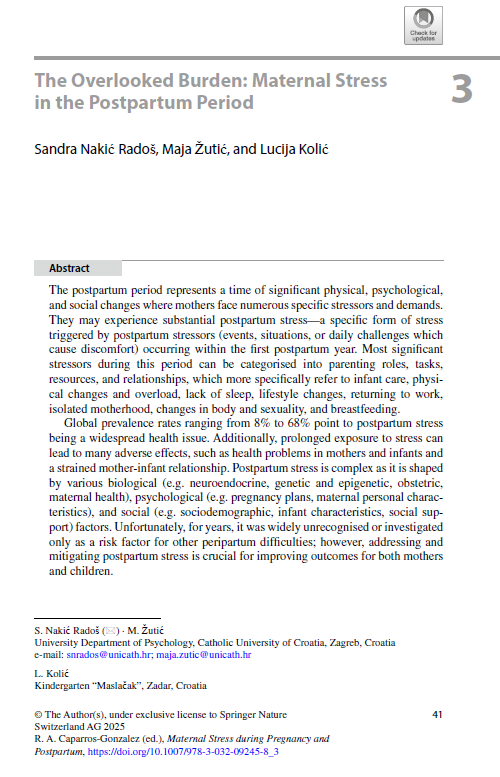 Nastavnice sa Sveučilišnog odjela za psihologiju, izv. prof. dr. sc. Sandra Nakić Radoš i dr. sc. Maja Žutić te alumna HKS-a Lucija Kolić, mag. psych., autorice su poglavlja u nedavno objavljenoj knjizi Maternal Stress during Pregnancy and Postpartum: Impact on Maternal Health and Fetal Development u izdavaštvu Springer Nature. Poglavlje nosi naslov The Overlooked Burden: Maternal Stress in the Postpartum Period i bavi se stresom u ranom majčinstvu, nedovoljno prepoznatom, ali izrazito učestalom teškoćom u prvoj godini nakon porođaja. Urednik knjige je Rafael A. Caparrós-González koji je ujedno i voditelj COST Akcije TREASURE gdje obje nastavnice aktivno sudjeluju. Knjiga je dostupna na poveznici.