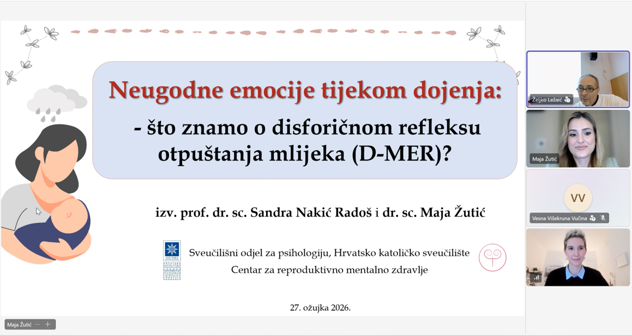Nakić Radoš i Žutić zajedno su održale predavanje na temu „Neugodne emocije tijekom dojenja: što znamo o disforičnom refleksu otpuštanja mlijeka (D-MER)?“ gdje su predstavile najnovije spoznaje o disforičnom refleksu otpuštanja mlijeka (D-MER). Radi se o nedovoljno istraženom, ali klinički značajnom fenomenu, karakteriziranim naglim valom intenzivnih neugodnih emocija prilikom otpuštanja mlijeka u majki. Osim teorijskog izlaganja, predstavile su i rezultate pionirskog istraživanja o tom fenomenu koje su provele u sklopu istraživačkog projekta koje je financiralo Hrvatsko katoličko sveučilište: „Odrednice, ishodi i međuodnos mentalnog i fizičkog zdravlja žena u trudnoći i nakon porođaja (MumHealth)”.
