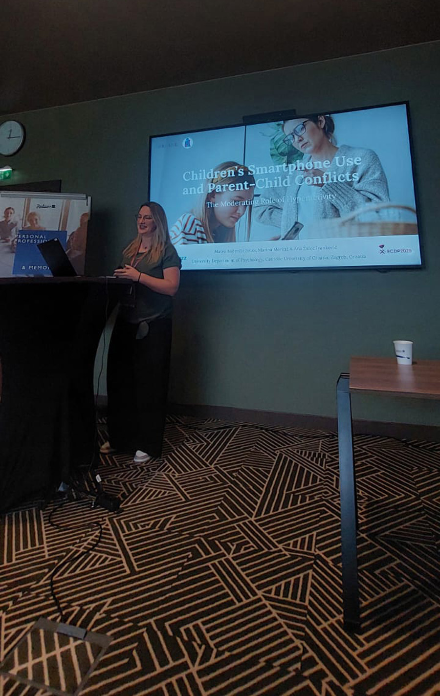 Asistentica Matea Bodrožić Selak, mag. psych., predstavila je rezultate longitudinalne studije provedene u okviru projekta Digitalna tehnologija u obitelji: obrasci ponašanja i učinci na razvoj djece (D.E.C.I.D.E.) putem usmenog izlaganja pod nazivom “Children’s Smartphone Use and Parent-Child Conflicts: The Moderating Role of Hyperactivity”.