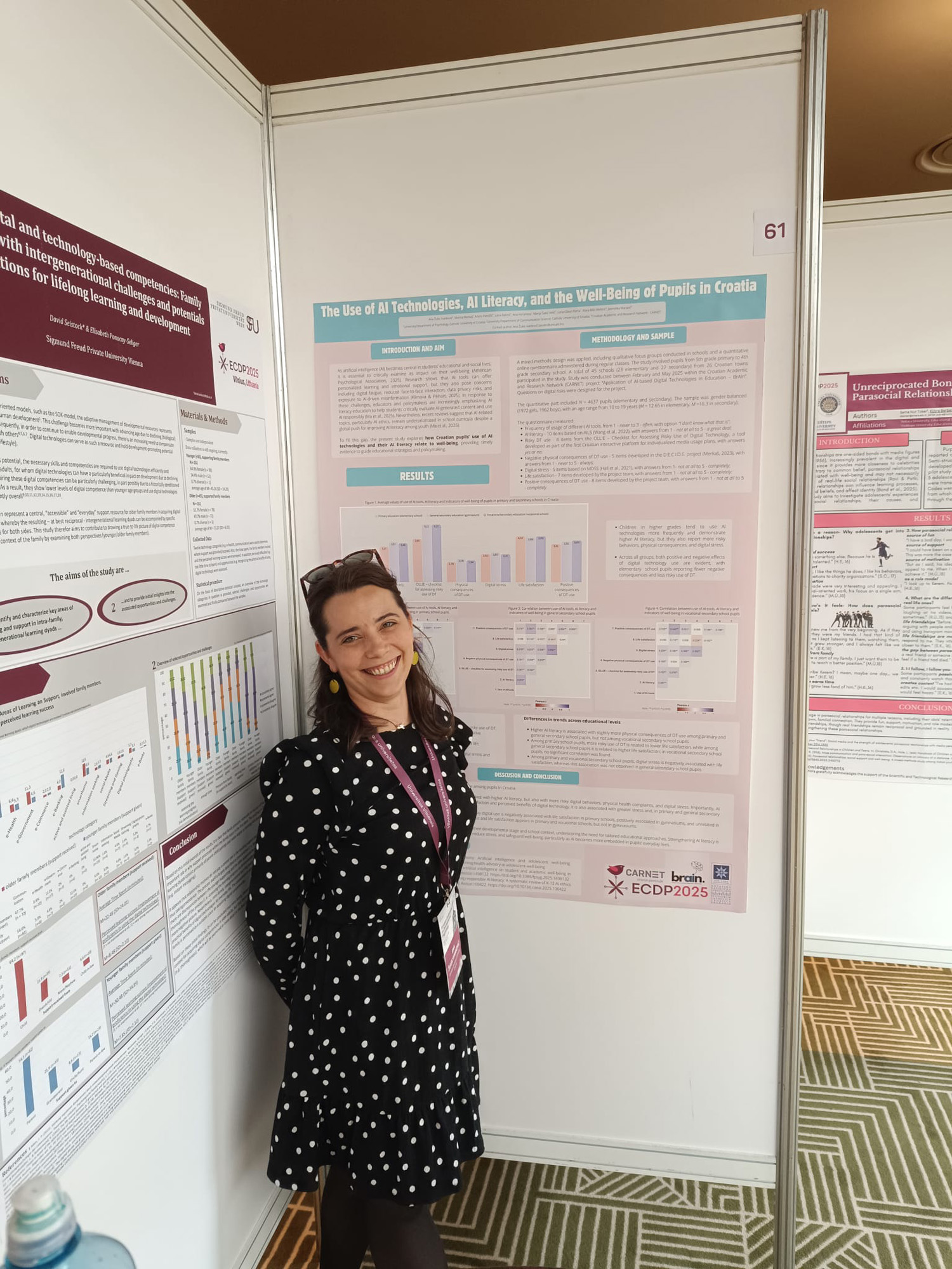 Dr. sc. Žulec Ivanković poster izlaganjem pod naslovom “The Use of AI Technologies, AI Literacy, and the Well-Being of Pupils in Croatia” predstavila je i dio rezultata pilot istraživanja provedenog u sklopu projekta Primjena digitalnih tehnologija temeljenih na umjetnoj inteligenciji u obrazovanju – BrAIn, a čiji je nositelj Hrvatska akademska i istraživačka mreža - CARNET.