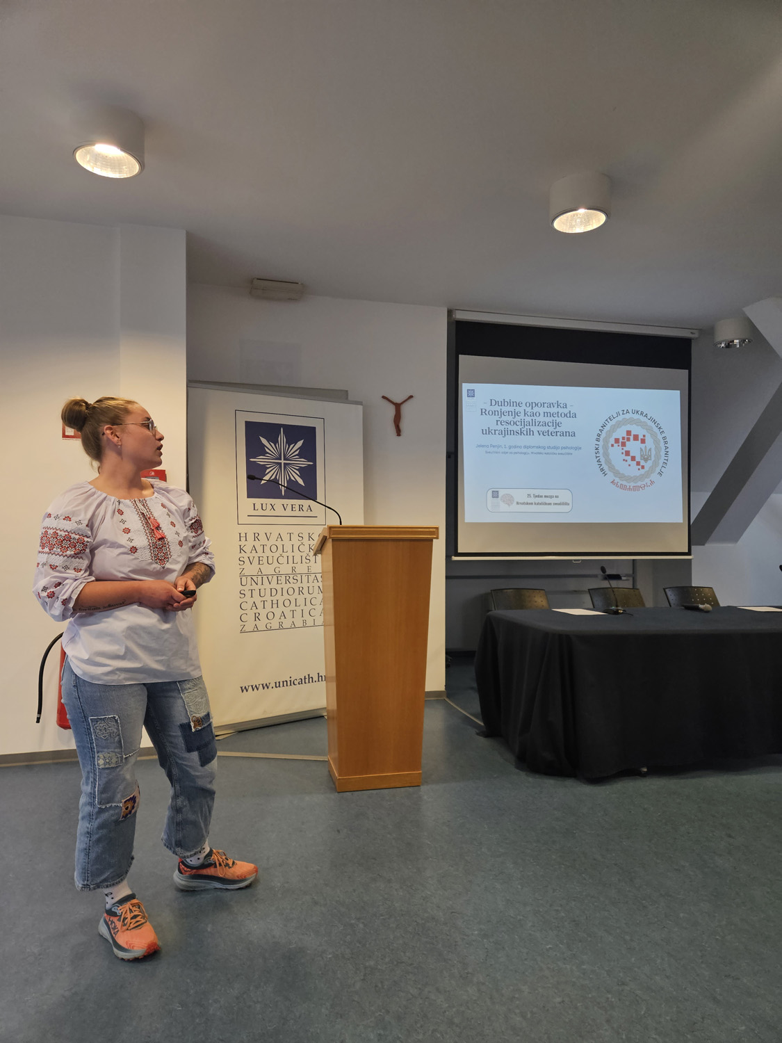 Posebno dojmljiv dio programa odnosio se na temu oporavka i resocijalizacije ukrajinskih branitelja. Naša studentica Jelena Penjin, univ. bacc. psych., u izlaganju Dubine oporavka – ronjenje kao metoda resocijalizacije ukrajinskih veterana, otvorila je važnu temu psihološke podrške i procesa oporavka u okviru programa ronjenja za ukrajinske branitelje nakon teških ratnih iskustava. Osobitu snagu programu dalo je i svjedočanstvo Serhiia Myla, ukrajinskog branitelja koji je uz pomoć prevoditeljice Anne Komarytsie, mag. philol., na snažan i neposredan način približio osobno iskustvo oporavka, otpornosti i ponovne integracije u svakodnevni život.