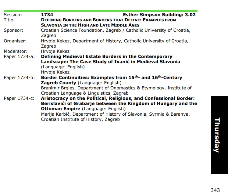 U sklopu sekcije na temu Defining Medieval Estate Borders in the Contemporary Landscape: The Case Study of Ivanić in Medieval Slavonia izlagao je izv. prof. dr. sc. Hrvoje Kekez, voditelj projekta, kao i dr. sc. Branimir Brgles, suradnik na projektu, koji je izložio temu naslovljenu Border Continuities: Examples from 15th- and 16th-Century Zagreb County.