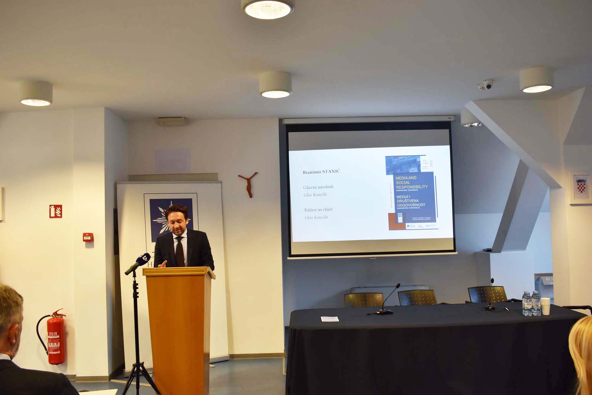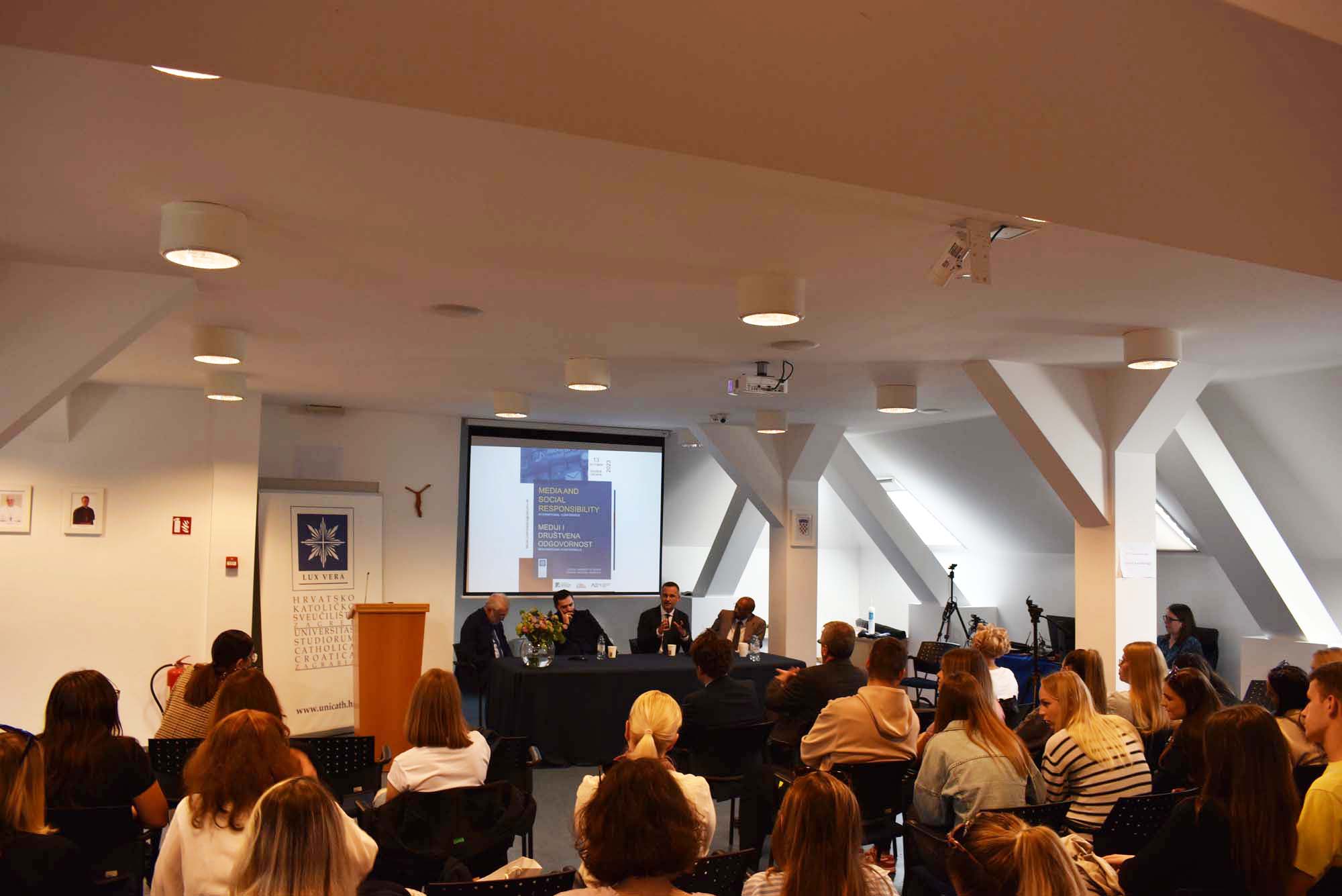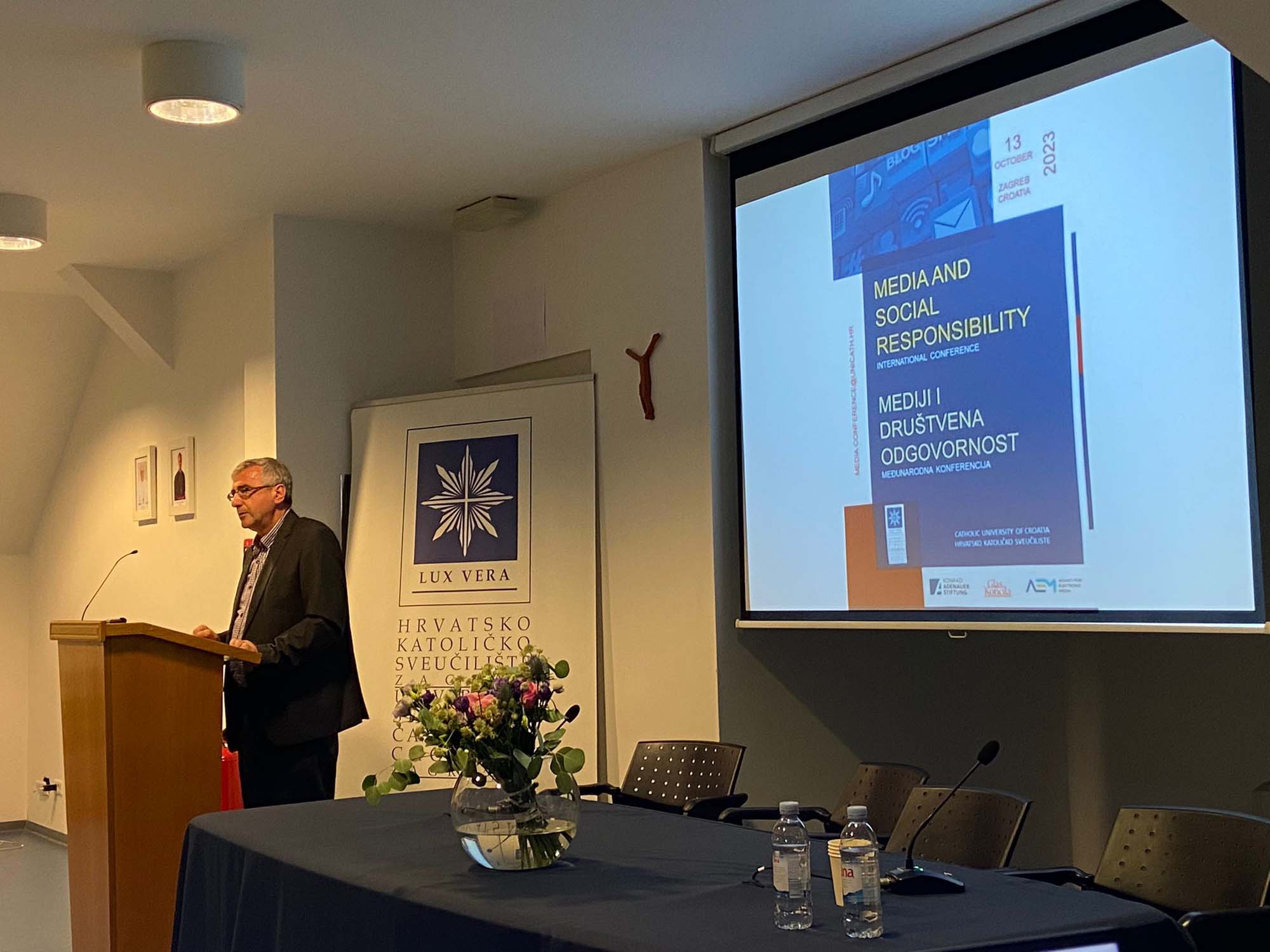 U petak 13. listopada 2023. Hrvatsko katoličko sveučilište bilo je domaćin međunarodne konferencije "Mediji i društvena odgovornost" koju je organizirao Sveučilišni odjel za komunikologiju Hrvatskog katoličkog sveučilišta pod pokroviteljstvom katoličkog tjednika Glas Koncila, Agencija za elektroničke medije te Zaklada Konrad Adenauer. U sklopu cjelodnevnog programa predstavljeno je 18 tema iz poručja medijske odgovornosti, povjerenja u medije, lažnih vijesti, medijske etike te drugih srodnih tema kroz pet plenarnih izlaganja, nakon čega su uslijedila izlaganja sudionika konferencije.