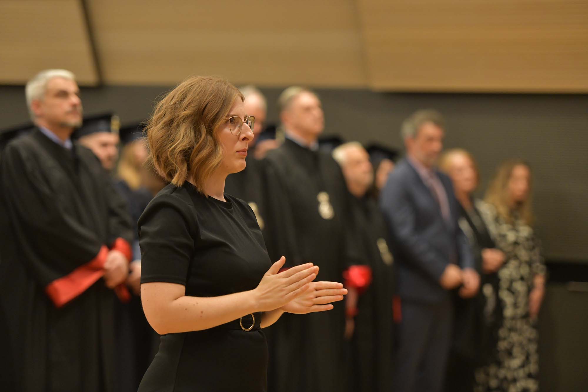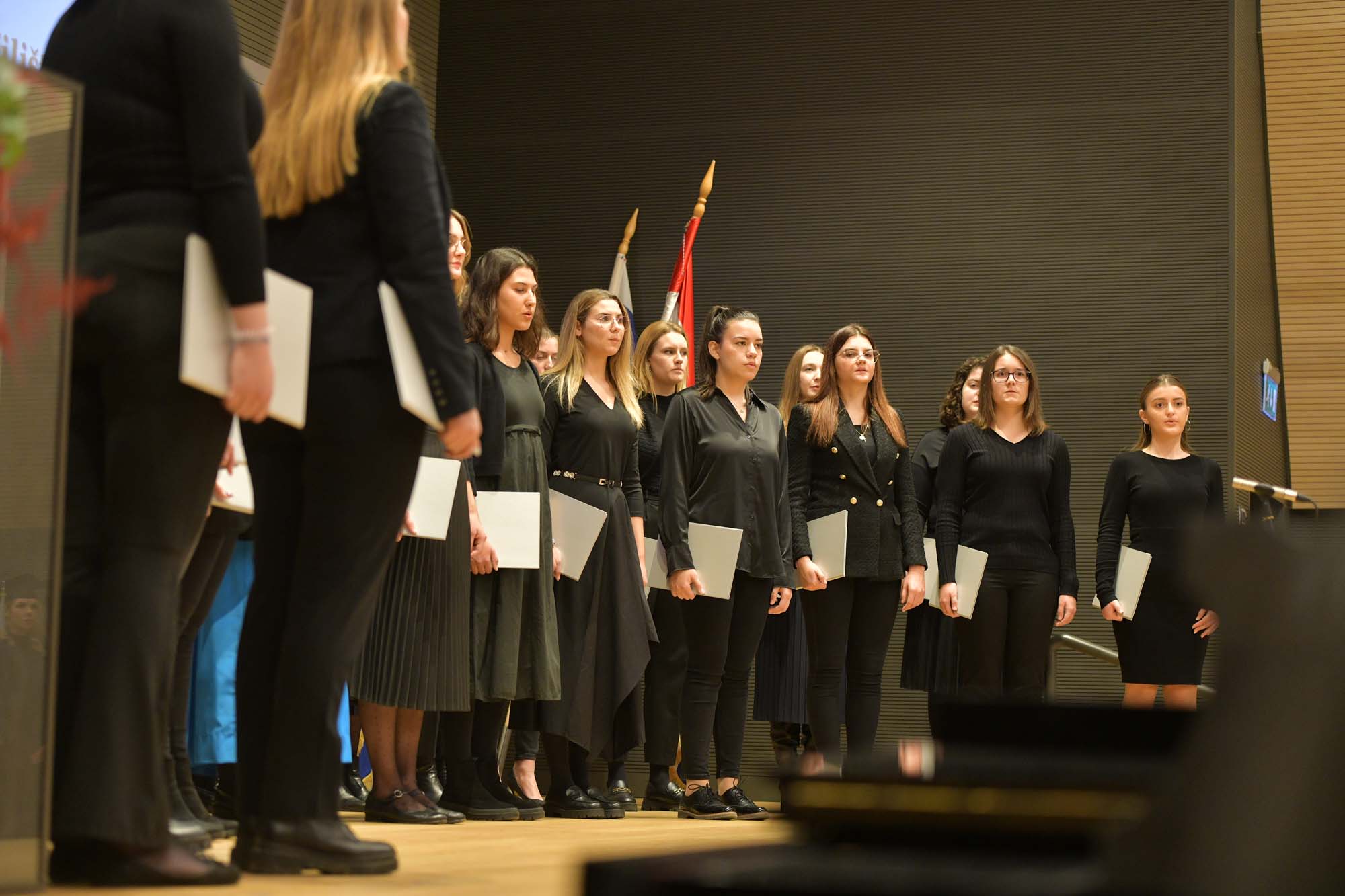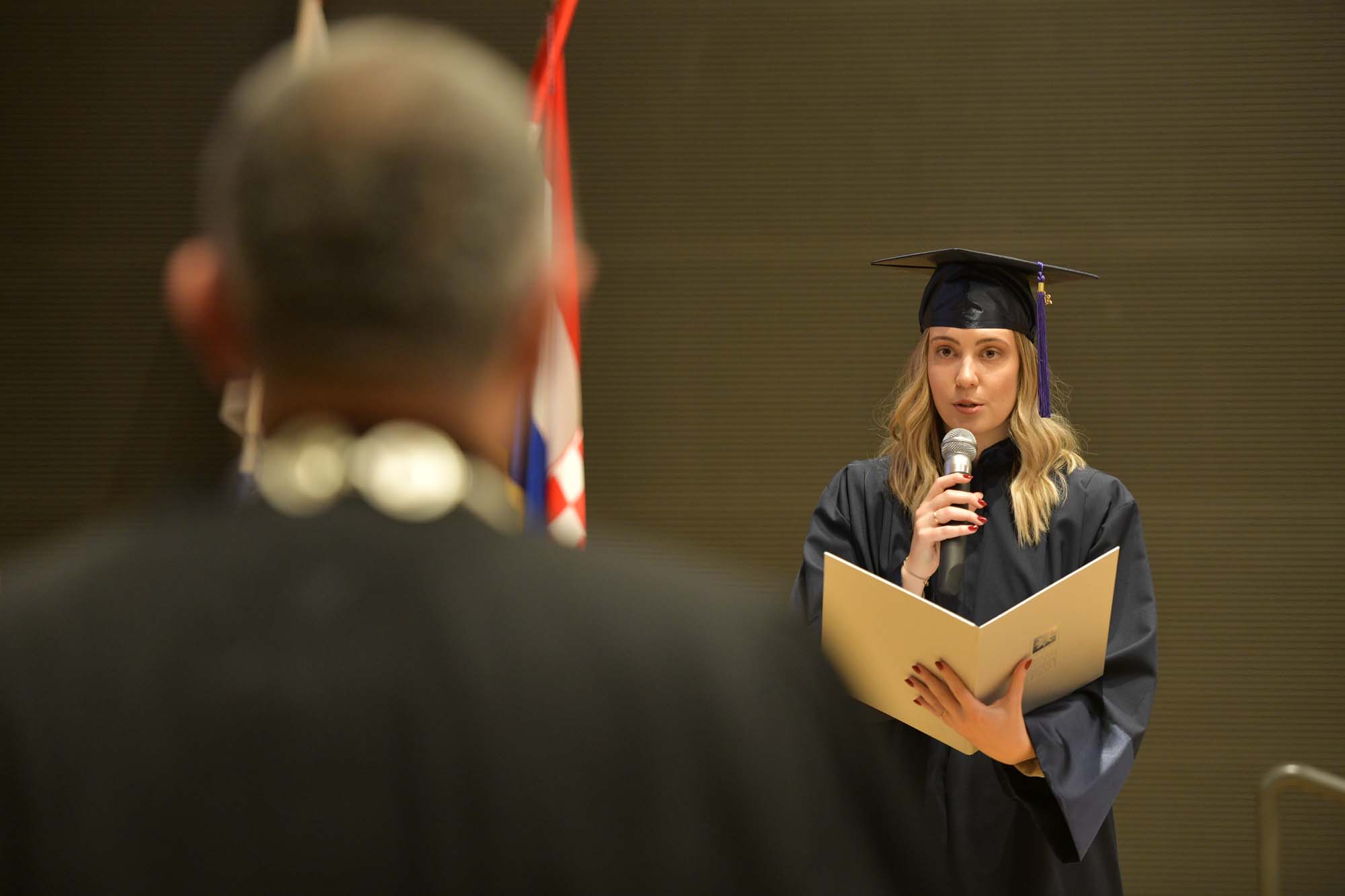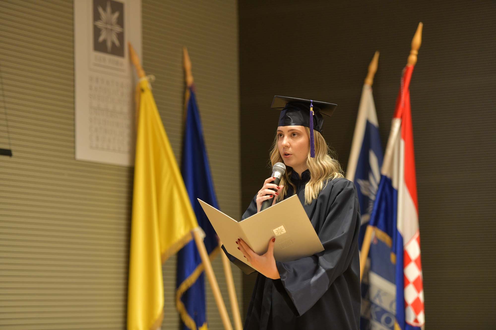 Svečanu prisegu u ime promovenata pročitala je Marta Kalenik s Odjela za psihologiju, zatraživši od Rektora u ime svojih kolegica i kolega i u svoje osobno ime da im podijeli magistarske diplome.