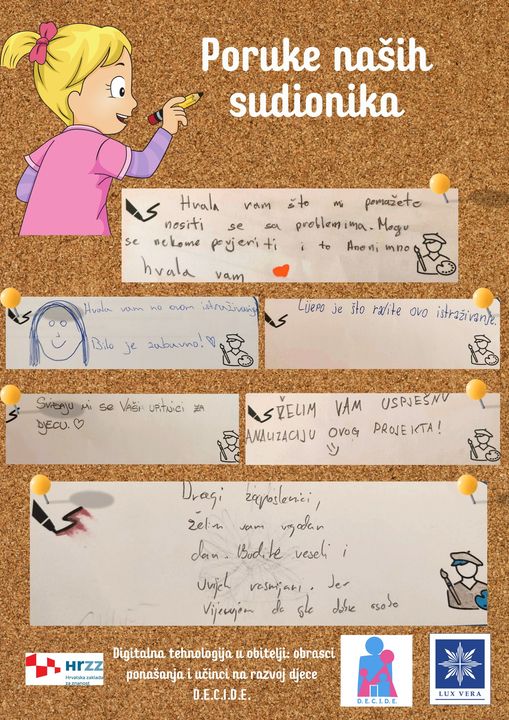 Ovim putem želimo se zahvaliti svoj djeci, njihovim roditeljima i razrednicima te stručnim suradnicima u školama koji su pristali sudjelovati u istraživanju. Radujemo se novim porukama u upitnicima koje pripremamo za 2. val istraživanja.