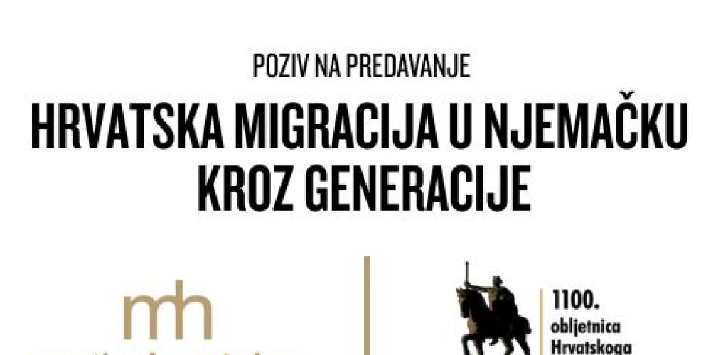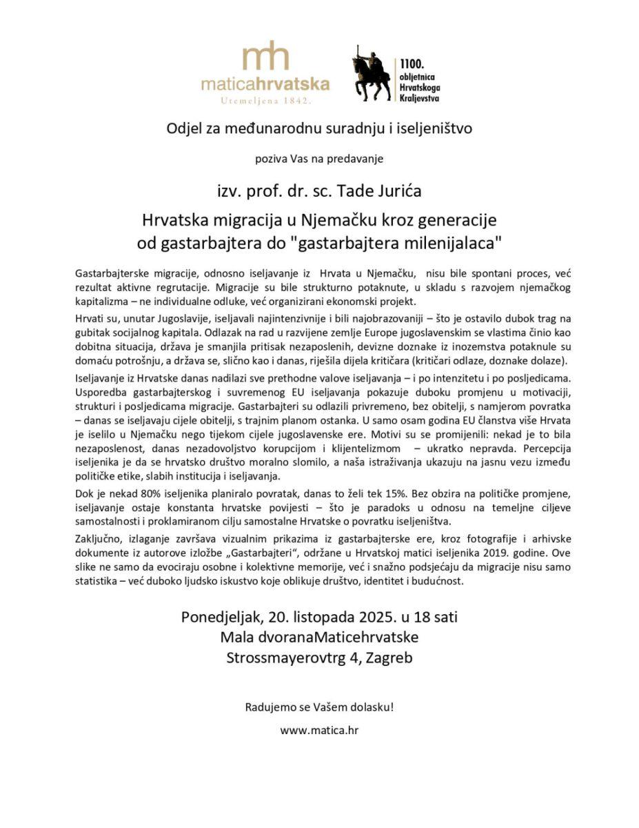 Večeras, 20. listopada 2025. u 18 sati, izv. prof. dr. sc. Tado Jurić sa Sveučilišnog odjela za povijest održat će predavanje "Hrvatska migracija u Njemačku kroz generacije - od gastarbajtera do »gastarbajtera milenijalaca«" u Maloj dvorani Matice hrvatske (Ul. Matice hrvatske 2, Strossmayerov trg 4, Zagreb).