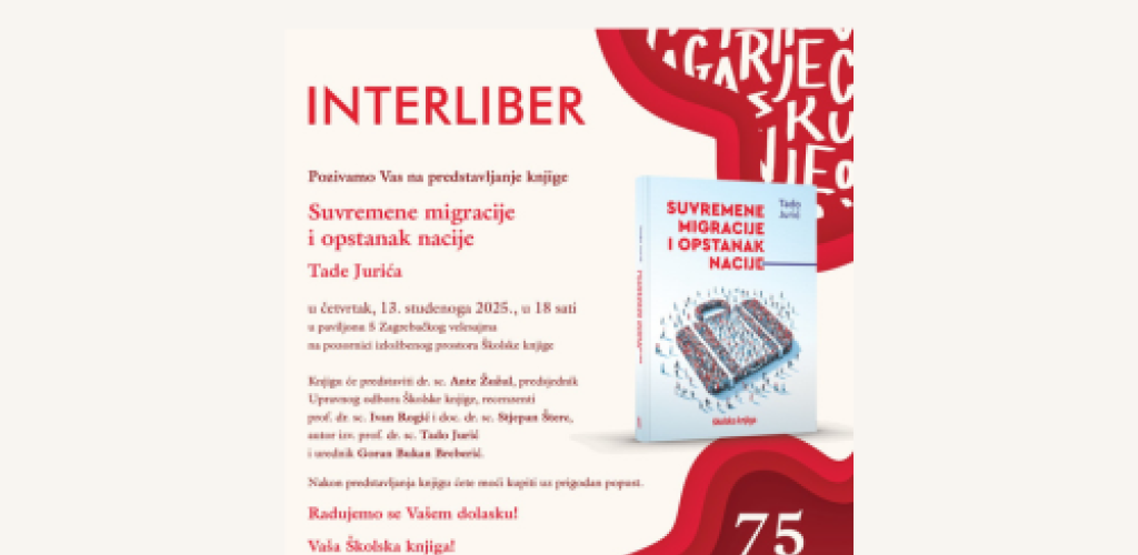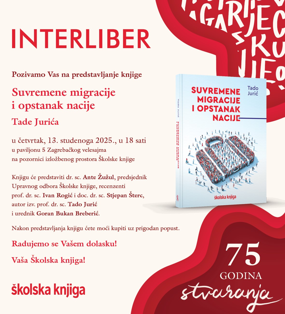 U četvrtak 13. studenoga 2025. u 18 sati izv. prof. dr. sc. Tado Jurić sa Sveučilišnog odjela za povijest predstavit će svoju knjigu "Suvremene migracije i opstanak nacije" na ovogodišnjem izdanju Interlibera.