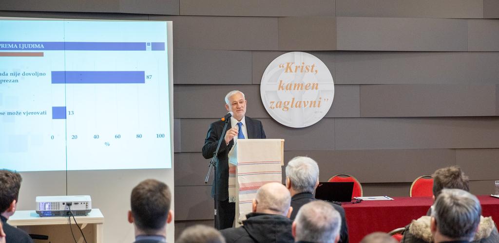 Poručio je i kako suvremeni svijet gubi želju za dijalogom te ga zamjenjuje polemikom u kojoj je cilj pobijediti protivnika, a ne doći do zajedničkog razumijevanja. U nastavku je predstavio podatke koji se odnose na razdoblje od 1999. do 2018., a tiču se povjerenja Hrvata prema institucijama, uključujući Crkvu, religioznost stanovništva, odlazak na misu, osobnu molitvu i slično.