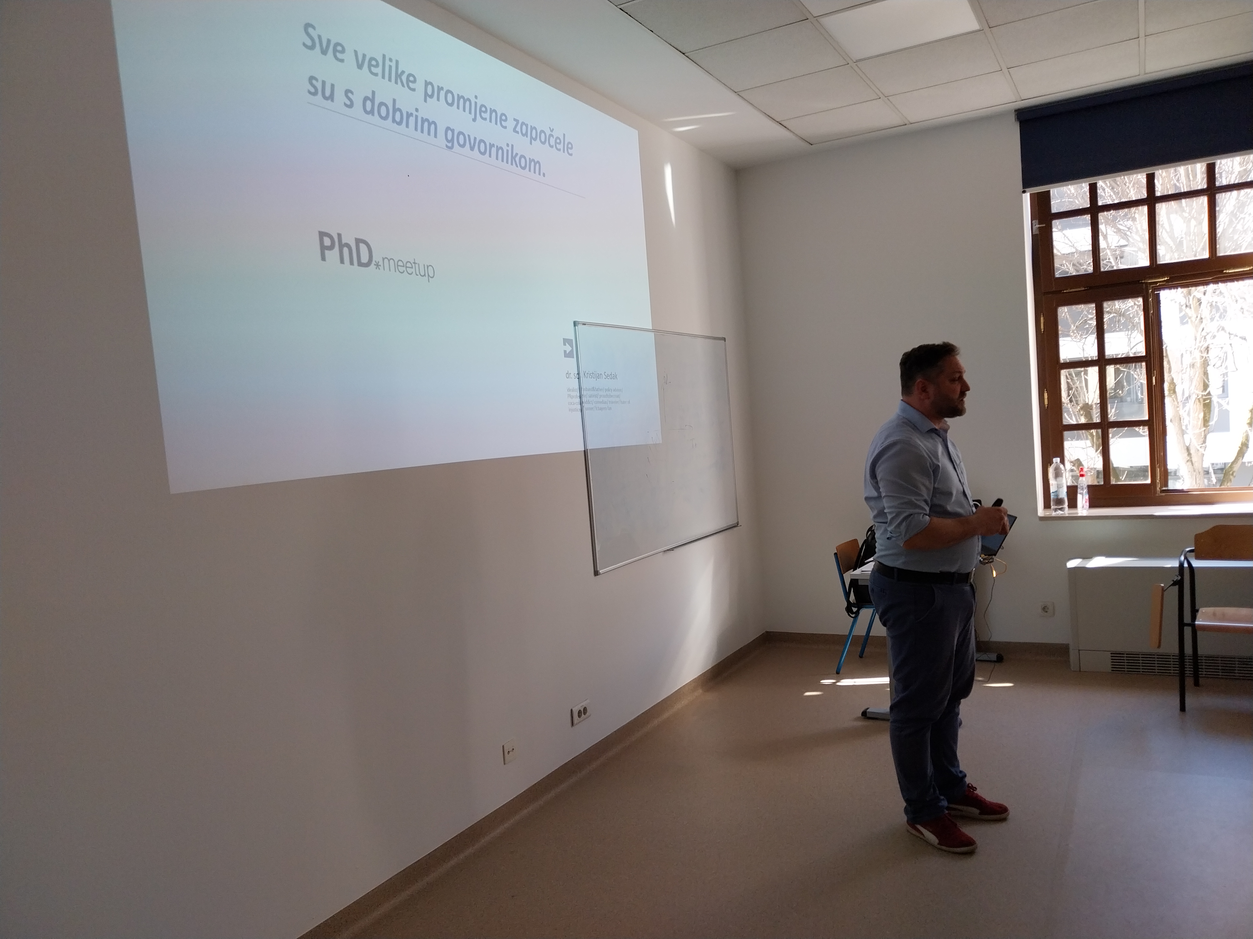 U srijedu 22. ožujka 2023. održan je novi PhD.meetup susret. Dr. sc. Kristijan Sedak prenio je svojim kolegama znanja o javnom nastupu u izlaganju pod nazivom Znanost bez dosade – kako zanimljivo i angažirano prezentirati istraživanje. Kroz zabavno i interaktivno predavanje, naši mladi znanstvenici imali su prilike naučiti nove trikove za uspješno prezentiranje svog znanstvenog rada. Budno ćemo pratiti njihova iduća izlaganja kako bismo vidjeli koliko su pažljivo slušali te koliko će dosljedno primjenjivati naučeno.