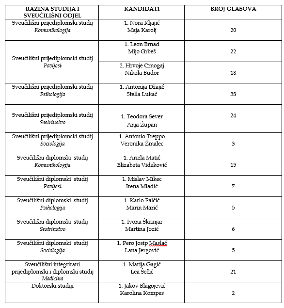 Od 196 popunjenih e-glasačkih listića, 10 birača je odabralo da se ne želi izjasniti. Privremeni rezultati izbora, a koje donosimo u nastavku, bit će objavljeni na mrežnim stranicama i oglasnoj ploči Sveučilišta.