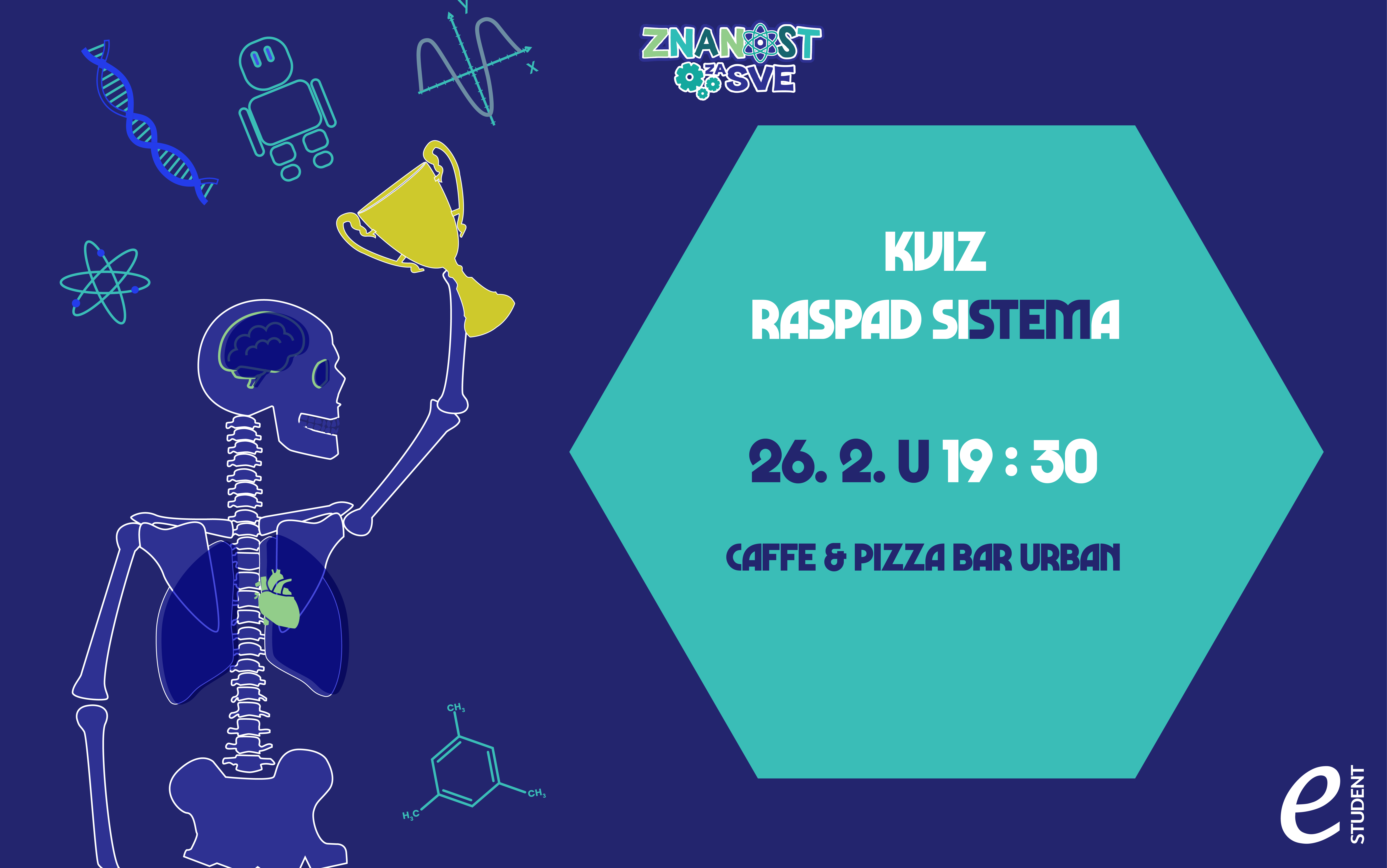 U sklopu projekta Znanost za sve, eSTUDENTov tim Popularizacija znanosti donosi još jedno izdanje znanstveno-popularnog kviza Raspad siSTEMa. Kviz je namijenjen studentima svih fakulteta koji žele testirati svoje znanje i zakoračiti u čudesni svijet znanosti. Ovo je iznimna prilika da pokažeš znanje u STEM području i sudjeluješ u kvizu prepoznatljivom po super atmosferi i druženju. Sastavi ekipu od 2 do 4 člana i dođite u Caffe & pizza bar Urban u četvrtak 26. veljače u 19:30 sati.