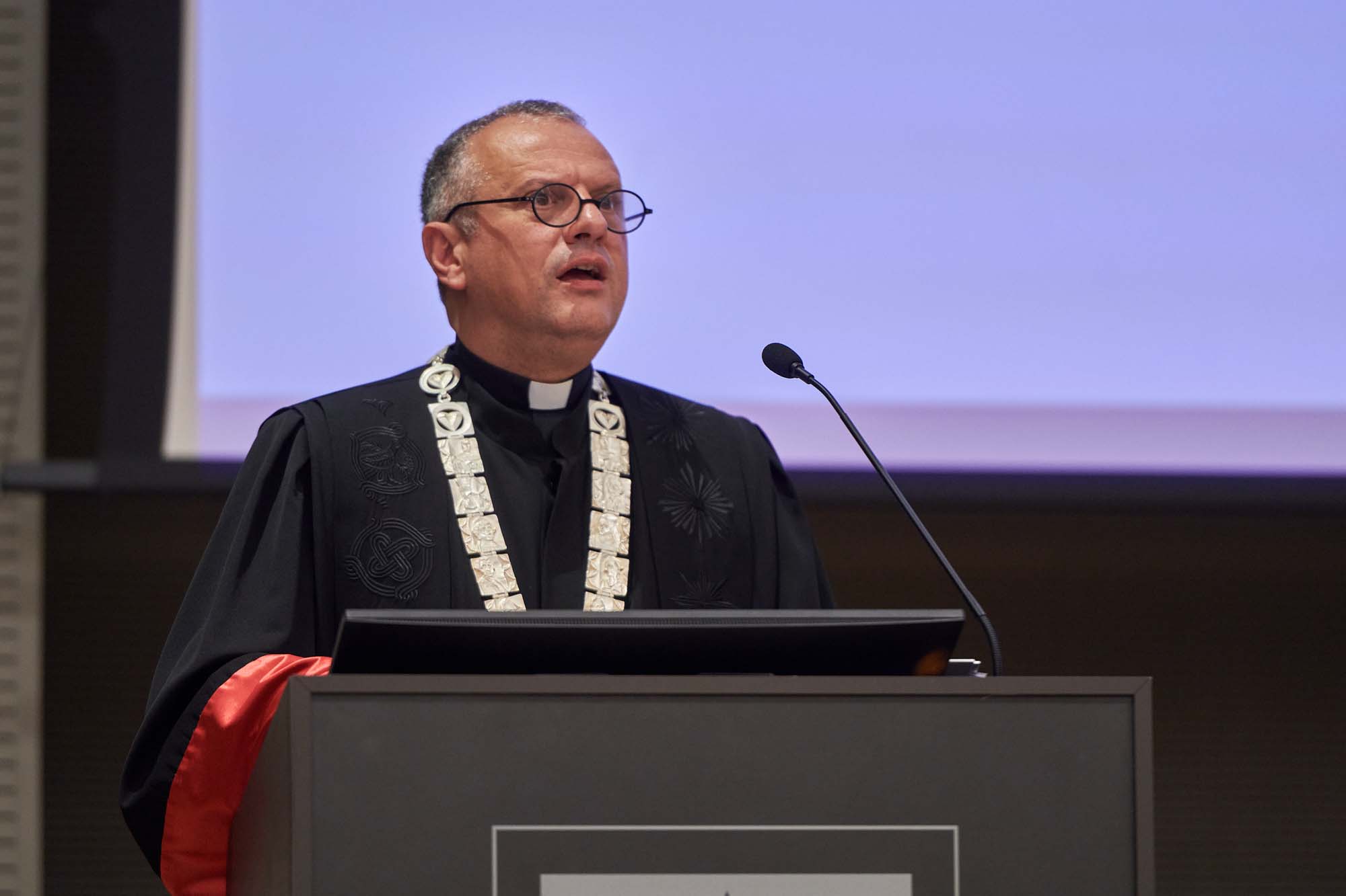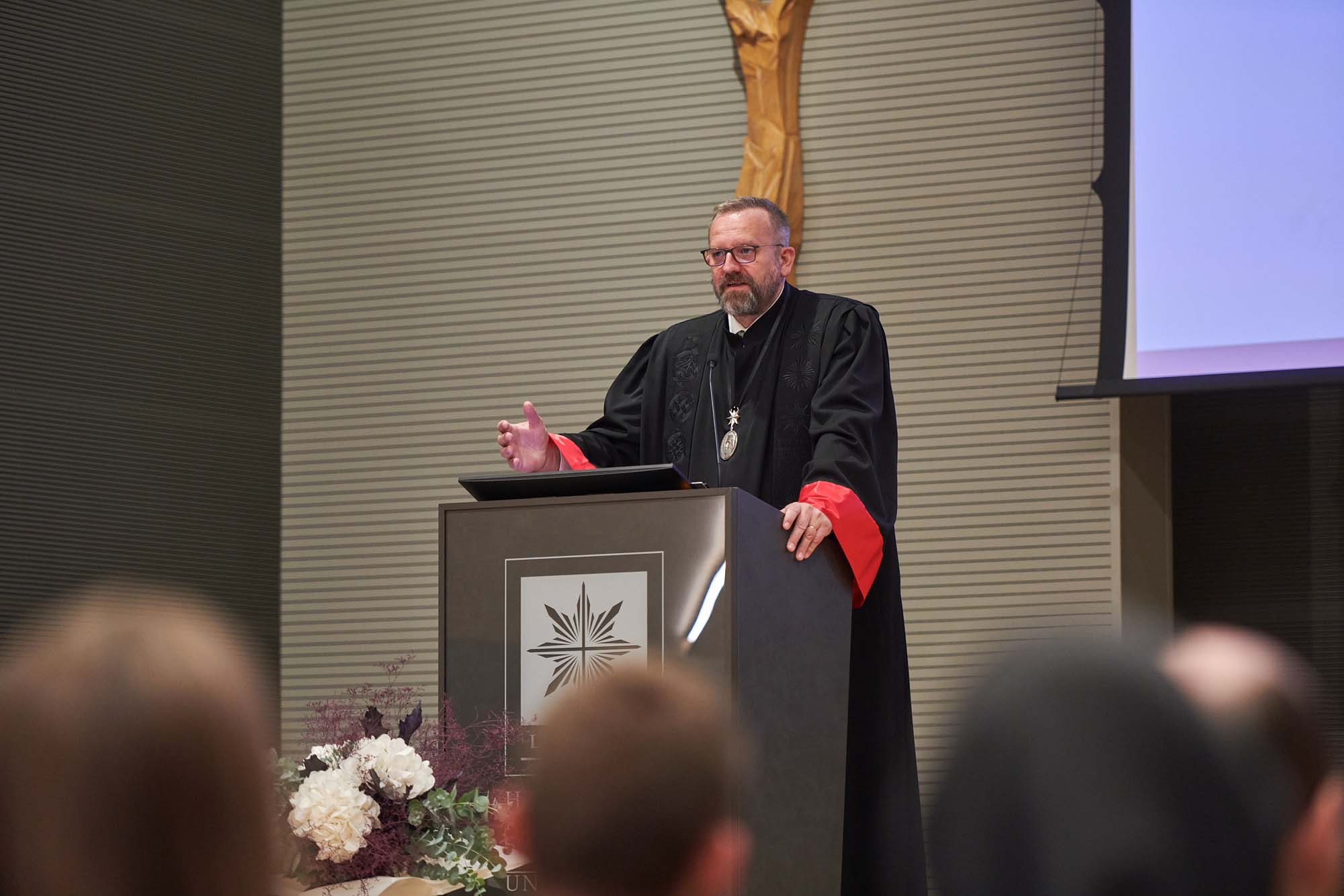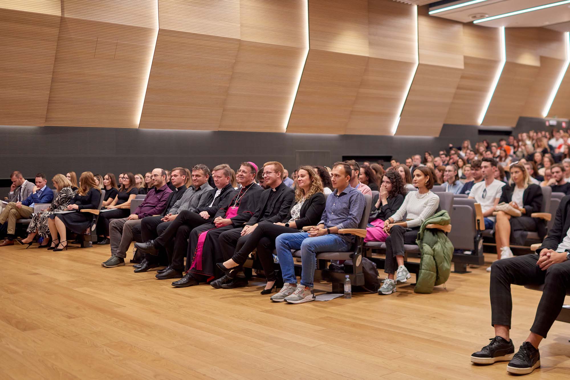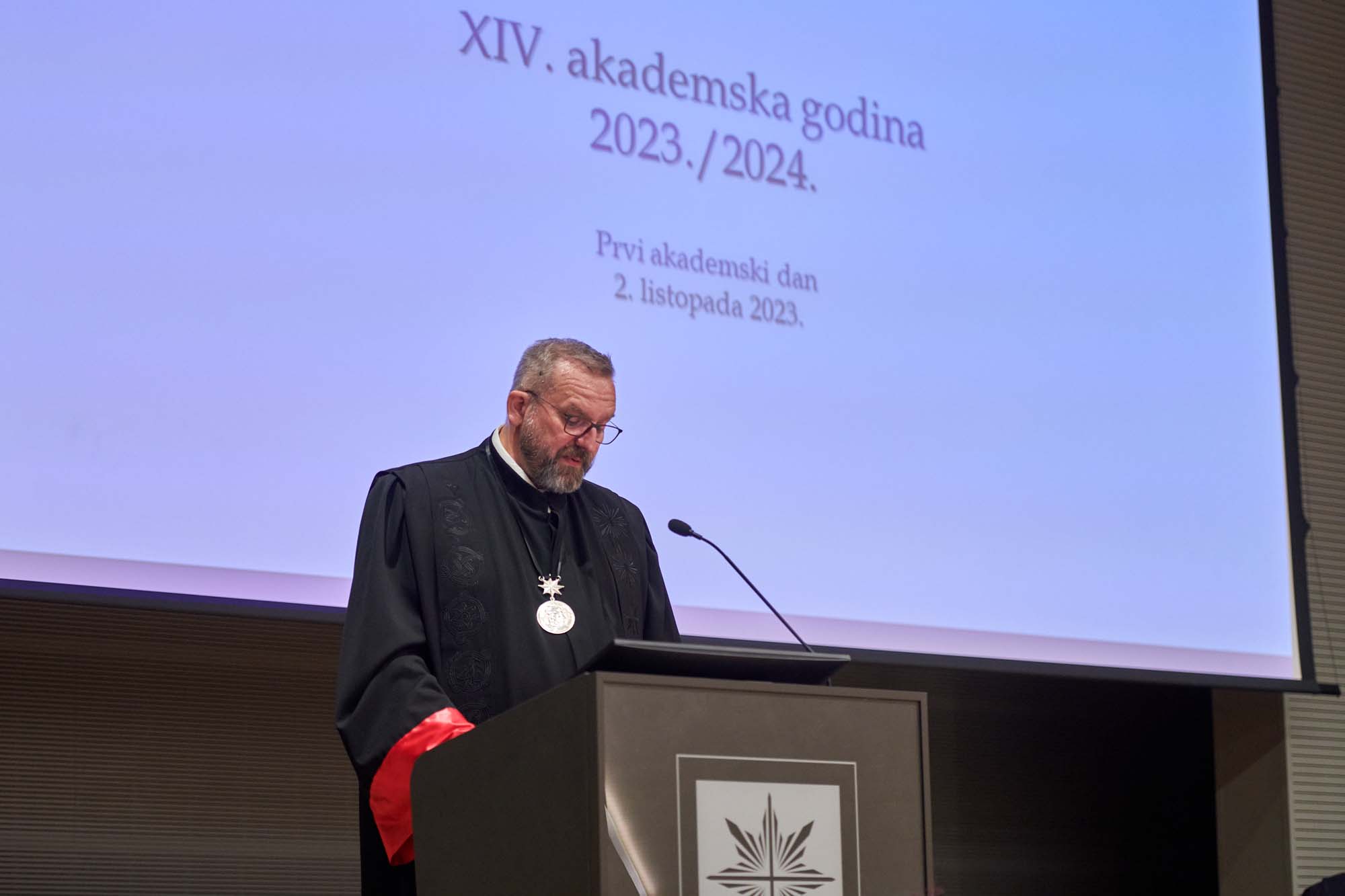 U ime čitave akademske zajednice Hrvatskog katoličkog sveučilišta sve okupljene pozdravio je prof. dr. sc. Željko Tanjić, rektor Hrvatskog katoličkog sveučilišta, zahvalivši im što su izabrali Hrvatsko katoličko sveučilište za mjesto svog studiranja. "U središte rada Hrvatskog katoličkog sveučilišta stavljamo naše studente i njihovo znanje, njihov studij, ali i odgojnu i duhovnu dimenziju koja je potrebna za njihovu svakodnevicu i za njihov budući život. Našim studentima želimo prenijeti poruku da je učenje i znanost bitna, ali da je sveučilište i prostor promišljanja, traženje puta razvoja cjelokupne osobe. Stoga su, osim nastave, u ponudi Sveučilišta mnoge aktivnosti, ali i ponuda Sveučilišne kapelanije. Naš sveučilišni kapelan velečasni Branimir brine za duhovni život i na raspolaganju vam je za vaš duhovni rast, kao i svi mi svećenici na Sveučilištu. Naš je cilj također ponuditi studentima izvrsnost. Izvrsnost se manifestira kroz naše studijske programe, odnos prema studentima, posvješćivanje primljenog znanja i njegove primjenjivosti u svakodnevnom životu... Odgojna i duhovna dimenzija, izvrsnost, male grupe, povezanost – sve je to dio naše unicathnosti po čemu se mi razlikujemo od drugih Sveučilišta. Želja nam je da do odgojne i obrazovne izvrsnosti dođemo zajedno. Zato, radujmo se zajedno rastu našeg Sveučilišta, novim programima, projektima i aktivnostima i neka nam je sretna i blagoslovljena ova 14. akademska godina na našem Sveučilištu!", zaključio je rektor.