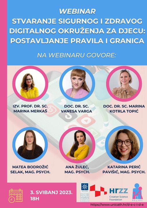 Na našem webinaru govorit će članice tima projekta D.E.C.I.D.E., a odgovorit će na neka od važnih pitanja te na pitanja koja ste postavili, poput toga koje bi bilo preporučeno vrijeme korištenja pametnih telefona za djecu, je li dobro za razvoj djece da koriste pametne telefone tijekom prve dvije godine života i hoće li igranje igrica naštetiti razvoju djece.