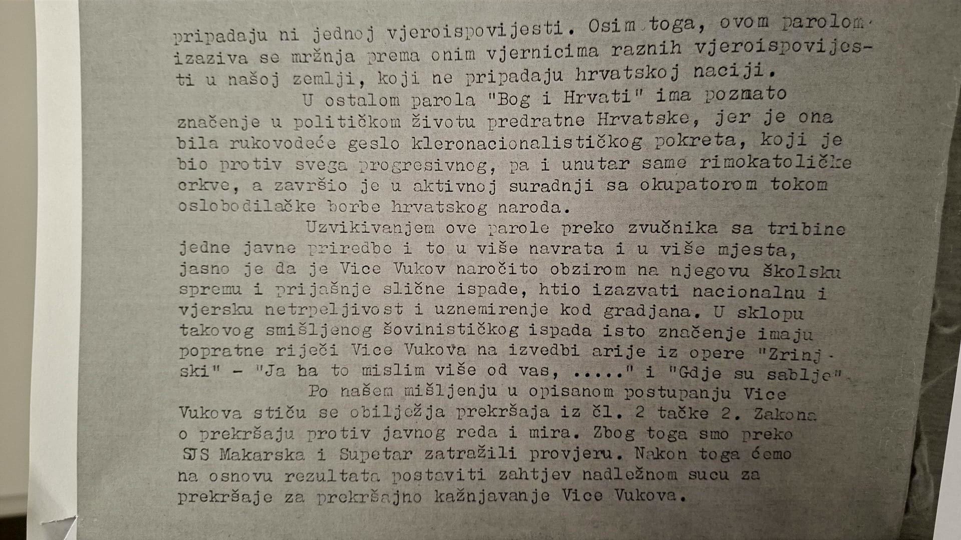 Drugi je vid politički motivirane dekontekstualizacije koju sadržava Prvanovo objašnjenje jednako važan. Da bi uputio na navodnu Vukovljevu krivnju okružni tužitelj identificira skupine koje su se izgovorom parole mogle osjetiti povrijeđenih osjećaja. To su: Hrvati ateisti ili agnostici i pripadnici drugih vjeroispovijesti koji nisu Hrvati. Tvrdnja je evidentno krajnje proizvoljna budući da podrazumijeva da je u publici bilo takvih osoba i da ih je izgovorena parola uvrijedila. Dokaze za iznesene tvrdnje međutim Prvan ne donosi. Gotovo u pravilu kad je riječ o politički motiviranim procesima iz vremena komunističke Hrvatske u optužbu se unose pojedinci i skupine koji su se navodno osjetili ili mogli osjetiti uvrijeđenim izgovorenim riječima.