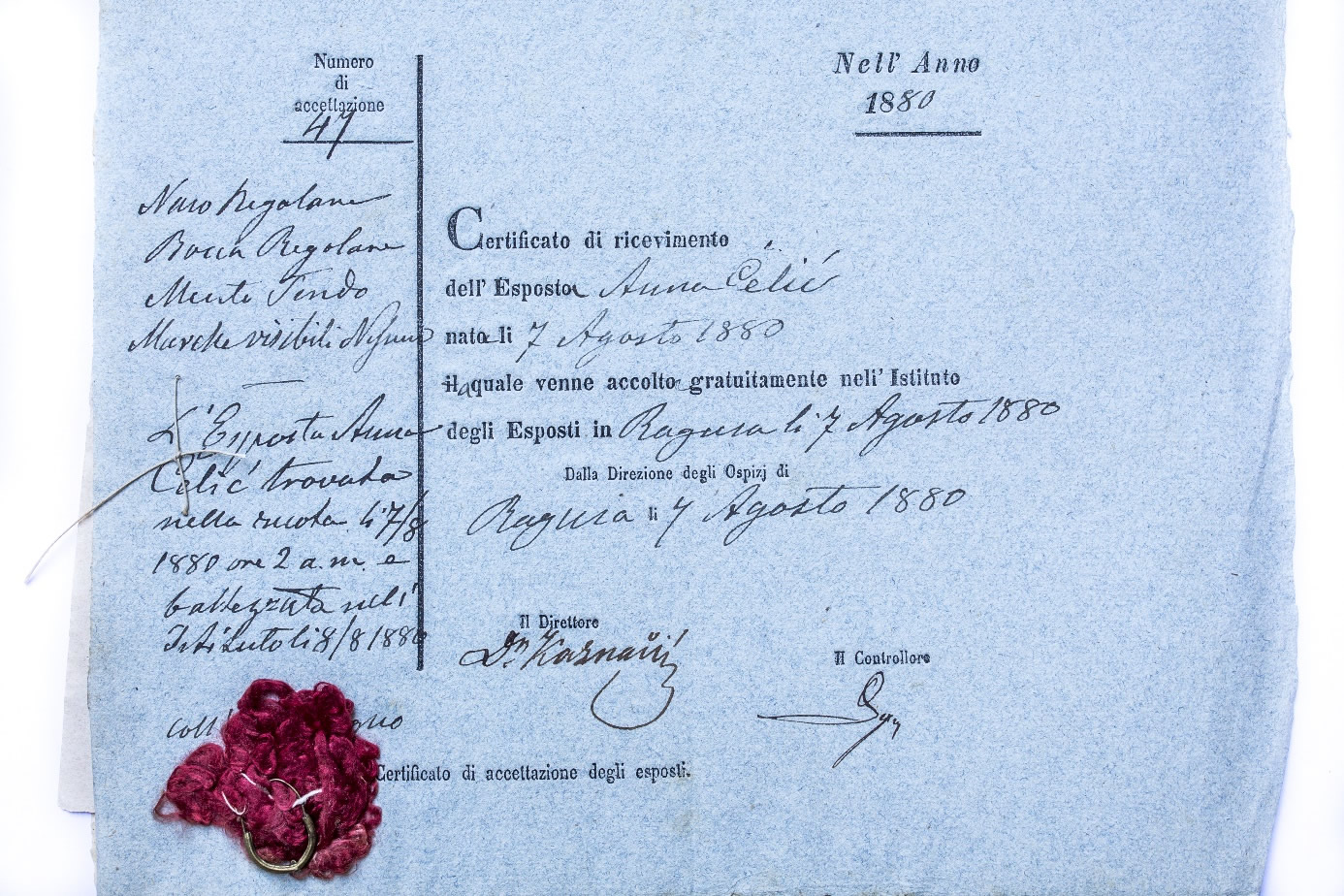 U dosjeima nahočadi dubrovačkog nahodišta, kakav je bio i dosje Ane Čelić, najčešće se, ipak, nalaze samo tri dokumenta pričvršćena špagom: potvrda o primitku, krštenica i potvrda o smrti. Ana je preminula 23. rujna 1880. stara jedan mjesec i 16 dana. Dvije naušnice, jednom razdvojene, nisu više bile uparene.