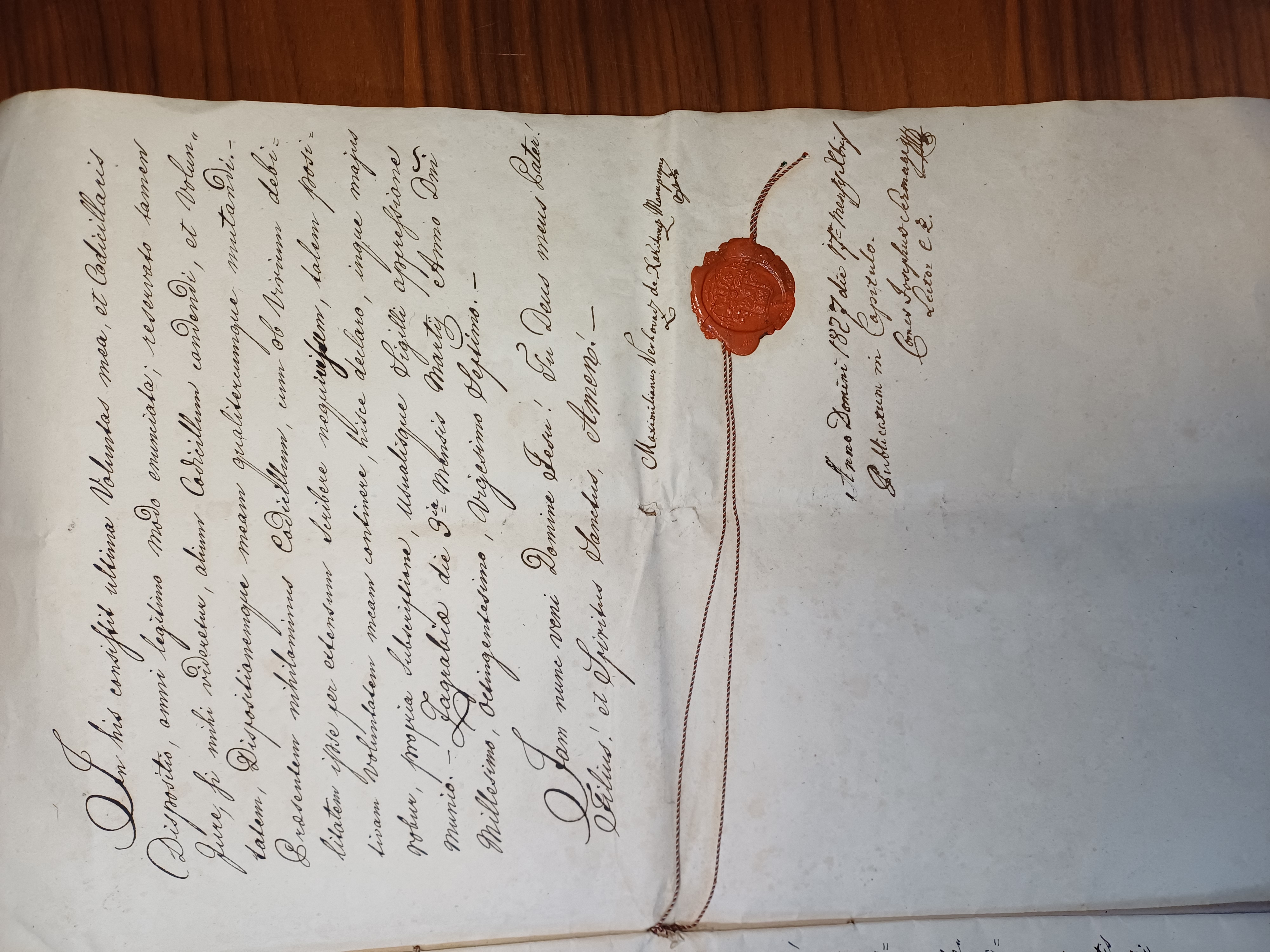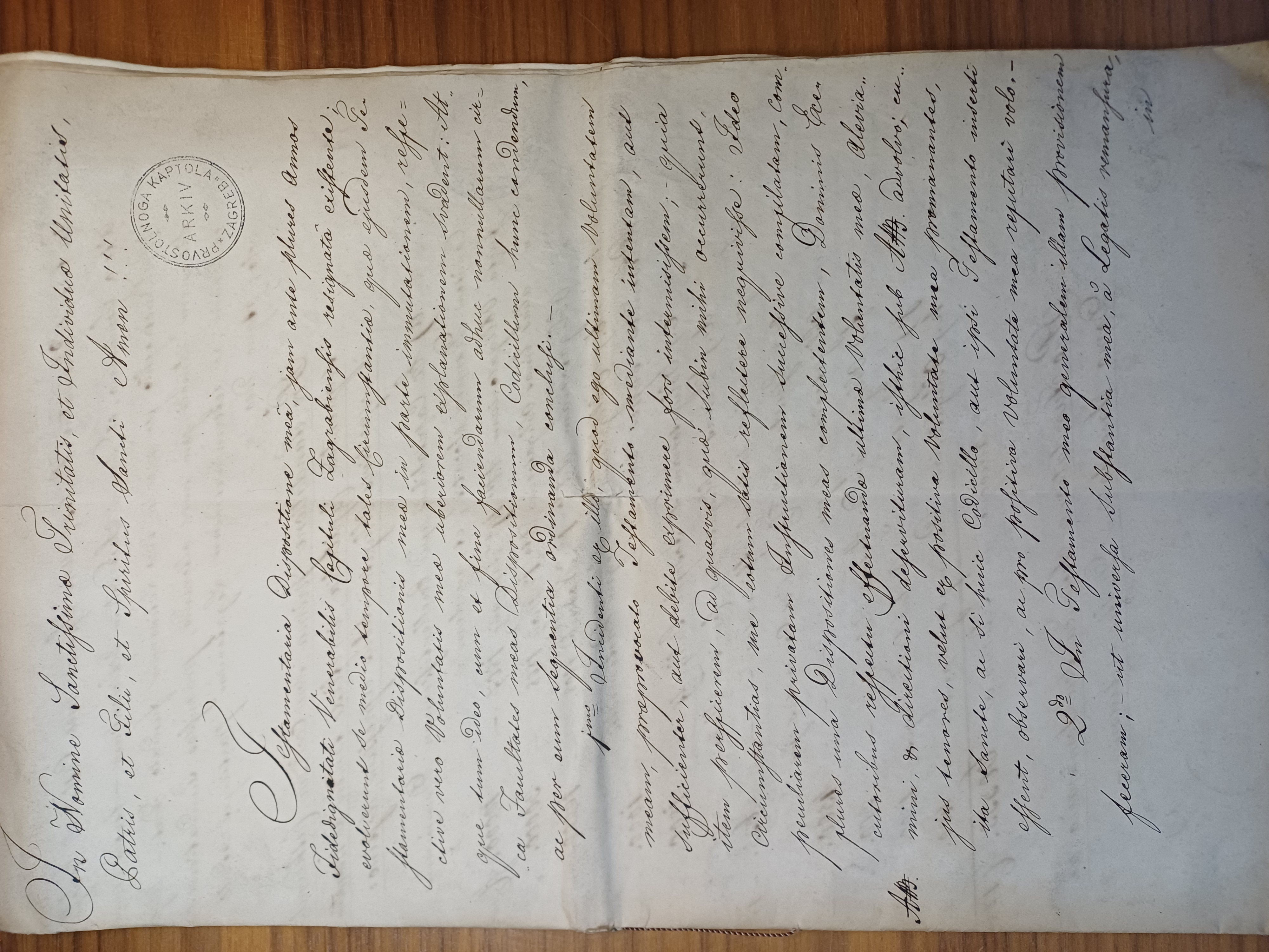 2do) In Testamento meo genaralem illam provisionem feceram: – ut universa supstantia mea, a Legatis remansura, in tres subdividatur partes: – una Sponsae meae Cathedrali Ecclesiae, – altera Seminario et Domui Sacerdotum deficientium, – tertia vero Orphanatrphio per me in Vico Latinorum fundato. Dispositionem idmodi iam nunc alterando, praemissas Fundationes certorum ac determinatorum Legatorum participes reddi volo, atque ideo (…)