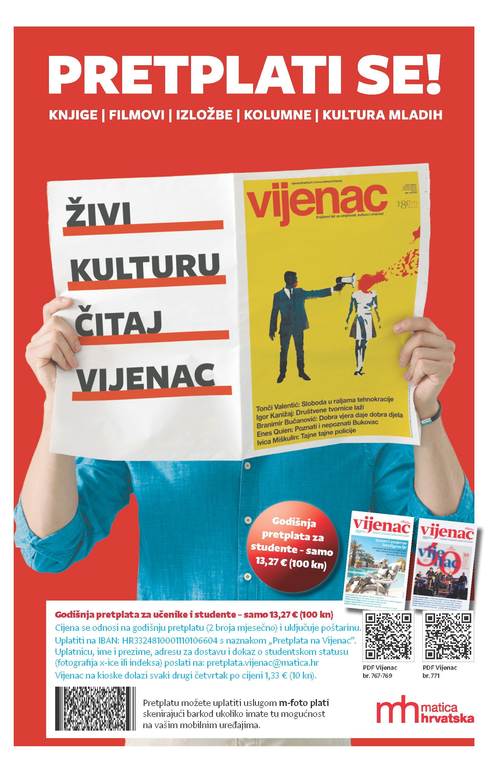 Pretplatu možete uplatiti na IBAN HR3324810001110106604 s naznakom „Pretplata na Vijenac” ili skeniranjem QR koda. Ime i prezime, adresu za dostavu i uplatnicu s dokazom o studentskom statusu pošaljite na: pretplata.vijenac@matica.hr. Ponuda vrijedi do 31. listopada 2023. ili do isteka zaliha.